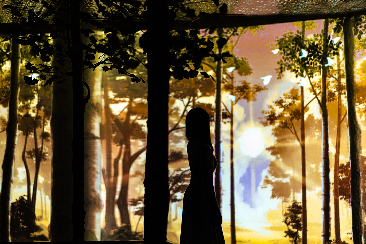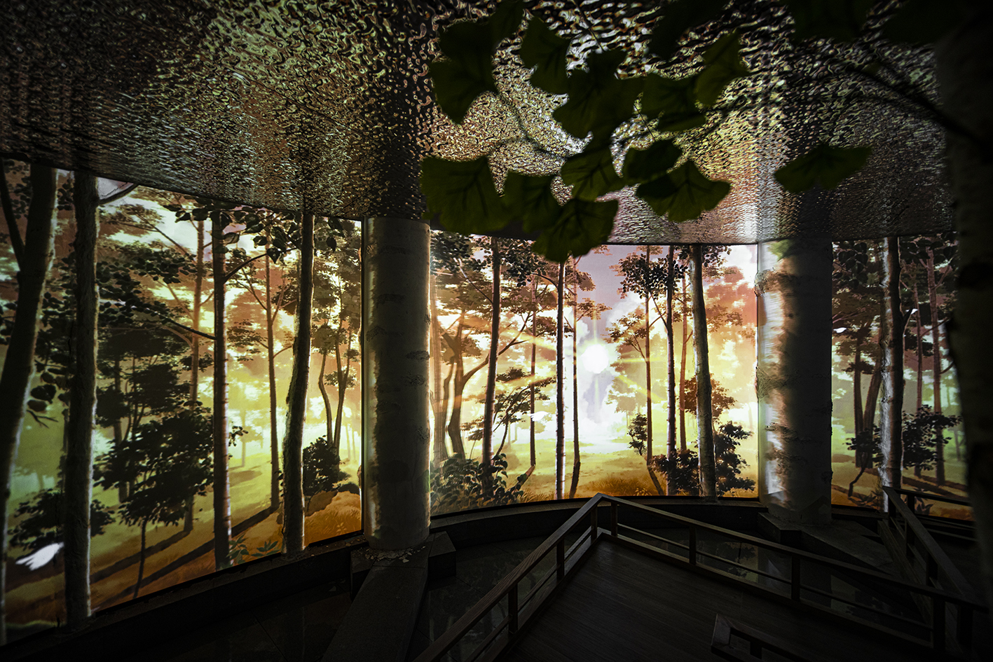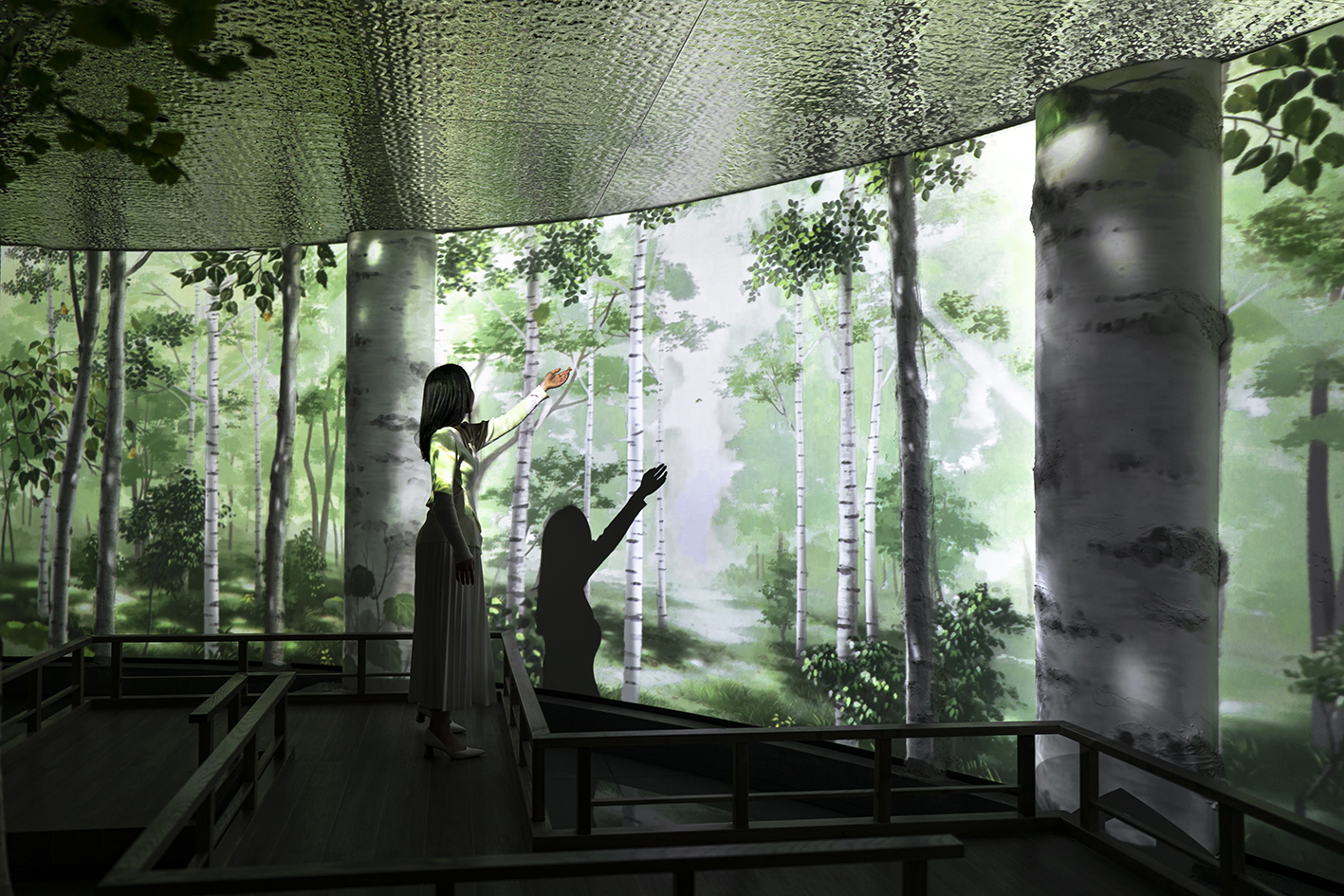 The "Wonderland" is set in a birch grove, portraying the changing nature spectacles of the foggy dawn, the sunshiny noon, and the charming night. Examining the interior, CTLAB designed a curved wall for projection. The wall embeds two conspicuous columns and several fabricated embossings, which are turned into foreground birches when the projection is on. Combined with the real birches scattered in the space, an immersive forest environment arousing the yearning for ideal life is established. Moreover, when people walk on the winding bridge built in the front of the wall, different little lives will emerge. As the sun rises from the other end of the horizon, birds will greet the early riser with their chirps; as the sunlight pierces through the leaves, butterflies will welcome the explorer with their dance; as the moon climbs up the branch, fireflies will guide the home-comer with their shimmer.