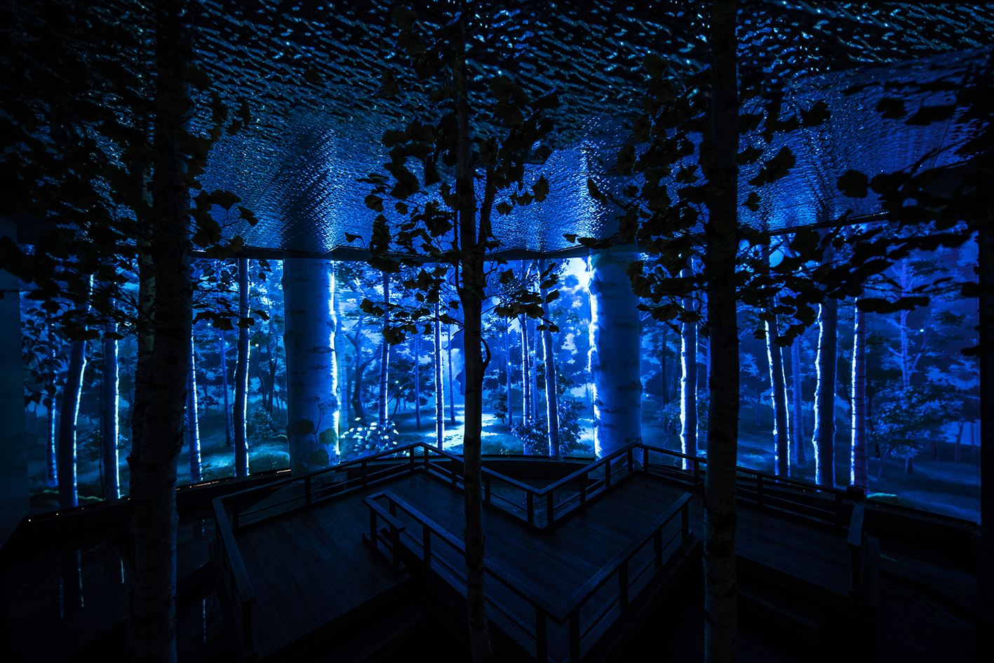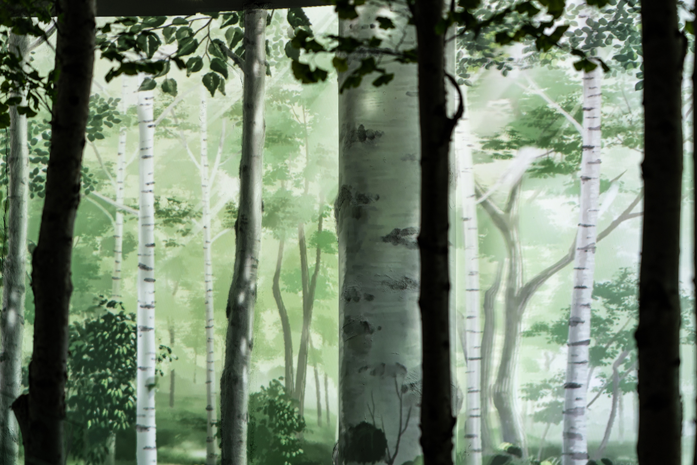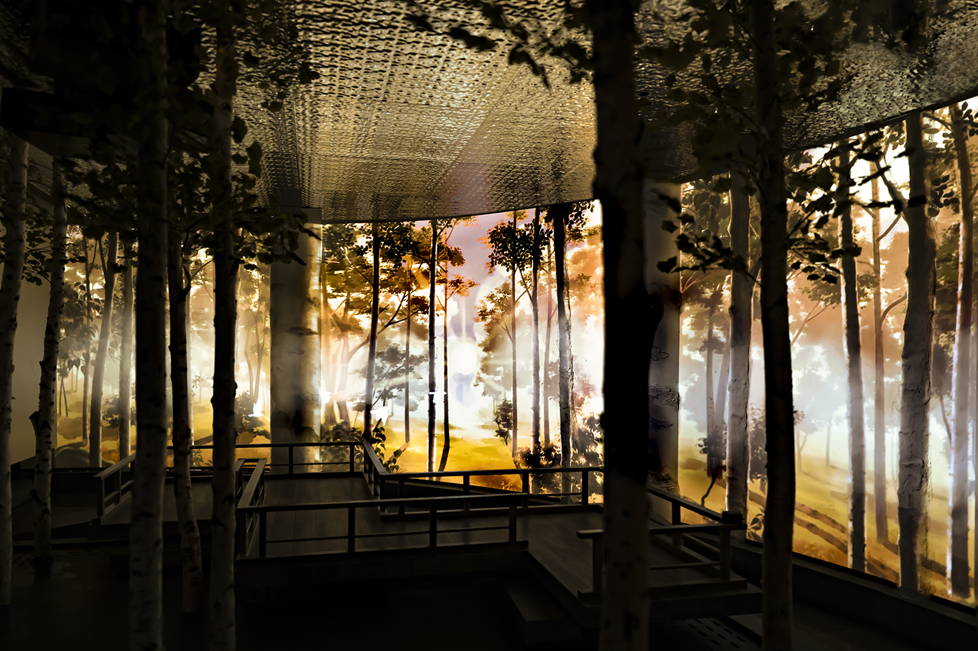 The "Wonderland" is set in a birch grove, portraying the changing nature spectacles of the foggy dawn, the sunshiny noon, and the charming night. Examining the interior, CTLAB designed a curved wall for projection. The wall embeds two conspicuous columns and several fabricated embossings, which are turned into foreground birches when the projection is on. Combined with the real birches scattered in the space, an immersive forest environment arousing the yearning for ideal life is established. Moreover, when people walk on the winding bridge built in the front of the wall, different little lives will emerge. As the sun rises from the other end of the horizon, birds will greet the early riser with their chirps; as the sunlight pierces through the leaves, butterflies will welcome the explorer with their dance; as the moon climbs up the branch, fireflies will guide the home-comer with their shimmer.