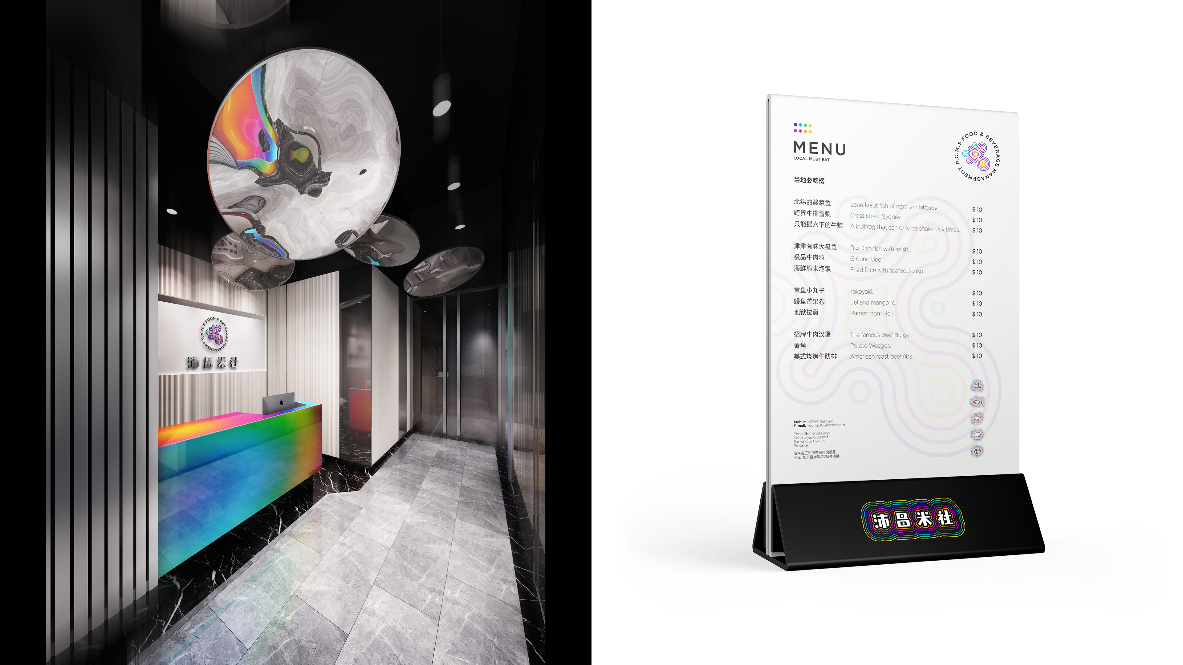 Copious colors integrated in modern minimalism design is harmonious and it abstractly shows the dramatic scenarios of the cooperation and independent existence of water and oil. Besides, the design displays the idea of encouraging integration but not compulsory, which communicates the precedent 4C values of copious, creative, catering and cooperation as an innovator and manager in catering industry.