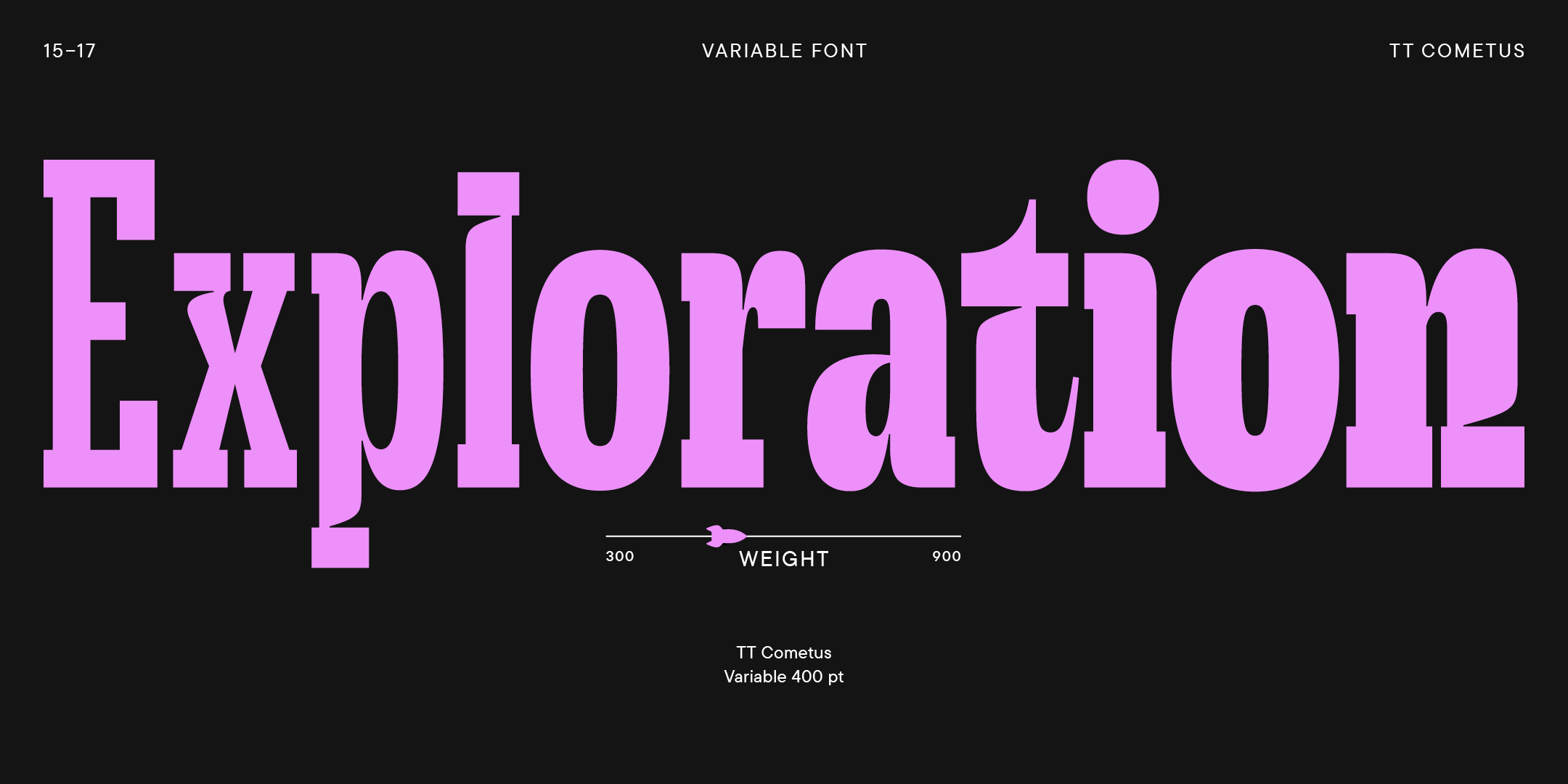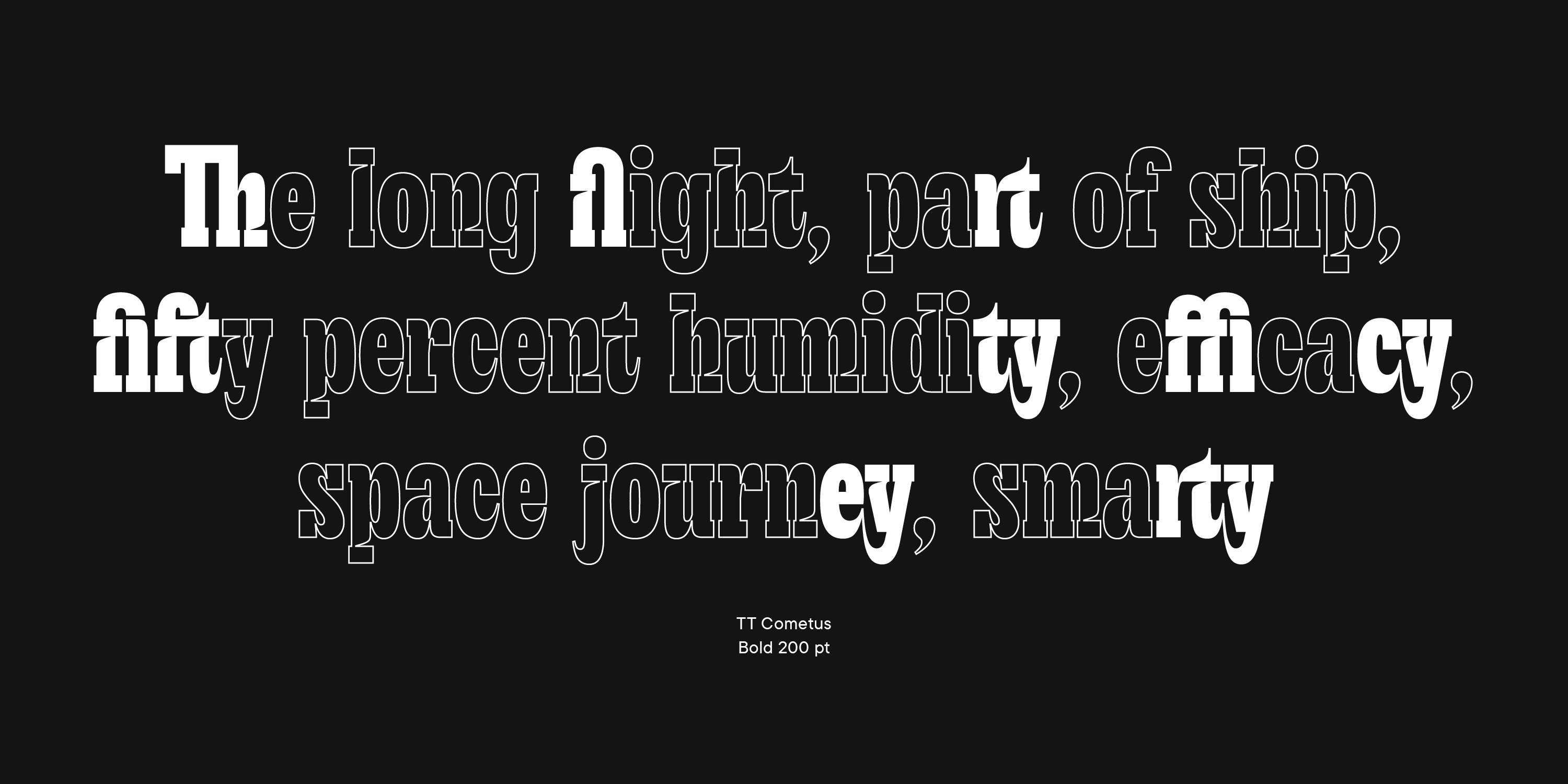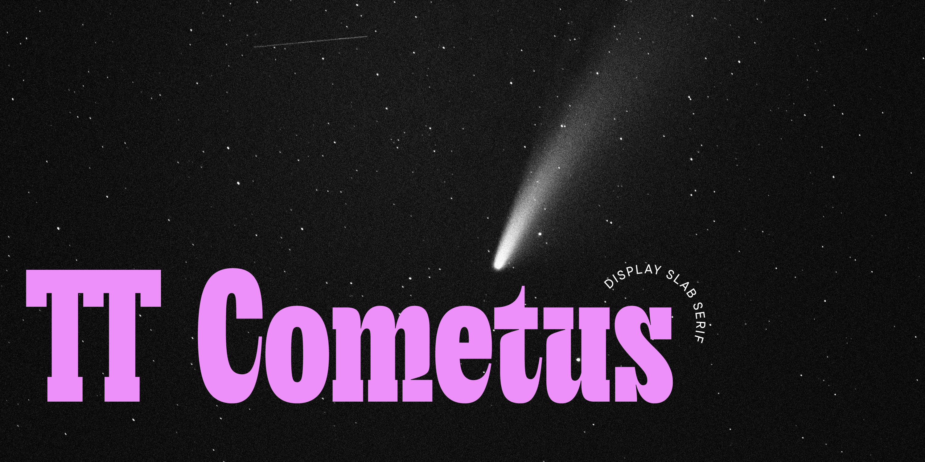 TT Cometus is a modern slab—impressive and sturdy but energetic and dynamic at the same time. The idea behind this font was to design a narrow display slab serif. We aimed to keep the heavy serifs typical for slabs while also giving the font a modern and dynamic look. To achieve this, we combined sturdy details with completely opposite shapes, added a handmade feel, and drew inspiration from brush movements in calligraphy. The typeface's name evokes the image of a comet—a powerful and weighty celestial body with a beautiful tail slicing through space at an incredible speed. This is a key to understanding the font's nature and personality.