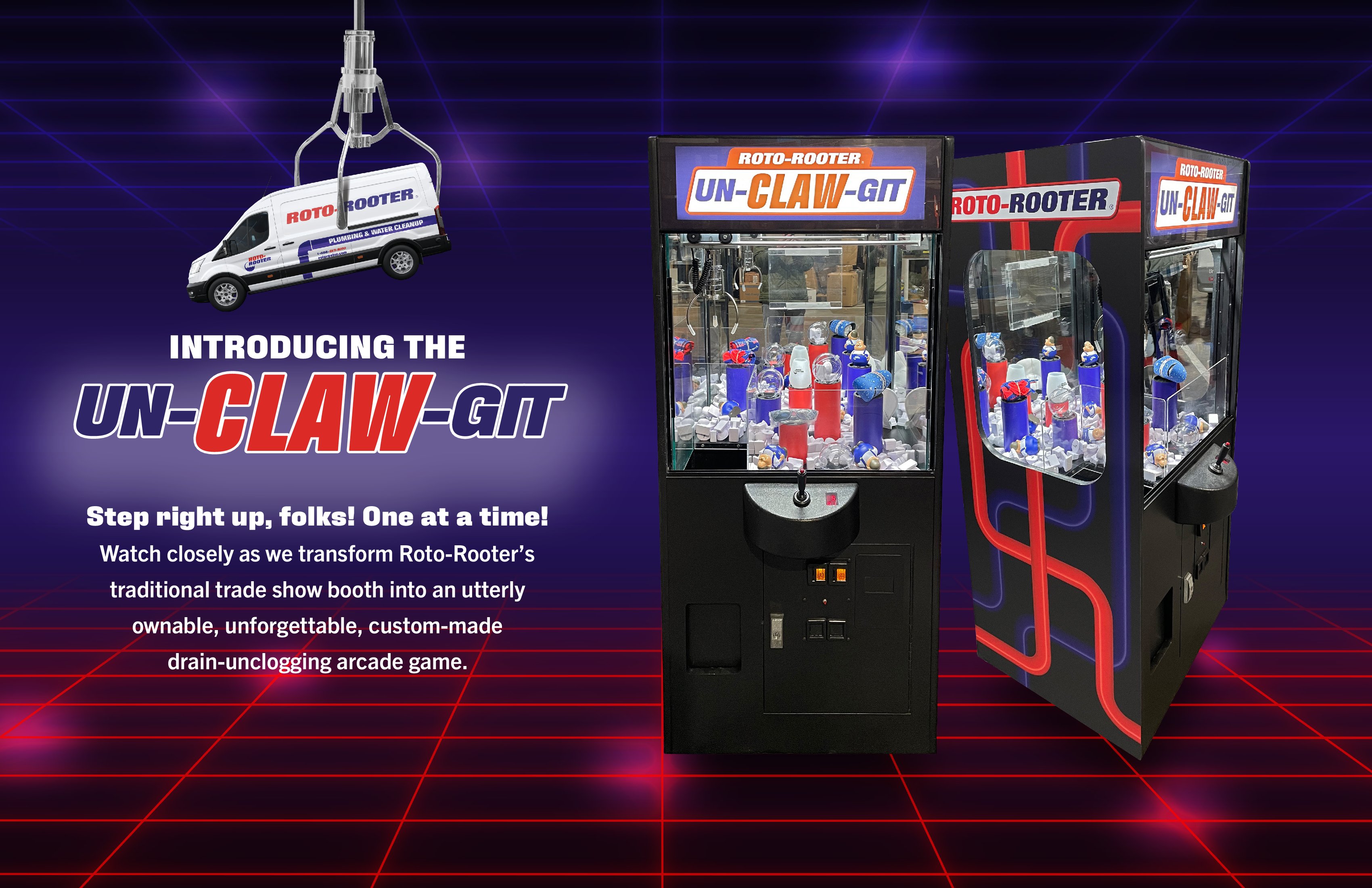 The Un-Claw-Git takes a traditional Claw game like you’d find at any arcade and turns it into a plumbing repair challenge. Working with a gaming partner, we stripped down vintage machines and built them back up again from scratch as Roto-Rooter Un-Claw-Gits. The prizes visitors plumb for all resemble real life clog culprits. Better yet, the tokens the machine takes to operate, give Roto-Rooter’s trade show personnel the perfect conversation starter – handing out coins all over the convention center to draw people to the booth.
