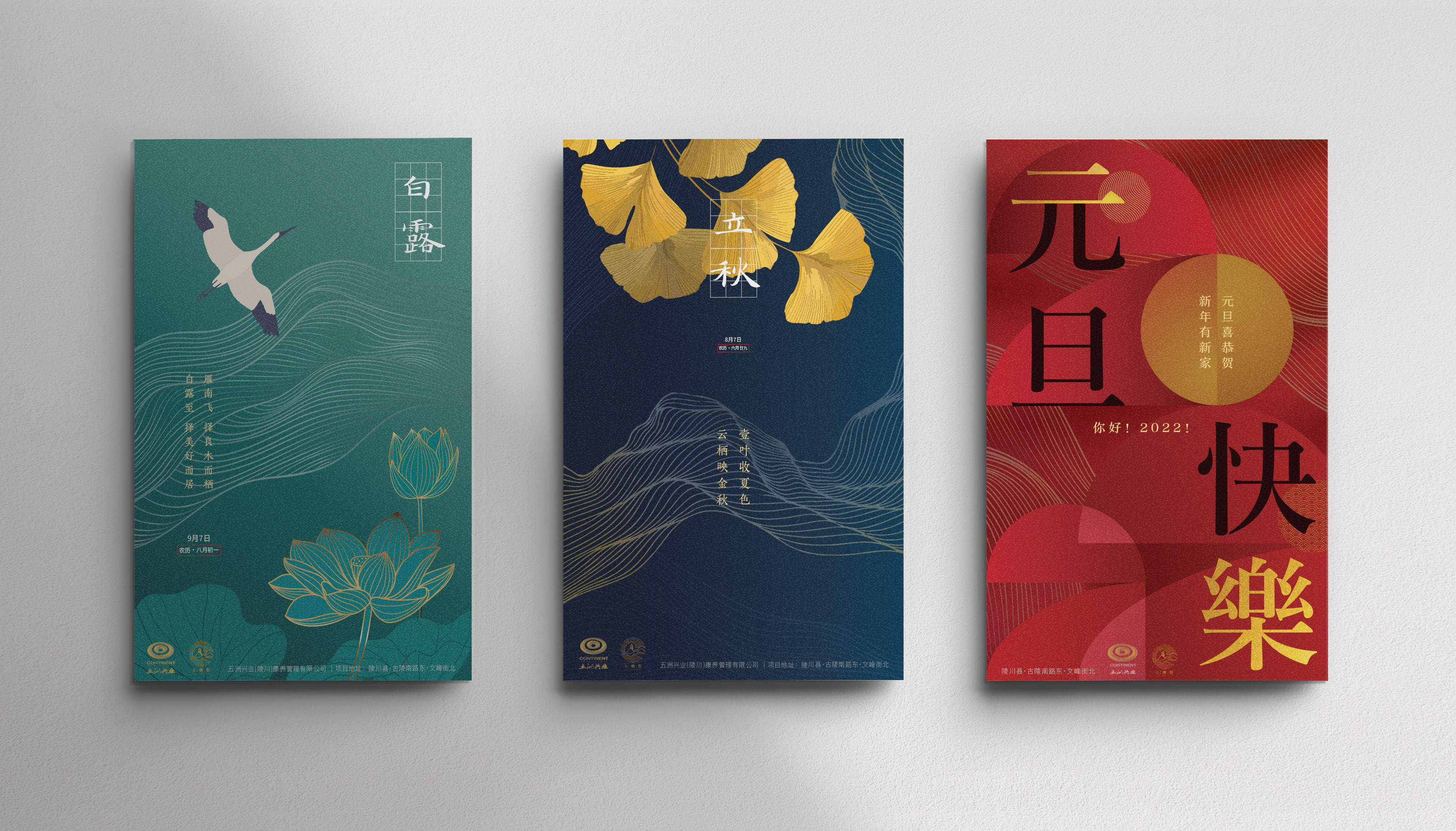 Consistency in visual representation is paramount across all facets of the brand identity. The visual concept consistently underpins the corporate identity. The client seeks to release a distinctive poster for each of the twelve solar terms and to plan promotional activities around selected holidays strategically. Therefore, the solar term posters have become a highlight of this design, allowing for more flexible expression with elements such as flowing clouds, wild cranes, lotus flowers, and ginkgo leaves—each symbolizing the characteristics of the solar terms and seasons. These elements are seamlessly integrated into each unique poster, delivering comfort and blessings to potential clients while reinforcing the upscale positioning of the real estate project.