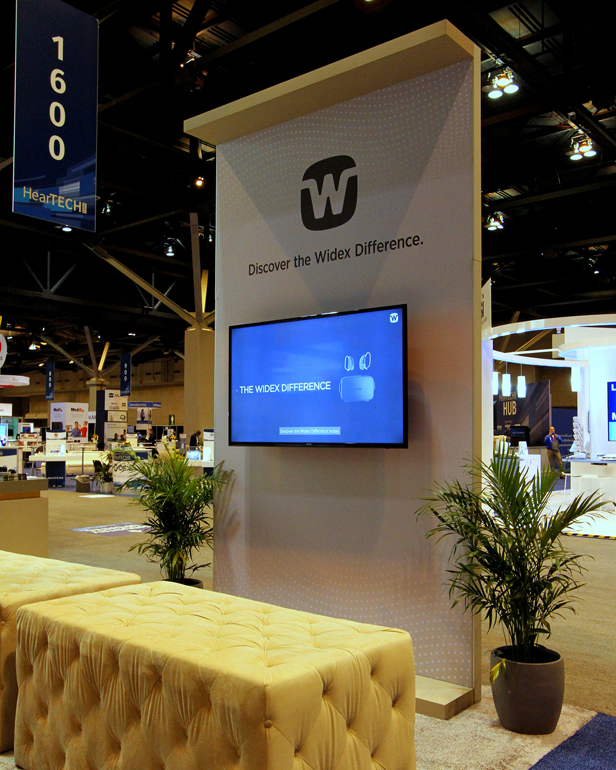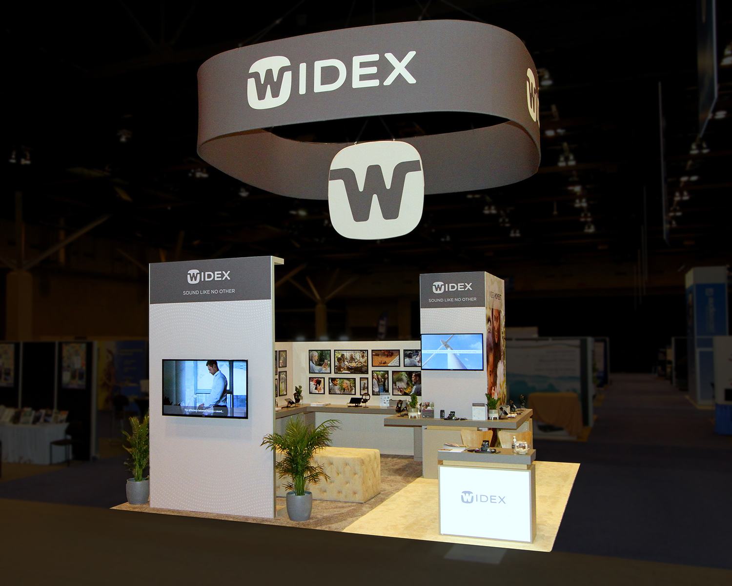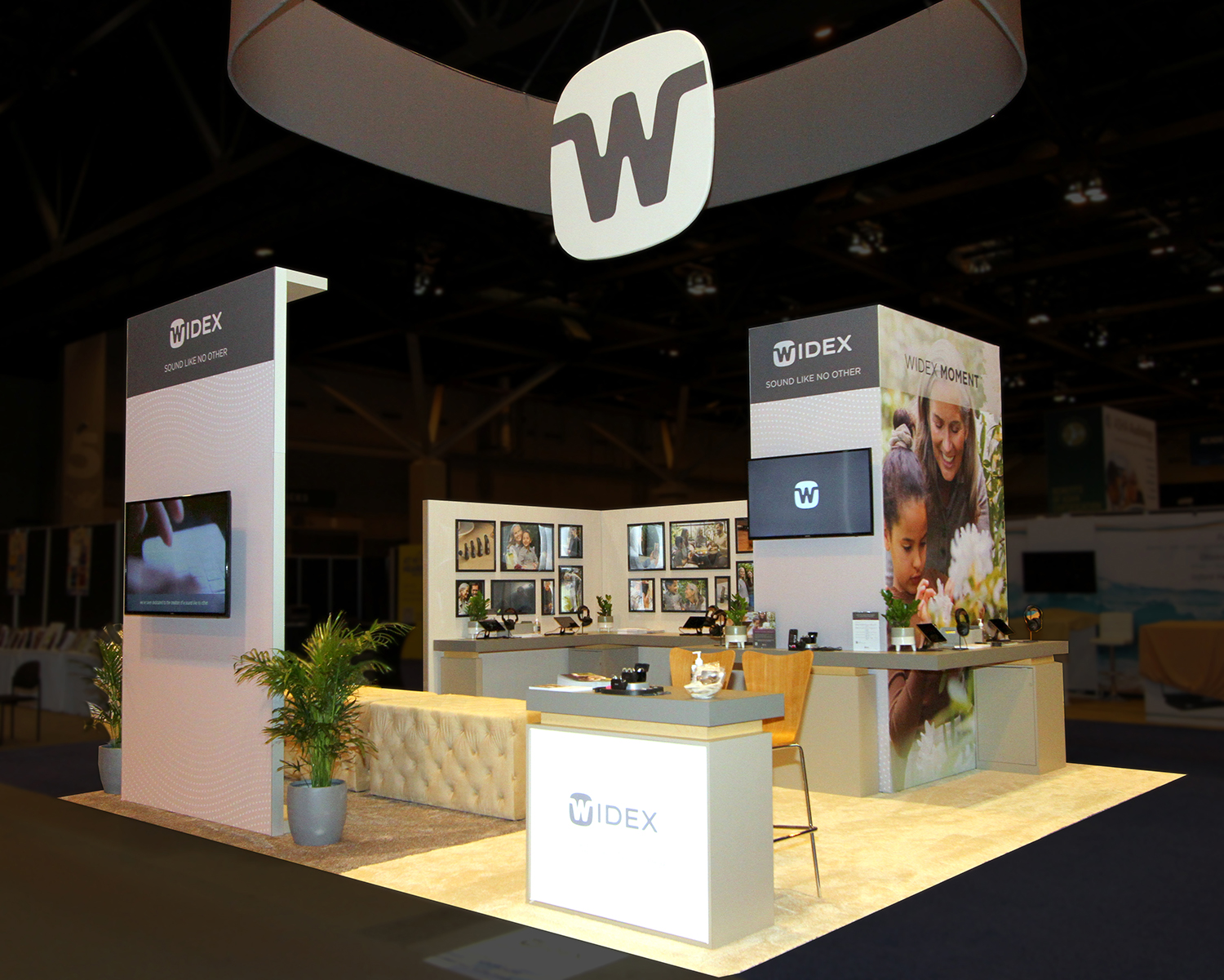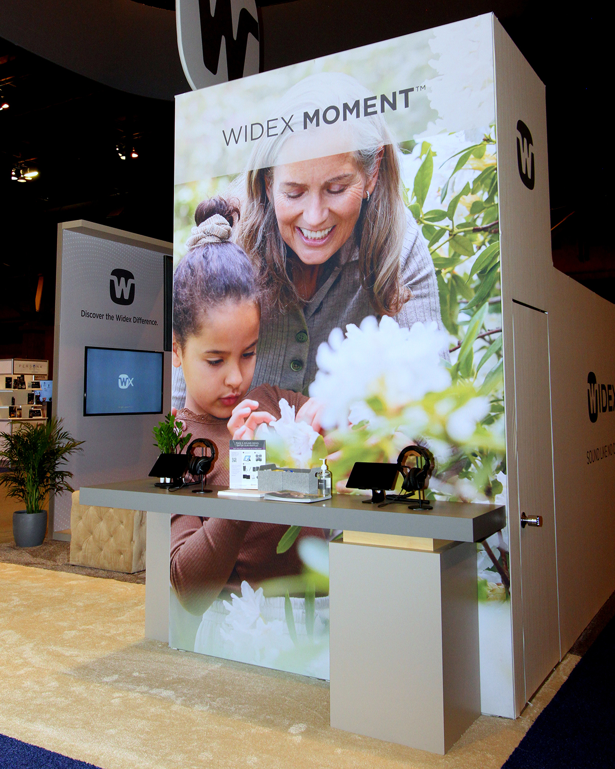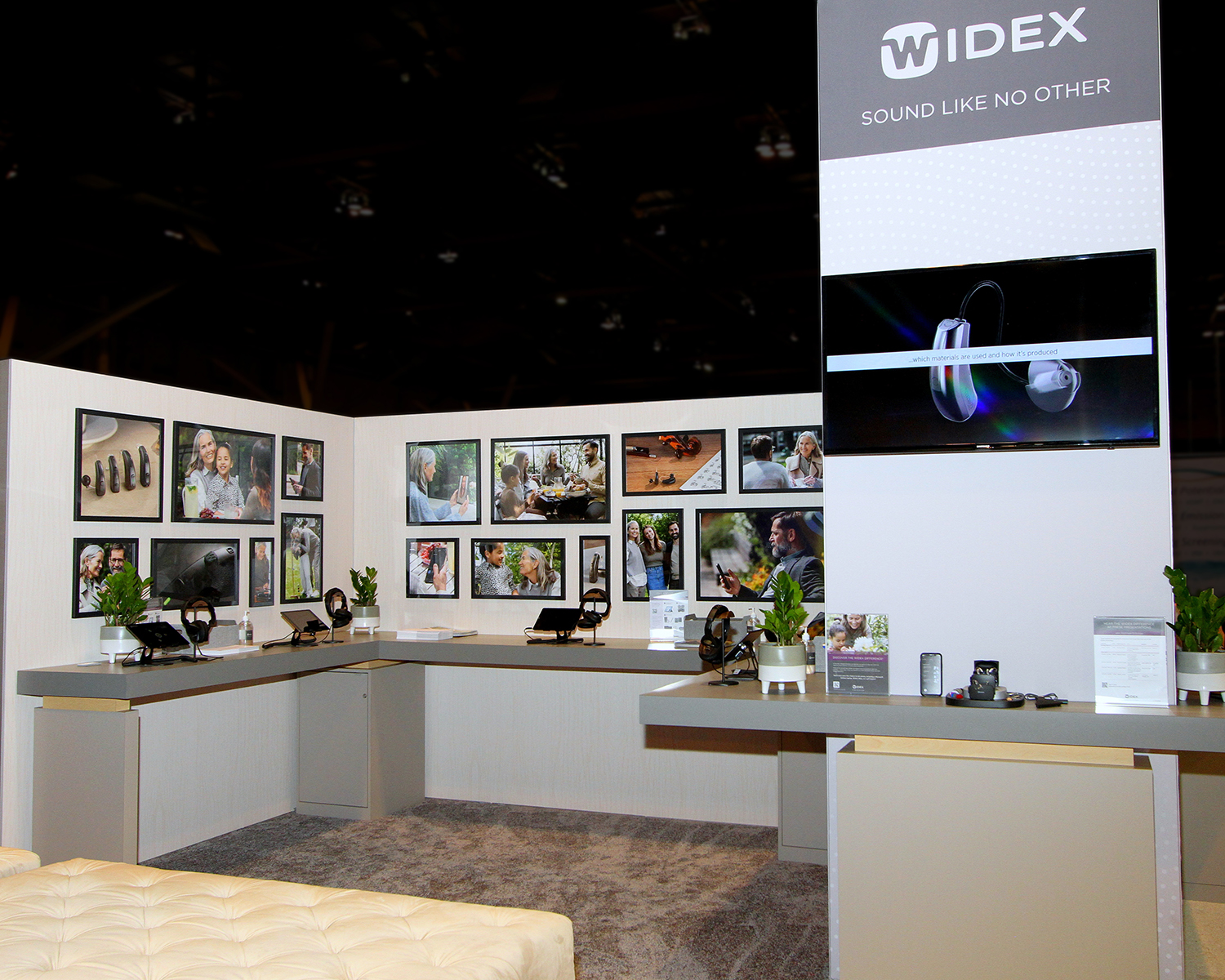 The design brief required us to closely replicate the luxurious Widex retail store experience in a compact, budget-oriented booth space. We were also asked to provide as many product demo stations as possible with ample spacing between so attendees can feel safe.