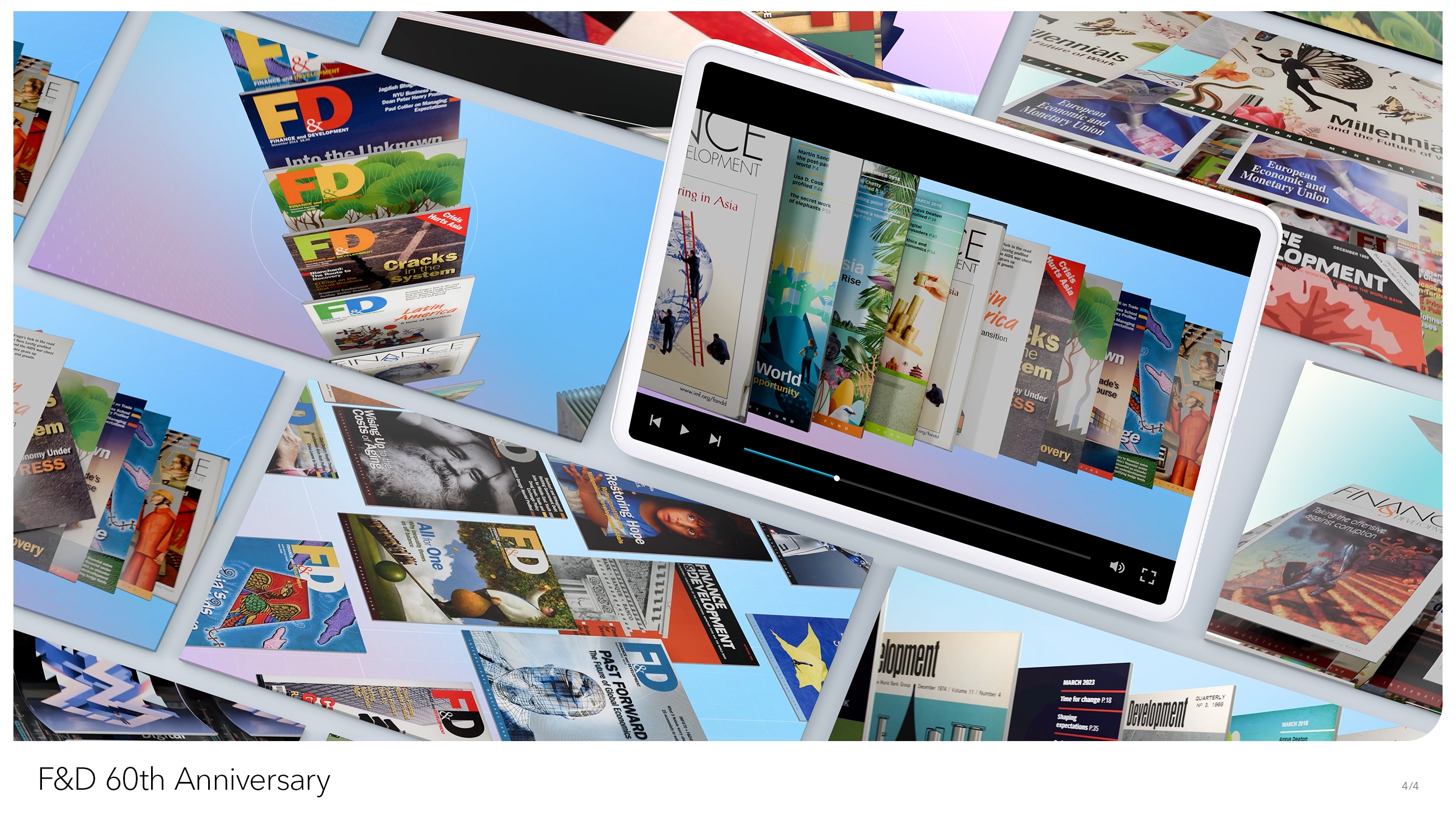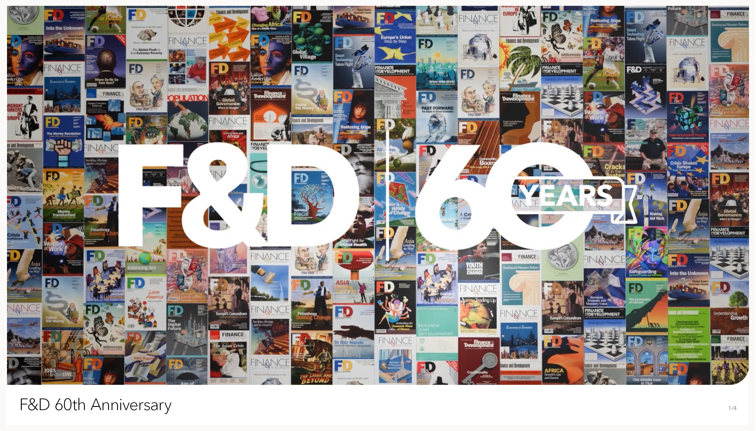 For 60 years, the IMF’s flagship journal has been bringing the latest in economic and financial analysis and insights to a global audience. In a world of dry charts, bandied figures, and bland white papers, Finance & Development (F&D) has long succeeded in standing above the rest in offering a wider audience entrée into the world of finance and economics. To celebrate six decades of leading the conversation, F&D has adopted a branding featuring the covers of every issue going back to 1964. For an accompanying video to announce the anniversary, we imagined the full array of issues celebrating decades of cutting-edge financial discussion.