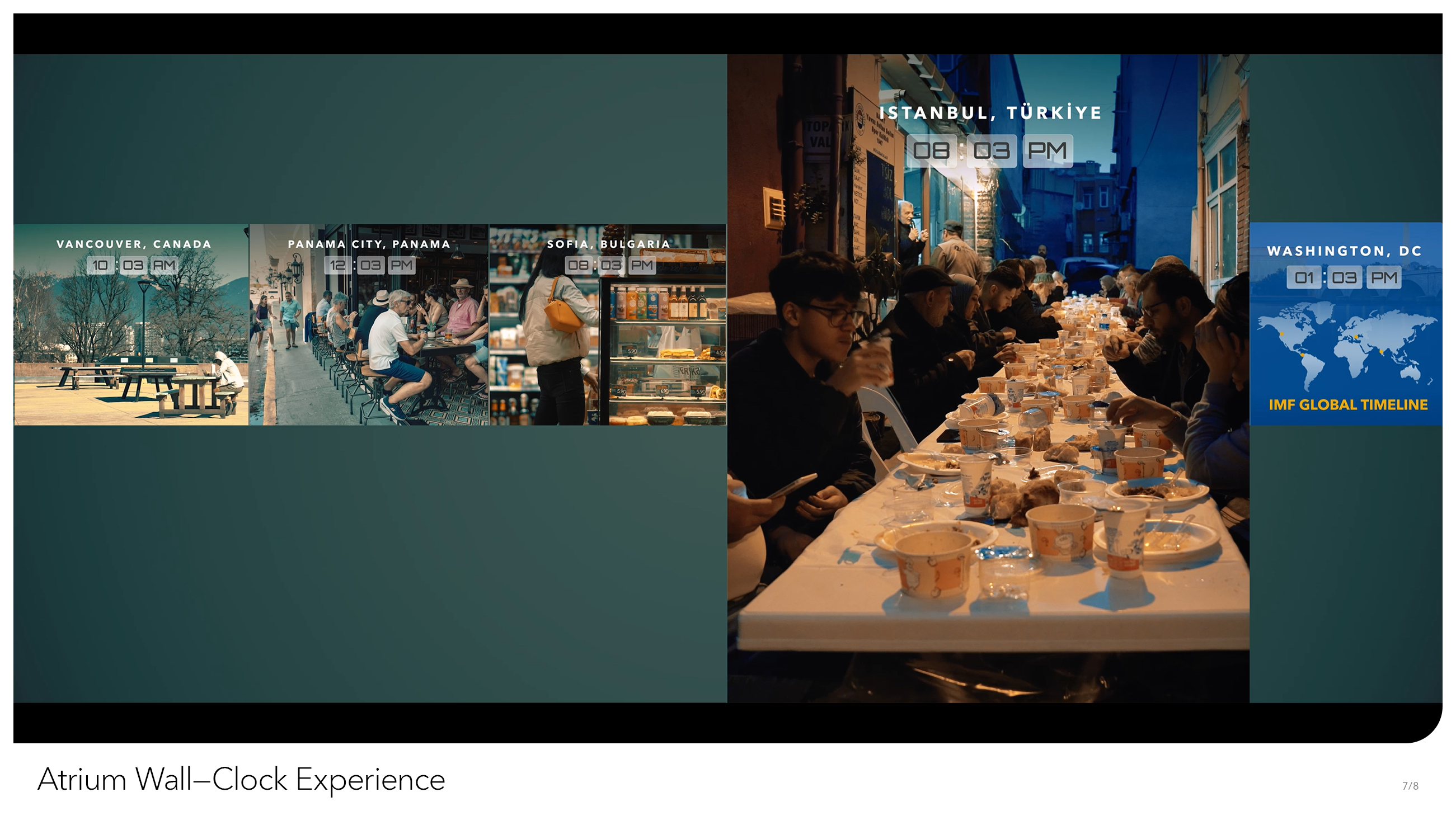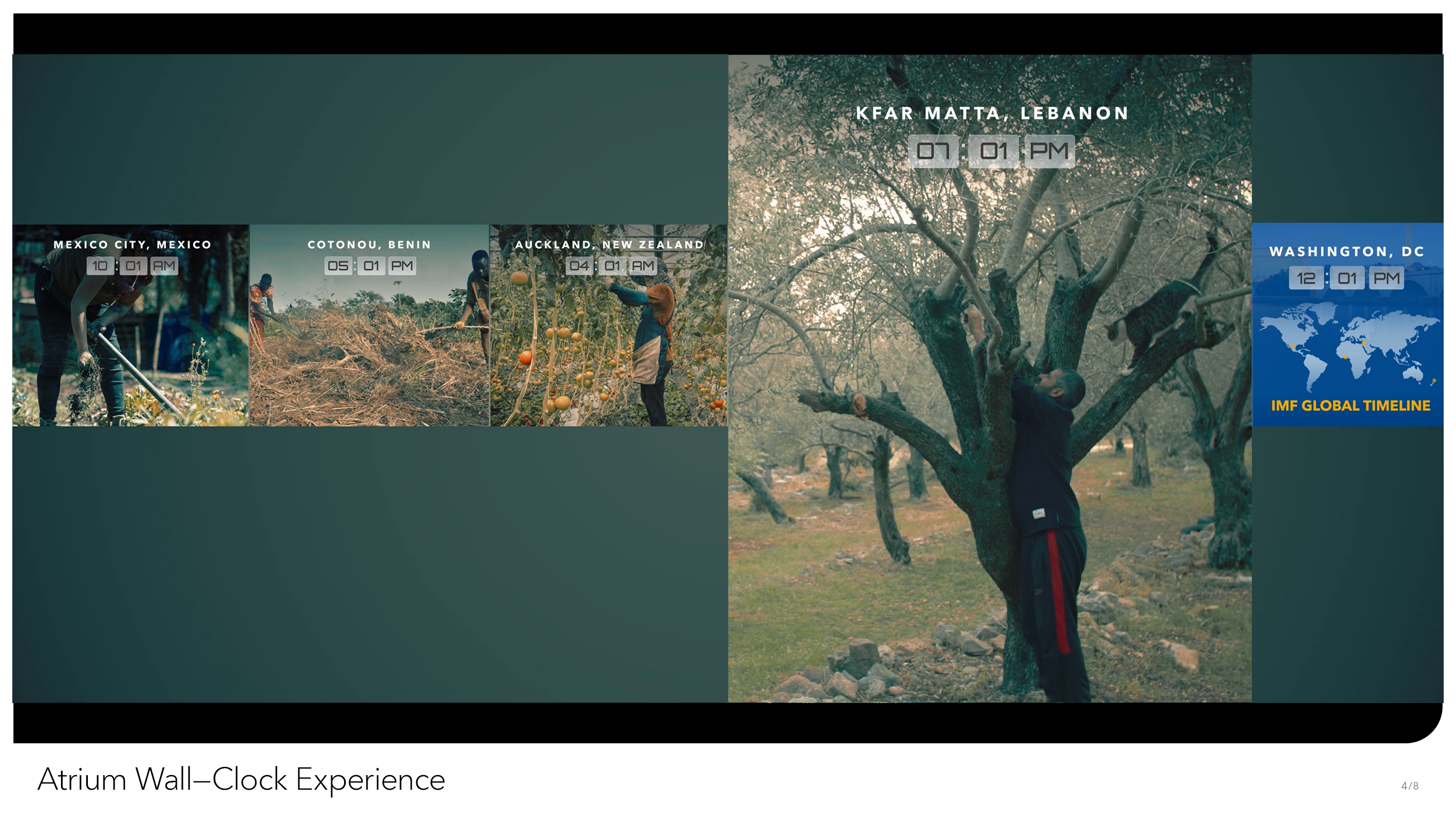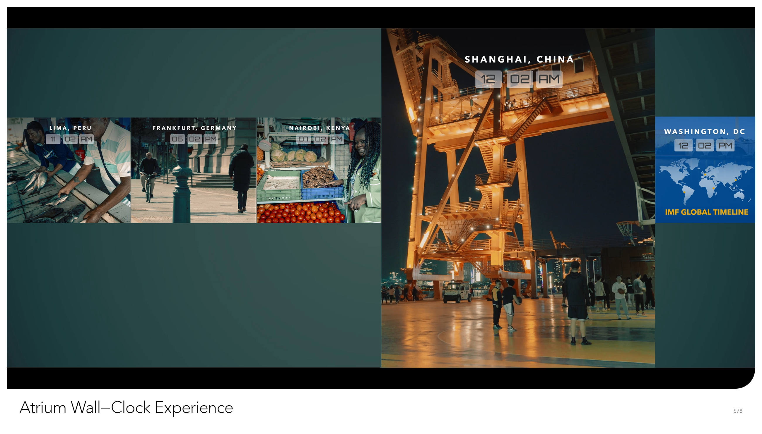 From the outside, IMF Headquarters is yet another brutalist block in Northwest Washington, DC. But inside, we’re a dynamic multilateral institution, providing support for 190 member countries, with a dedicated staff doing work of global consequence. We at Creative Solutions wanted to see the grand scope of our work reflected somehow in our building. That desire gave birth to the Atrium World Clock, an hourly video sequence that plays out on the two-story video wall of our interior Atrium, facing the entrance of IMF HQ. Every hour, on the hour, the wall – visible from nearly every floor in the building – displays a split screen view of economic life, set to play in synchronization with the time of day it was filmed. Composed on a short timeline and with a miniscule budget, our producers commissioned freelance videographers from 27 countries to film multiple scenes representative of not just wealth and prosperity, but of true-to-life economic scenes playing out in (relatively) real-time. From the hustle and bustle of Mumbai’s street markets to London’s towering central business district, the World Clock takes us on a 24-hour journey through how the world does business. Over time, we hope to keep the World Clock as a living project that will be updated regularly to include all 190 IMF member states.