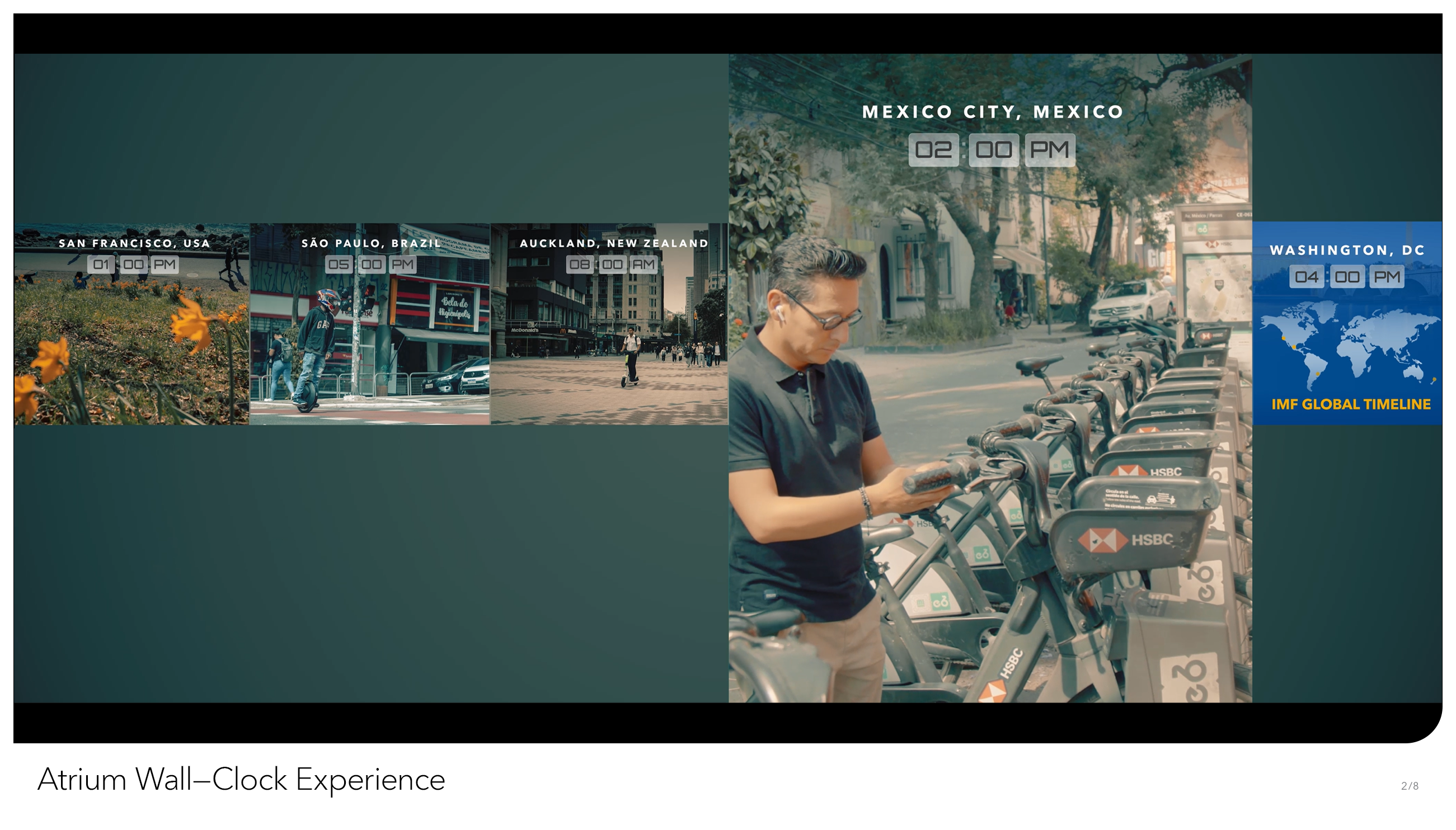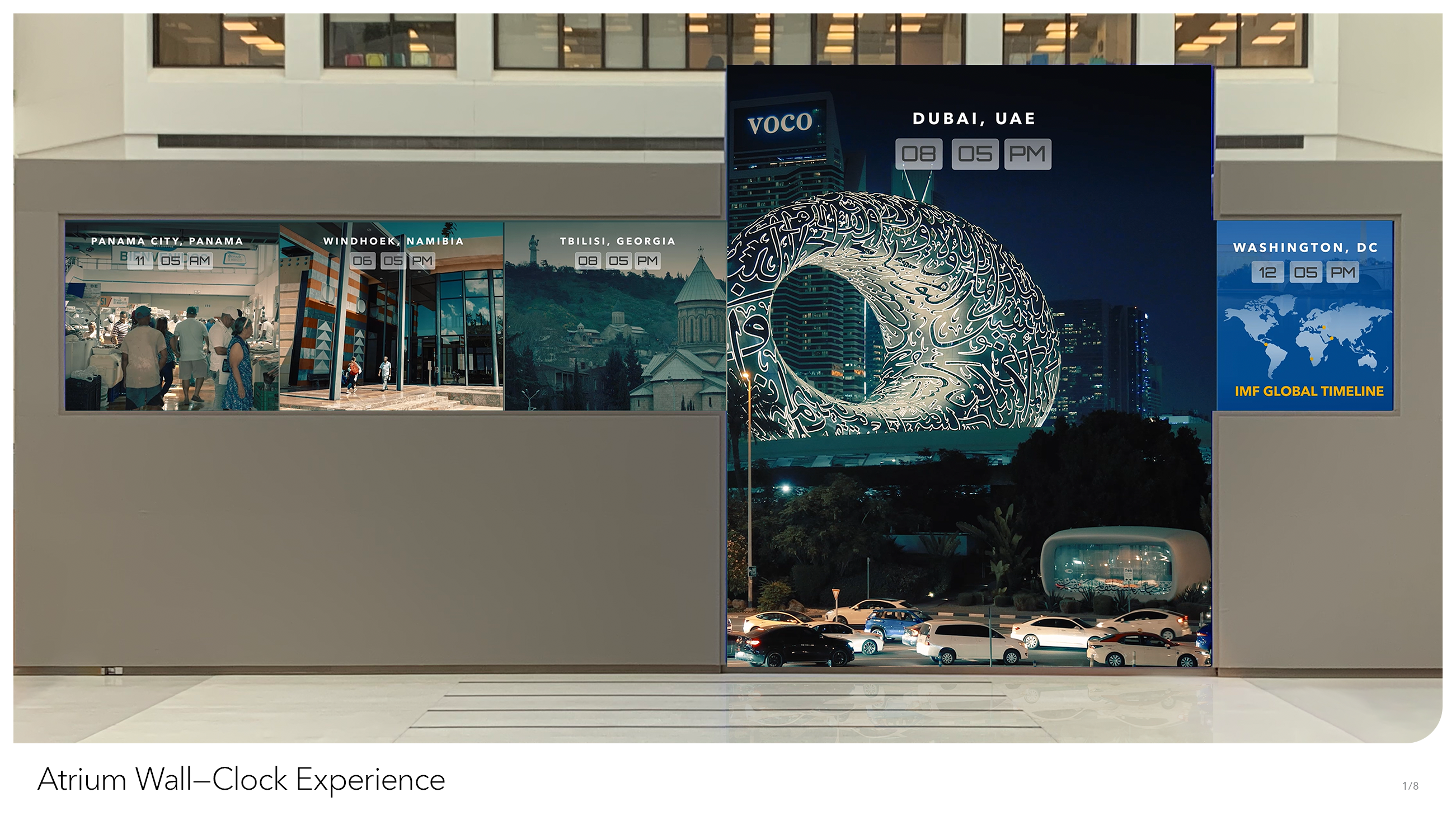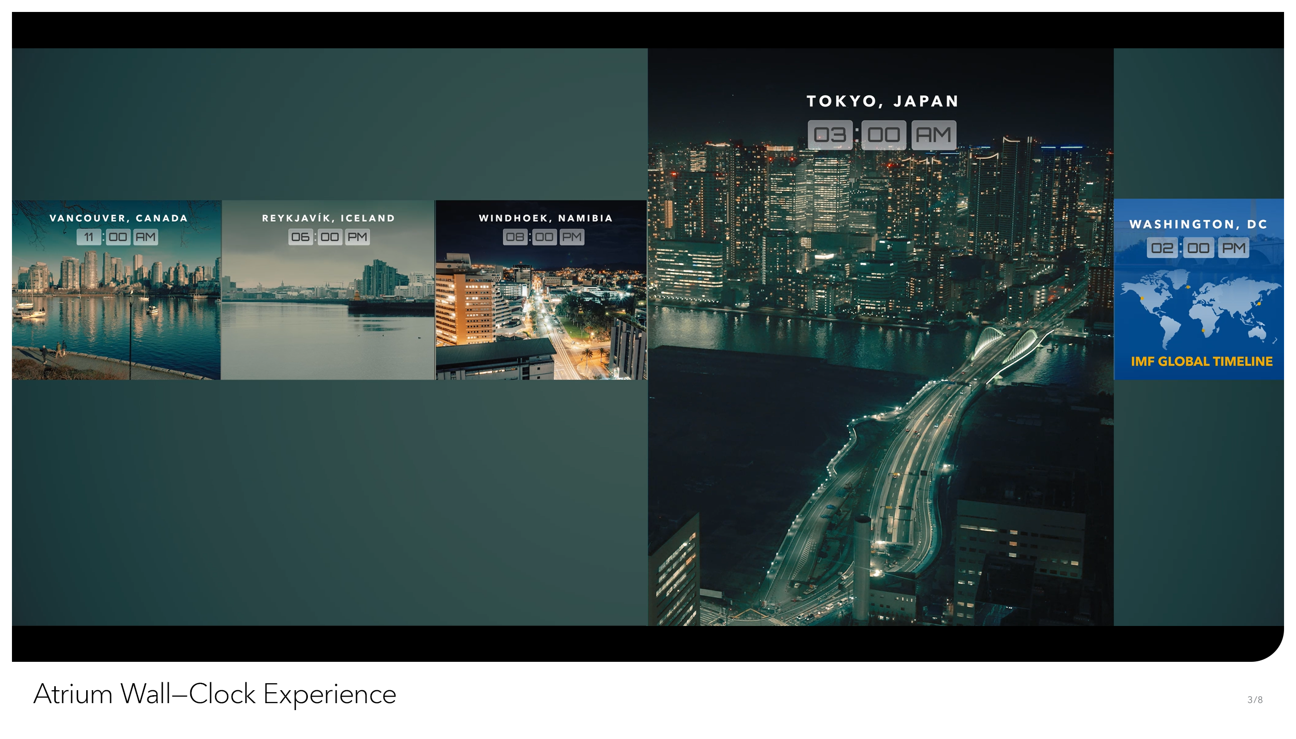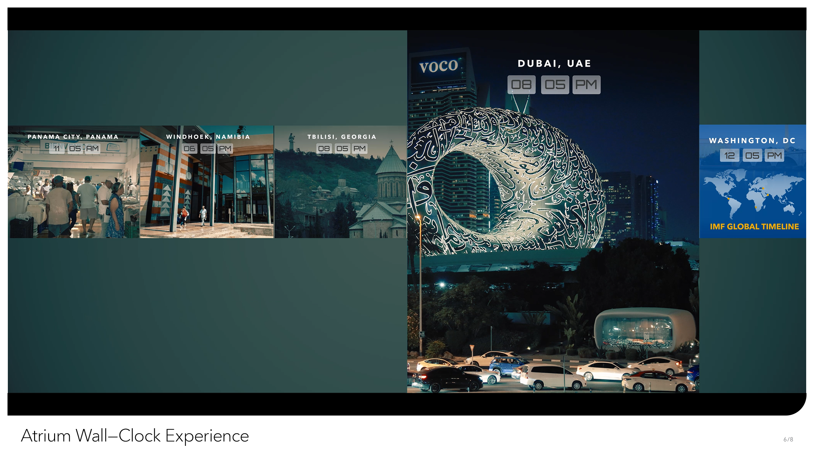 From the outside, IMF Headquarters is yet another brutalist block in Northwest Washington, DC. But inside, we’re a dynamic multilateral institution, providing support for 190 member countries, with a dedicated staff doing work of global consequence. We at Creative Solutions wanted to see the grand scope of our work reflected somehow in our building. That desire gave birth to the Atrium World Clock, an hourly video sequence that plays out on the two-story video wall of our interior Atrium, facing the entrance of IMF HQ. Every hour, on the hour, the wall – visible from nearly every floor in the building – displays a split screen view of economic life, set to play in synchronization with the time of day it was filmed. Composed on a short timeline and with a miniscule budget, our producers commissioned freelance videographers from 27 countries to film multiple scenes representative of not just wealth and prosperity, but of true-to-life economic scenes playing out in (relatively) real-time. From the hustle and bustle of Mumbai’s street markets to London’s towering central business district, the World Clock takes us on a 24-hour journey through how the world does business. Over time, we hope to keep the World Clock as a living project that will be updated regularly to include all 190 IMF member states.