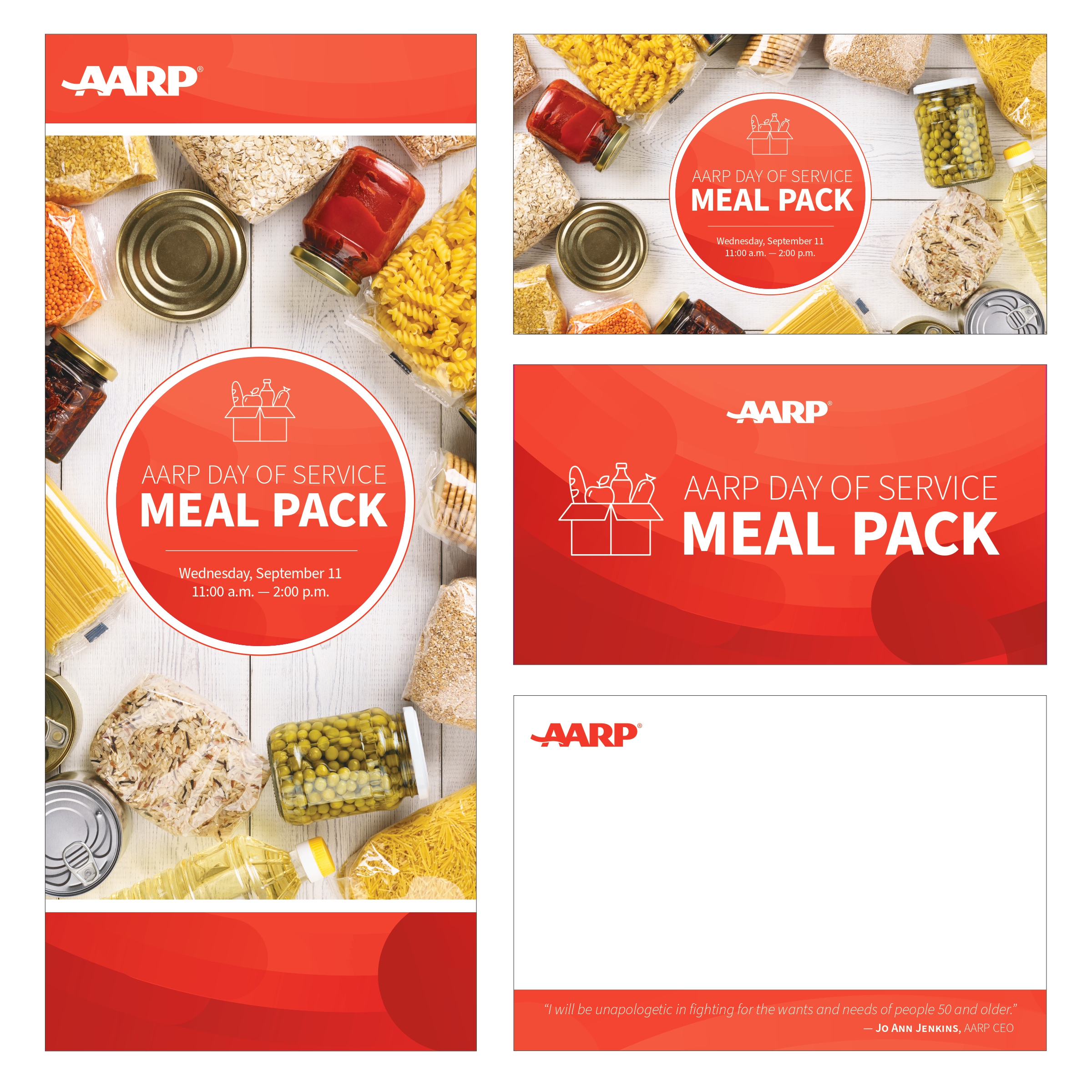 Materials created to promote AARP's 2024 Day of Service Meal Pack event to internal audiences 9/11/2024, including table and note cards for the staff cafeteria.