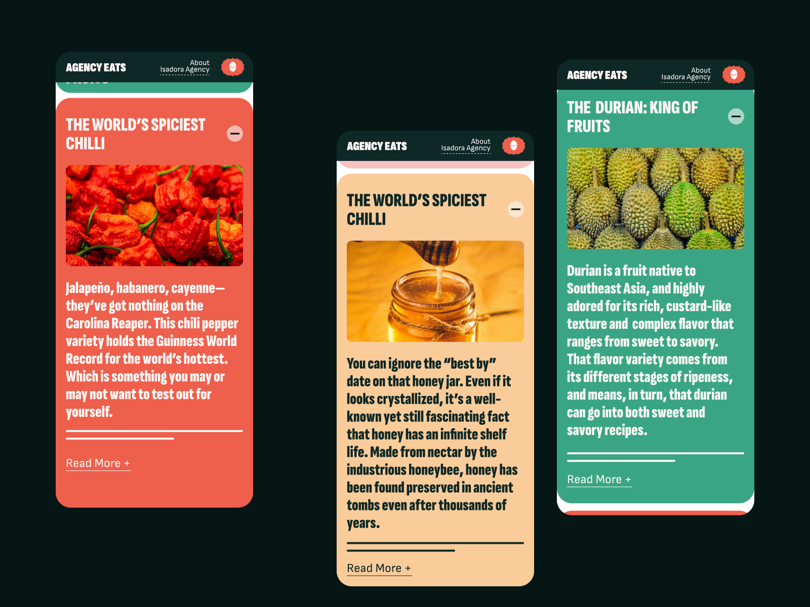 AgencyEats is a vibrant, interactive microsite designed to showcase Isadora Digital Agency's creative approach to user experience and digital design. The site serves as a playful yet informative exploration of how creativity, strategy, and innovation intersect in the agency's work, featuring delightful animations and engaging storytelling to highlight its expertise in crafting unique digital experiences.