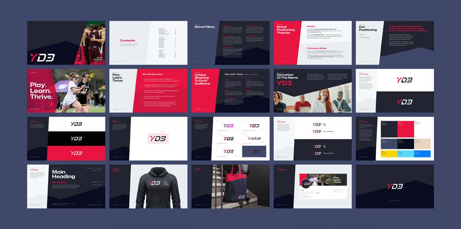 One of our key breakthroughs was the creation of the positioning “Play. Learn. Thrive.” which highlight the integration of athletic competition, intellectual development, and personal flourishing. Alongside these, we developed a flexible design system that blends athletic dynamism with academic sophistication, appealing to YD3’s diverse audiences.