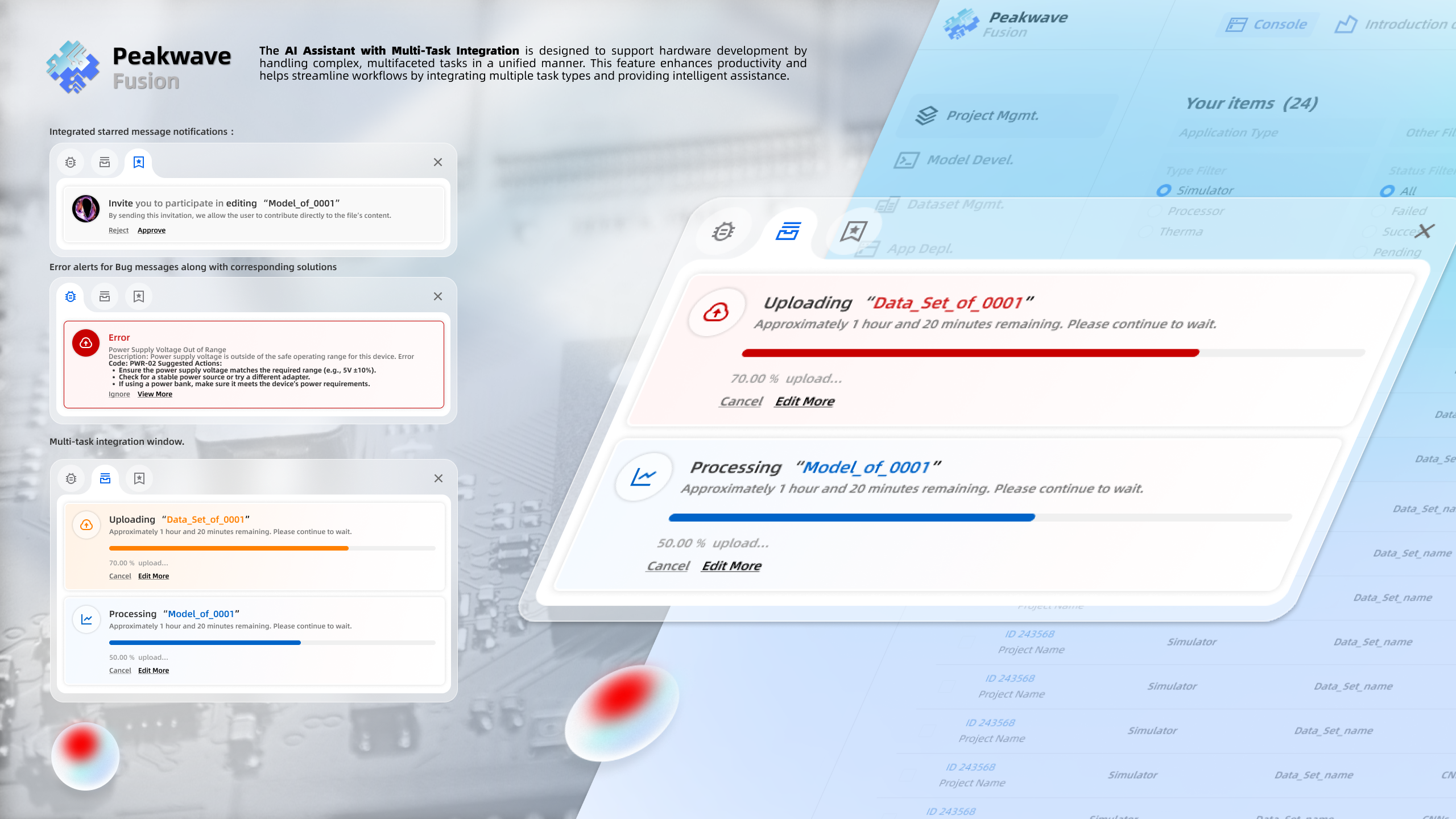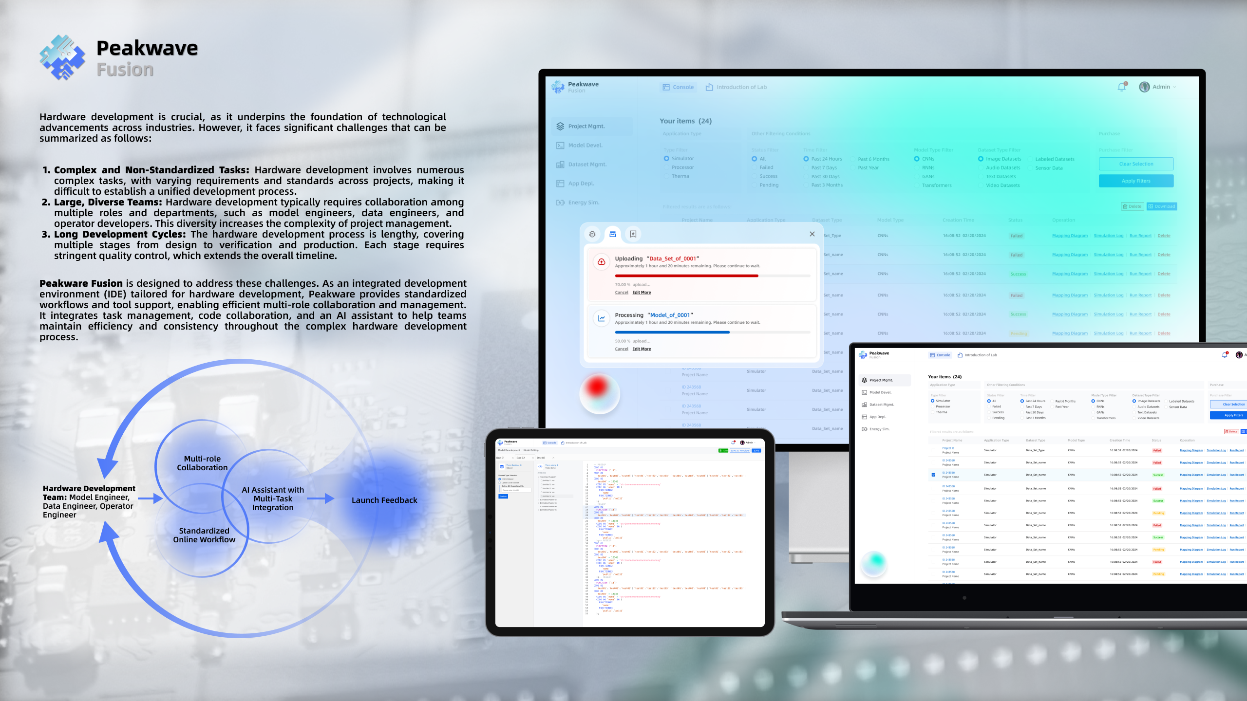 As an integrated development environment specifically designed for hardware projects, Peakware Fusion provides standardized workflows and multi-role collaboration tools, covering every stage from design to verification and production. Its built-in task management, code collaboration, and AI assistant capabilities help teams maintain efficiency and consistency throughout the entire hardware development process, enabling faster implementation for complex hardware projects.
