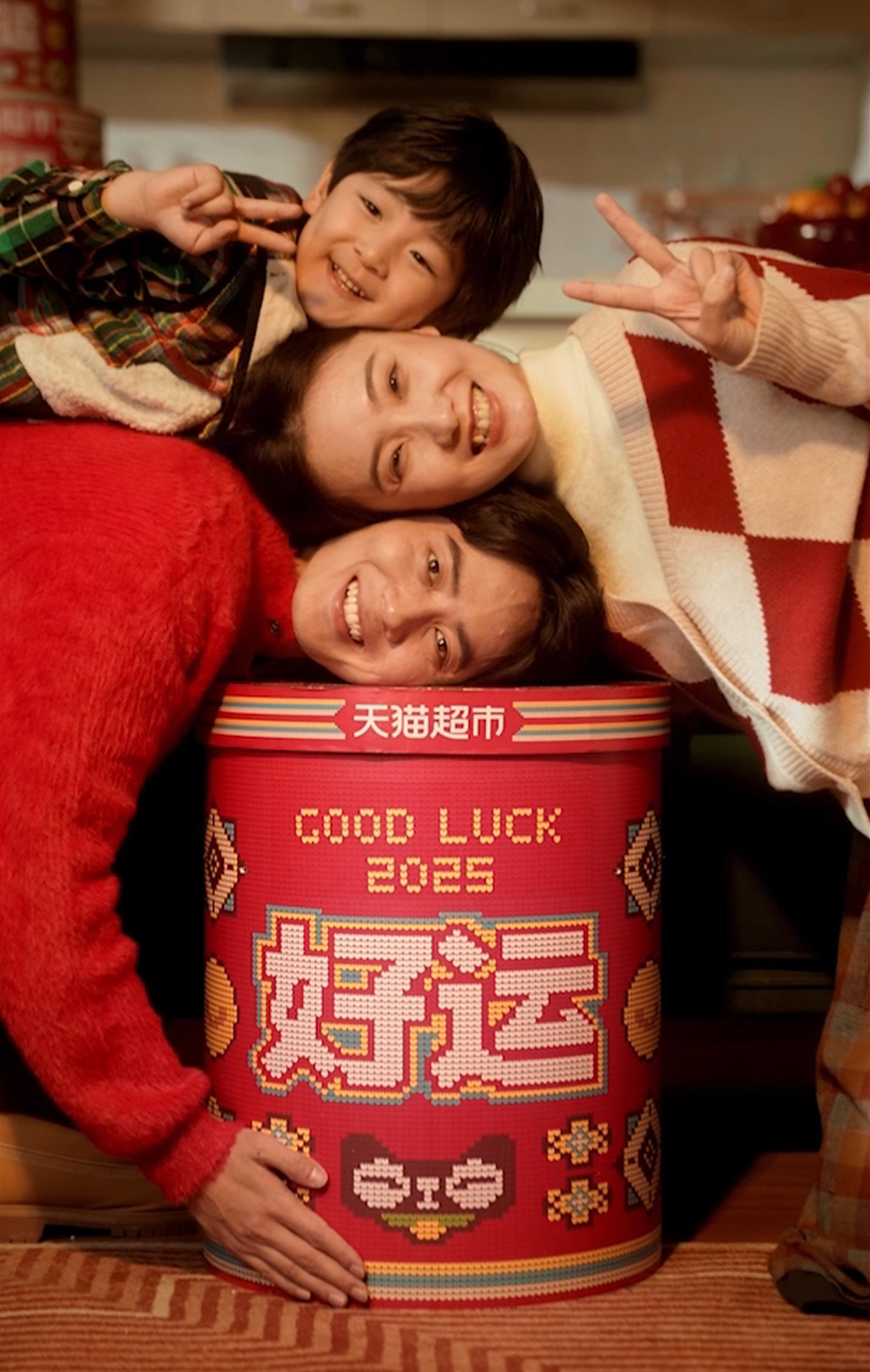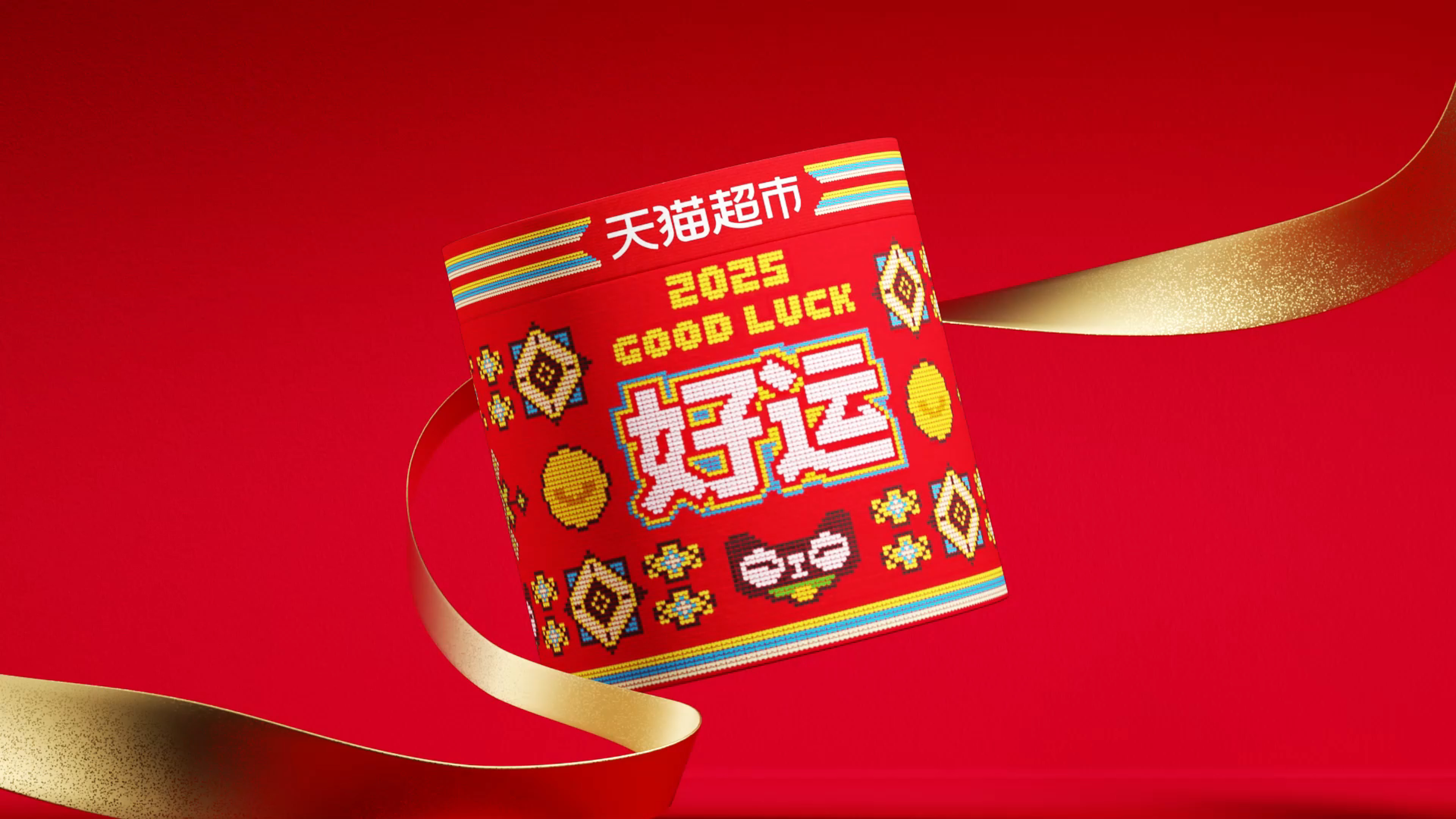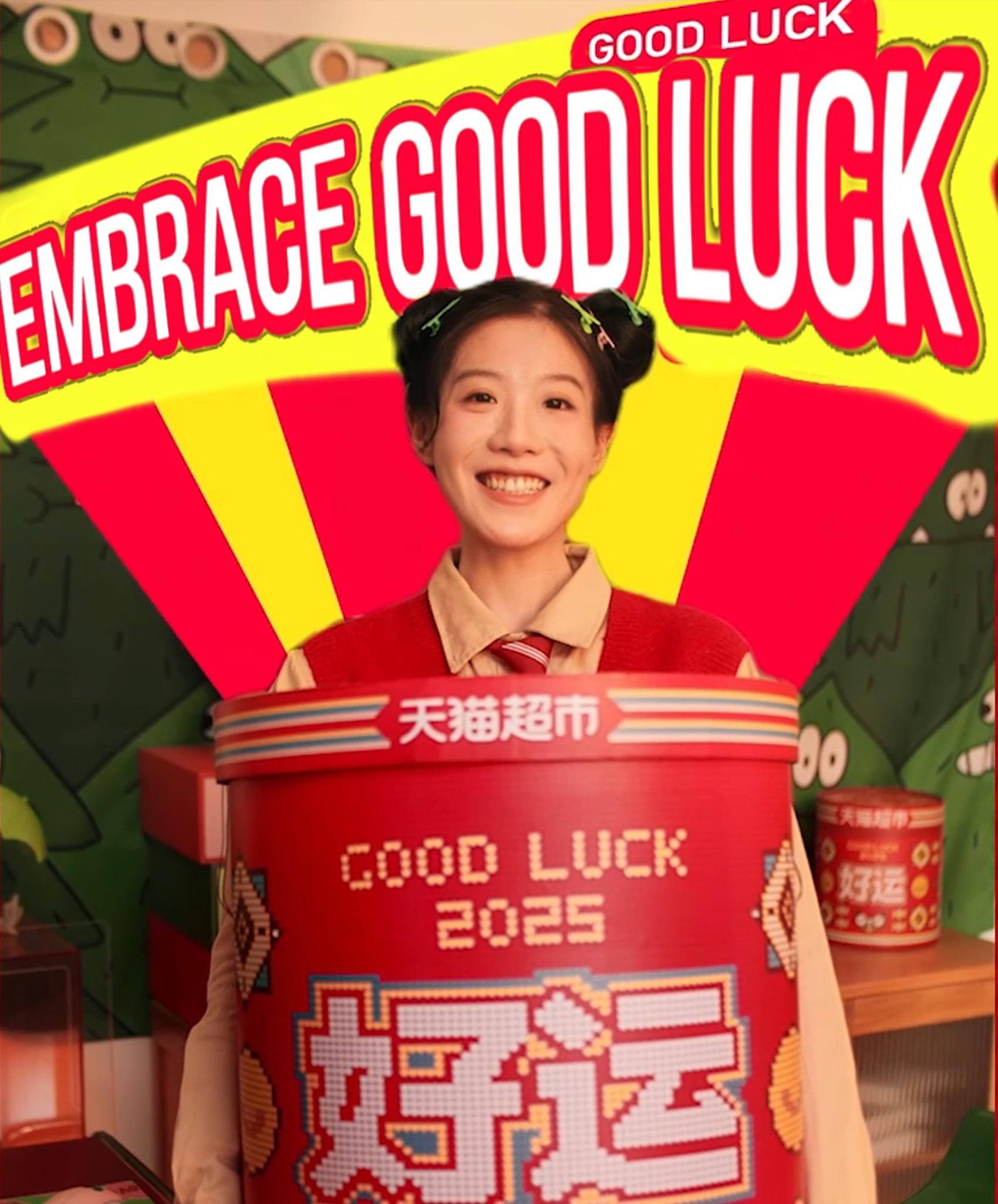 In Chinese culture, the New Year, also known as the Spring Festival, holds significant importance as a time for family reunions, fresh starts, and the welcoming of good fortune. During this festive season, individuals strengthen their emotional connections by exchanging blessings and gifts. In light of this cultural significance, Tmall Supermarket initiated the marketing campaign titled “Go to Tmall Supermarket, hold good luck in the New Year” to boost brand visibility during the Chinese New Year and to foster a deeper emotional and value-based relations with consumers. The initial phase of the campaign involves the creation of distinctive product packaging. The co-branding has been launched to produce the “New Year's Luck Bucket”, which features specialty products from prominent brands presented in innovative gift packaging. The bucket's design incorporates traditional red and gold colors as typical elements of the New Year, and plays on the phonetic similarities of “hugging bucket” and “hugging good luck” in Chinese, suggesting that good fortune will be embraced in the New Year. The knitted wool texture of the package conveys warmth and a sense of home, aligning with the festive spirit of winter and family gatherings. Furthermore, the Good Luck Bucket is crafted to be a reusable and versatile container, allowing consumers to repurpose it as home decoration or for storage, rather than limiting it to a single-use packaging.Tmall Supermarket leveraged prominent domestic social media platforms, including Weibo and Xiaohongshu, to amplify the event's reach through targeted topic marketing and content promotion. Through AI-generated technology, Tmall Supermarket placed glassless 3D short films on large screens in major urban centers nationwide, enhancing brand visibility and fostering a sense of geographical connection through innovative visual effects and iconic landmarks. The campaign also featured a series of promotional videos tailored for media platform distribution. These videos portray characters from various age groups, children, youth, and seniors, navigating typical life situations during the Chinese New Year. In these narratives, the characters unexpectedly receive a bucket of good fortune, leading to a series of uplifting and heartwarming tales. This storyline forges an emotional bond with viewers across diverse ages and backgrounds.