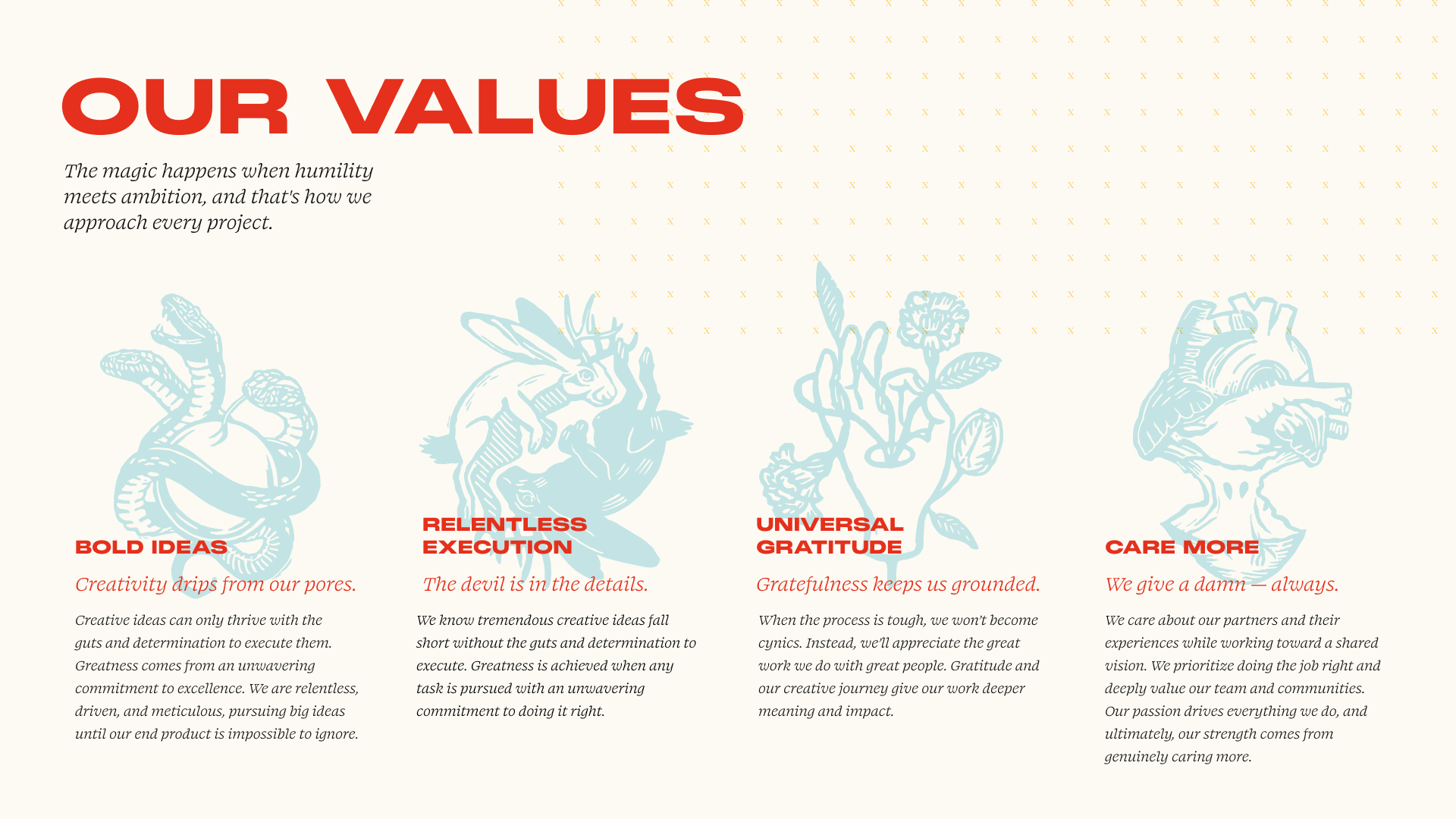 Our approach is rooted in these principles. Bold Ideas challenge conventions and lead to fearless, original work. Relentless Execution ensures that we deliver results with precision and passion. Universal Gratitude shapes how we engage with clients, each other, and the world, while Care More drives our commitment to making a difference. Whether we’re creating impactful campaigns for Fortune 10 clients like McKesson and other market-leading healthcare companies, to first of it's kind mobile apps, or volunteering to support local community needs, we bring these values to every project and every relationship.