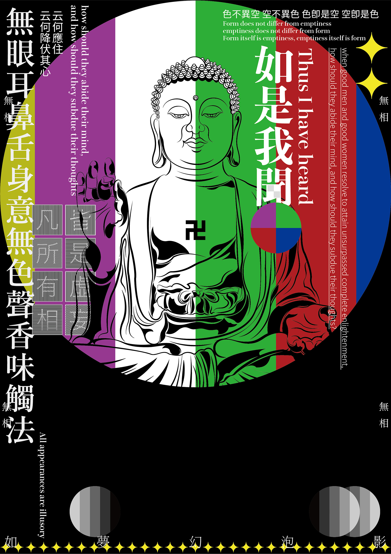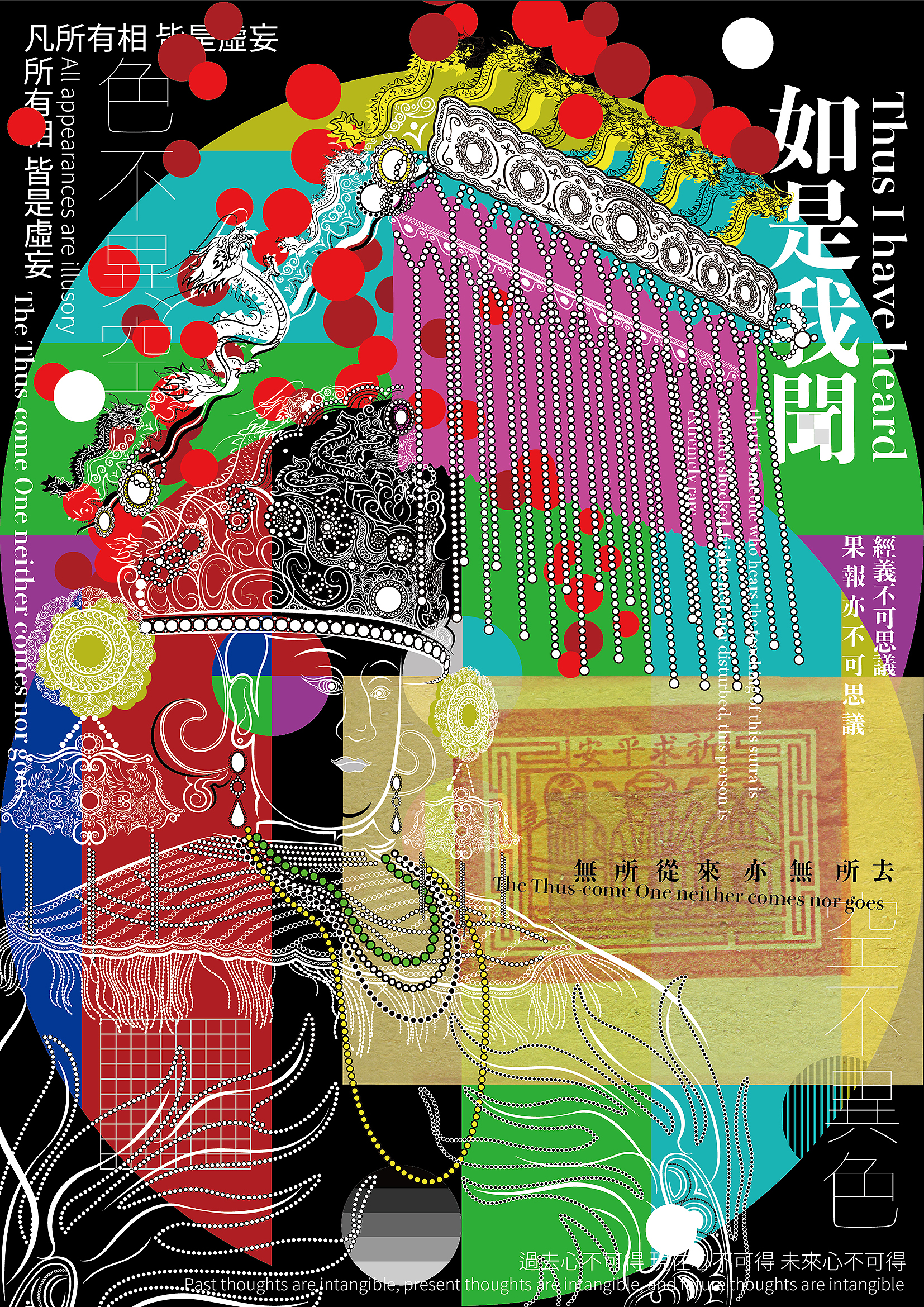 Colours. They are the heart’s desires, the world’s obsession. Precepts. They are the principles of self-belief. Through the use of test signal patterns (Test Card/Test Pattern), à la TV broadcasts, the infinite loop of the end-of-day image draws parallels to our own world and one can metaphorically infer that people’s hearts are constantly facing a barrage of temptation, pushing their resolve, so that they find it difficult to restrain from giving in. The image of Mazu and Buddha their calming presence symbolizes the world’s reverence for the gods. To attain peace of mind and tolerance, one follows the teachings of their ascribed gods. But in a colourful world, one filled with temptations, how does one keep the heart at bay and maintain a selfless soul that shuns these desires? In a world of temptations, it is very much like the broadcasting of television and the endless cycle of the daily ending routine. One constantly appeals to the gods, in hopes of returning to that calming peace of mind. It is contradictory and it is also ironic. We don’t seem to understand that we have to live our lives by abiding by certain rules and by following these rules, we will be able to stay away from temptations and have a free heart. Clear your temptations, they interfere with your peace, but be colourful in enriching your soul.