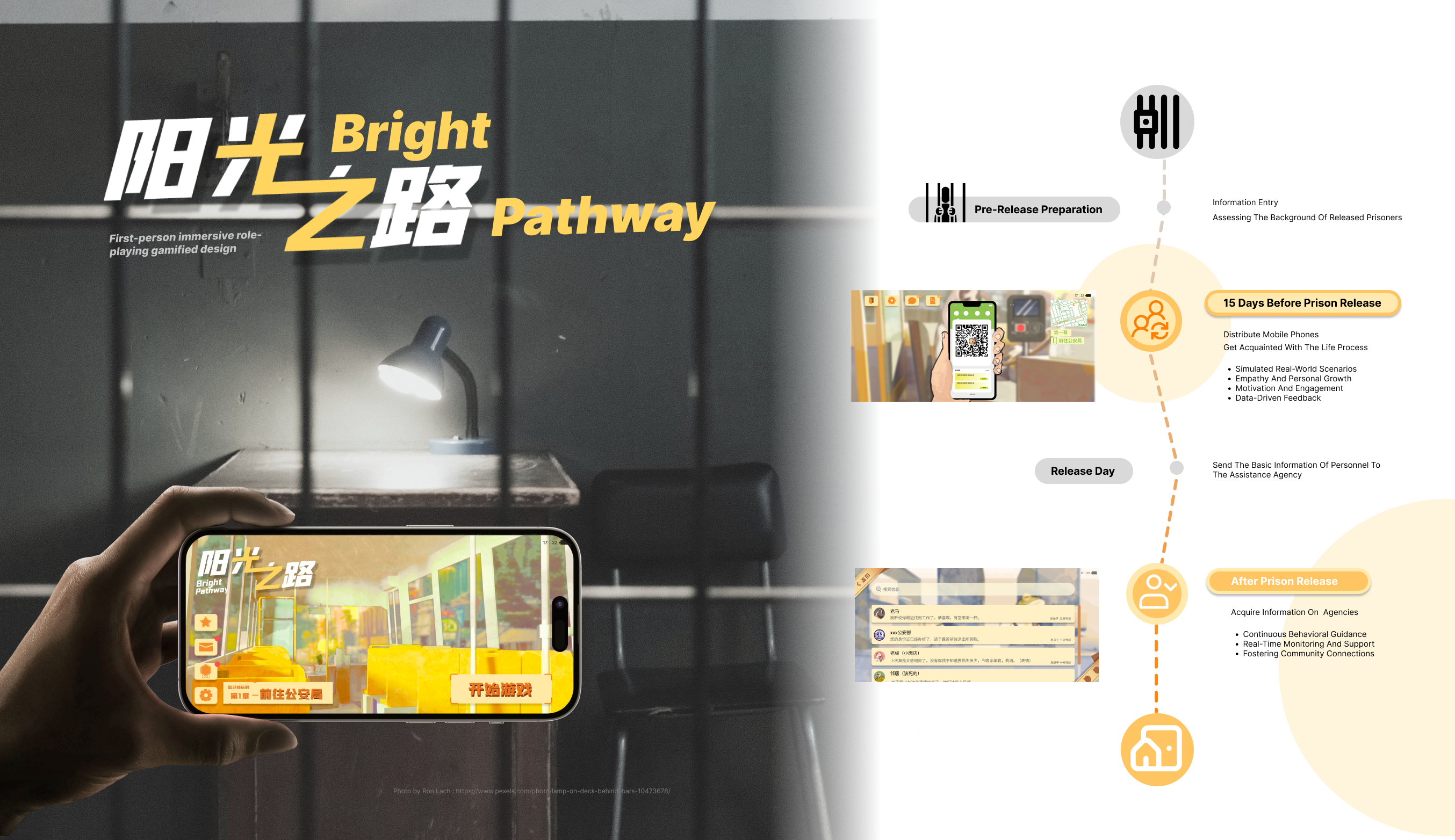 Bright Pathway is a gamified design aimed at addressing the challenges faced by some ex-offenders, such as weakened social ties and a lack of guidance for reintegration, often caused by long incarceration periods. The game seeks to simulate real-life scenarios to guide ex-offenders in adapting to society and help them reintegrate into normal life. We studied relevant cases and data on ex-offenders re-entering society, identifying key issues they face, including difficulty adapting to modern society, employment challenges, and societal prejudice. Bright Pathway is divided into two parts: the early and later stages of post-incarceration life. It realistically depicts the reintegration process, where ex-offenders actively participate in tasks such as finding accommodation and seeking employment. The