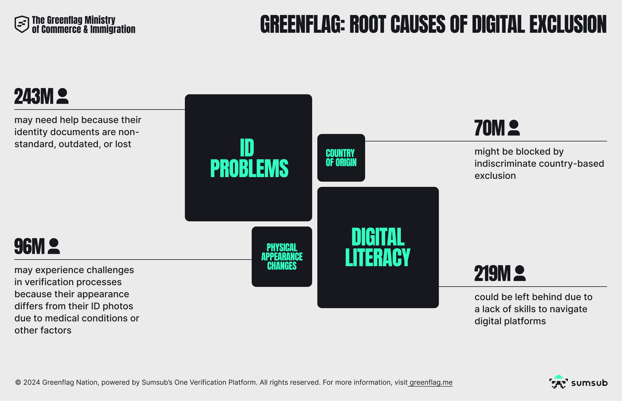 627 million people are unjustly excluded from digital services like financial platforms, education, healthcare, and employment—essentials that many take for granted. That can be caused by overly risk-averse verification systems that penalise simple things like minor ID discrepancies, digital literacy gaps, physical appearance changes, or even country of origin. This can create a cascade of exclusion: locked out of one service, individuals are often locked out of others, forming an almost insurmountable barrier to reentry.
