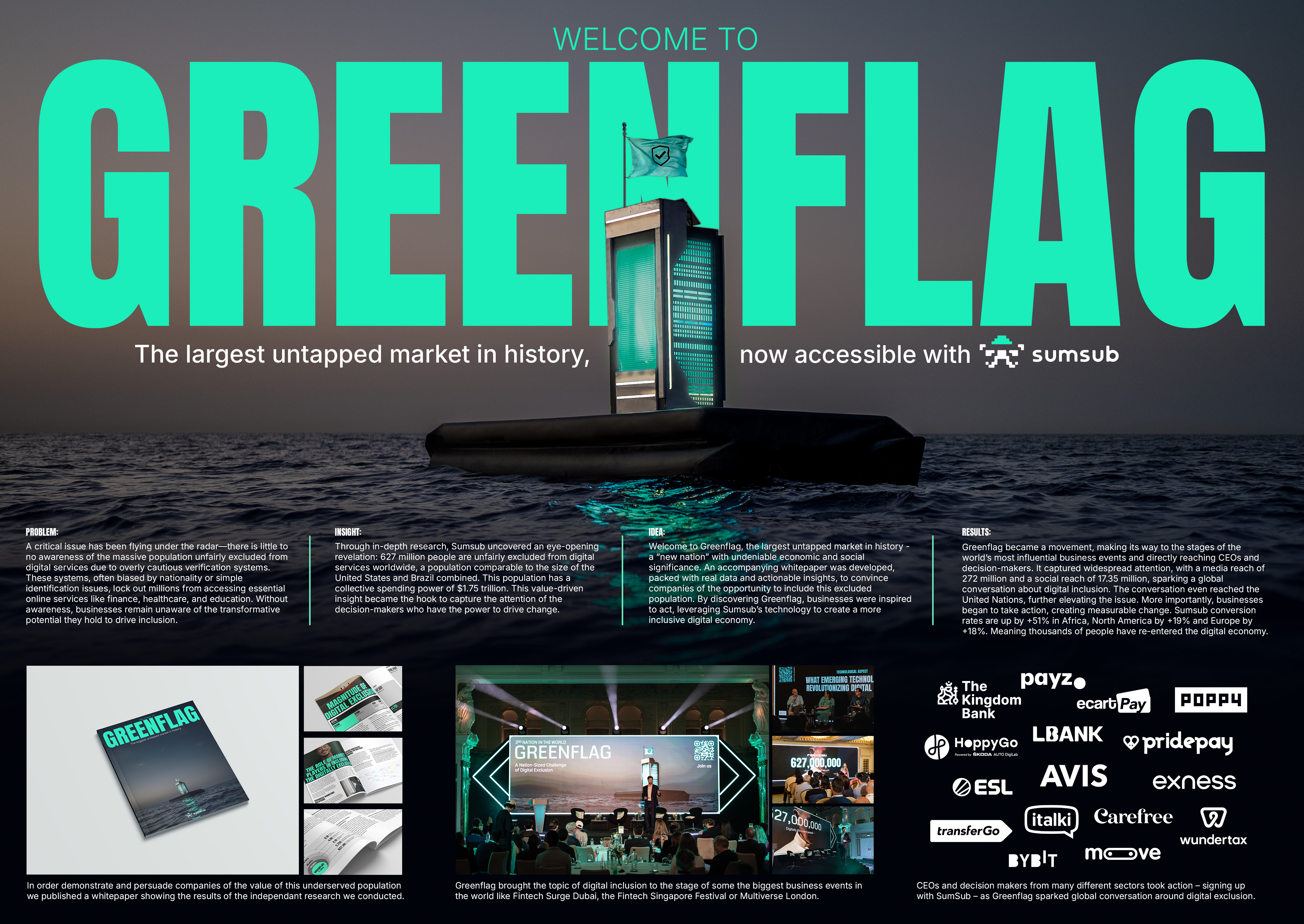 Greenflag launched globally with an online film across digital channels directing businesses to the website. It was showcased at top-tier tech trade events, supported by an accompanying white paper, and integrated into B2B outreach. The success of Greenflag earned Sumsub an invitation to the UN Global SDG Leaders project. Greenflag has sparked change, enabling businesses to create a more inclusive digital future.