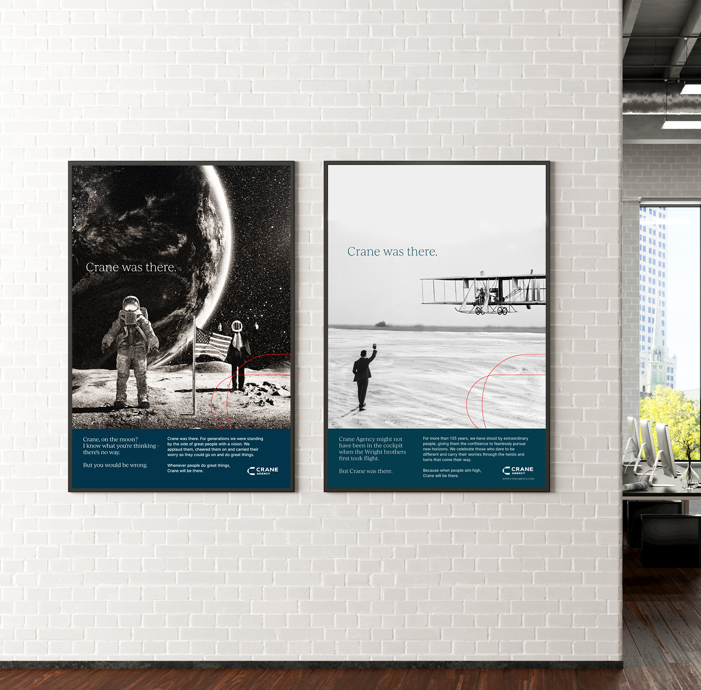 Rather than relying on generic industry tropes, we rooted the campaign in history, resilience and trust. Using archival imagery and bold typography, each ad juxtaposed significant historical events with the message: Crane Agency has seen it, supported businesses through it and will continue to do so.