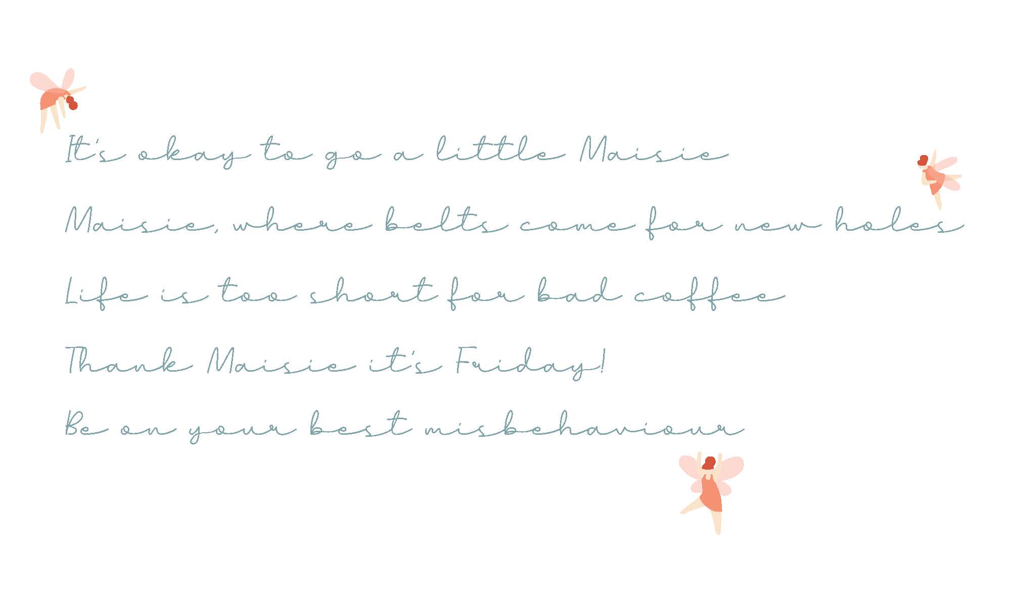 Throughout the brand, our Midsummer Night’s Dream-like fairies engage in indulgent and naughty activities — jumping, twirling, drinking, playing and dancing, reminding us that life is short and to allow ourselves small delicious pleasures. Similarly, the logo (a custom type) and secondary copy are hand-written as an extra friendly touch and a wink to Maisie’s namesake.