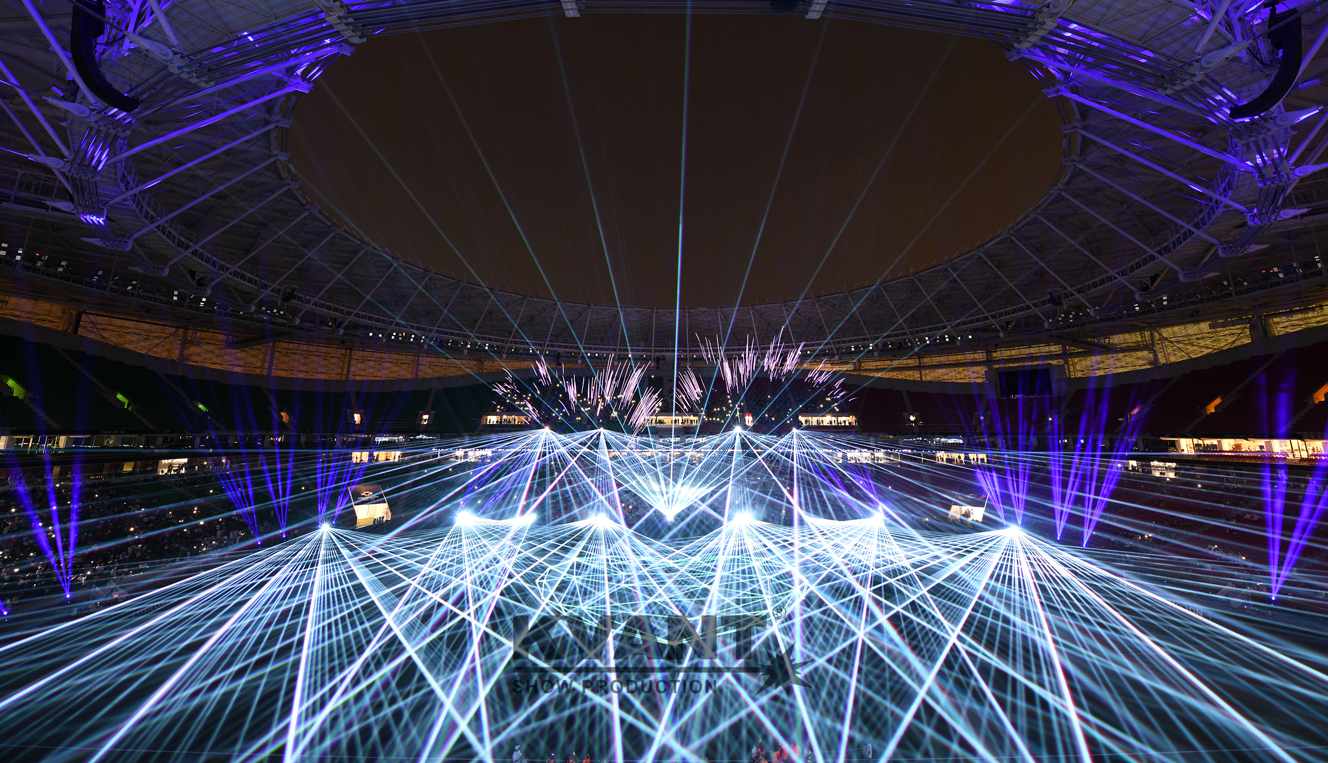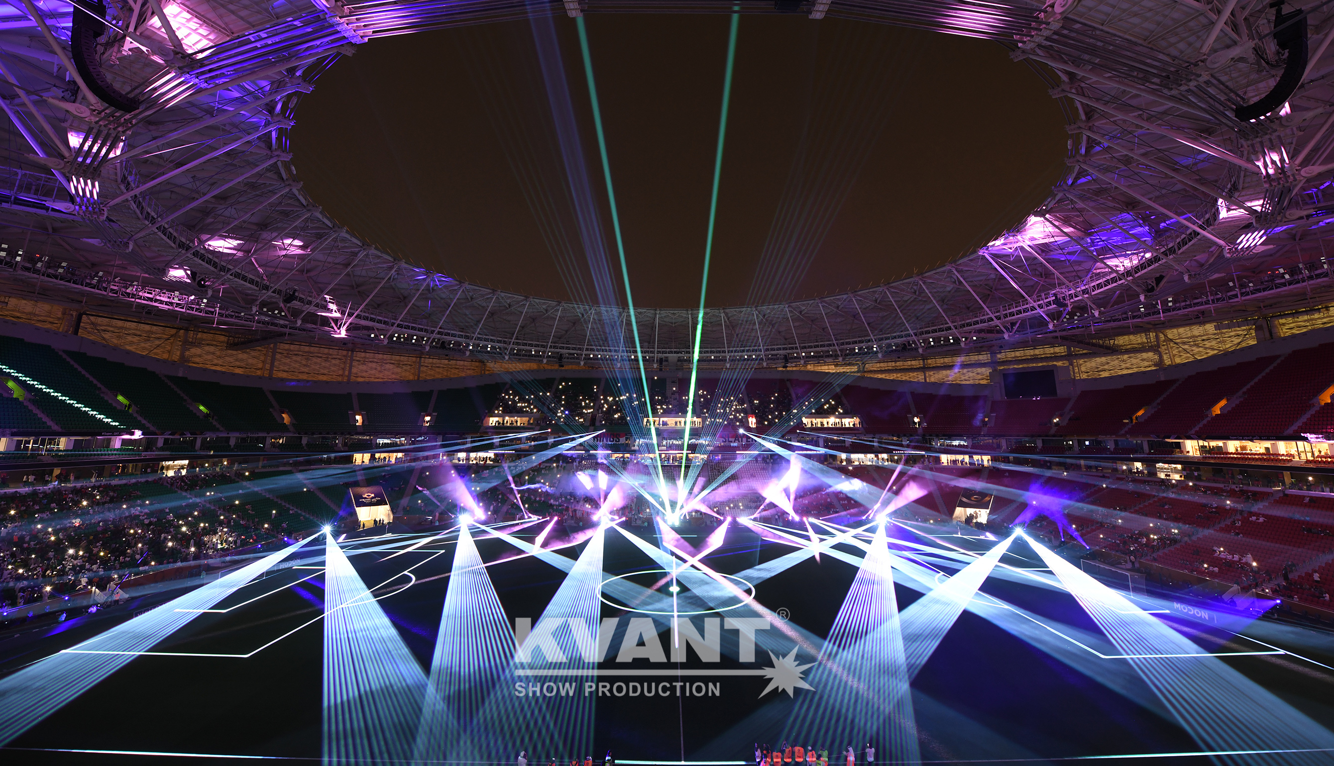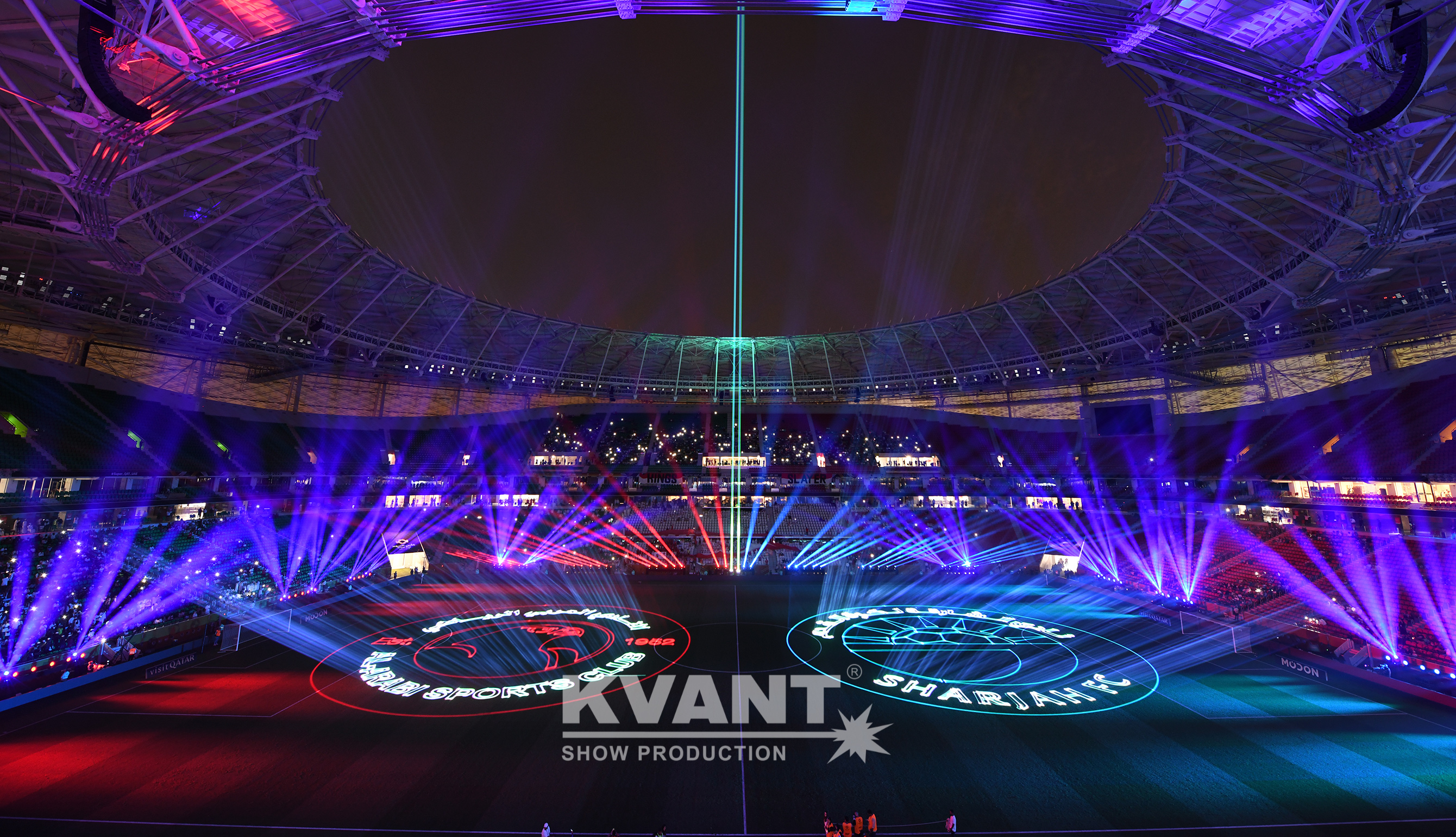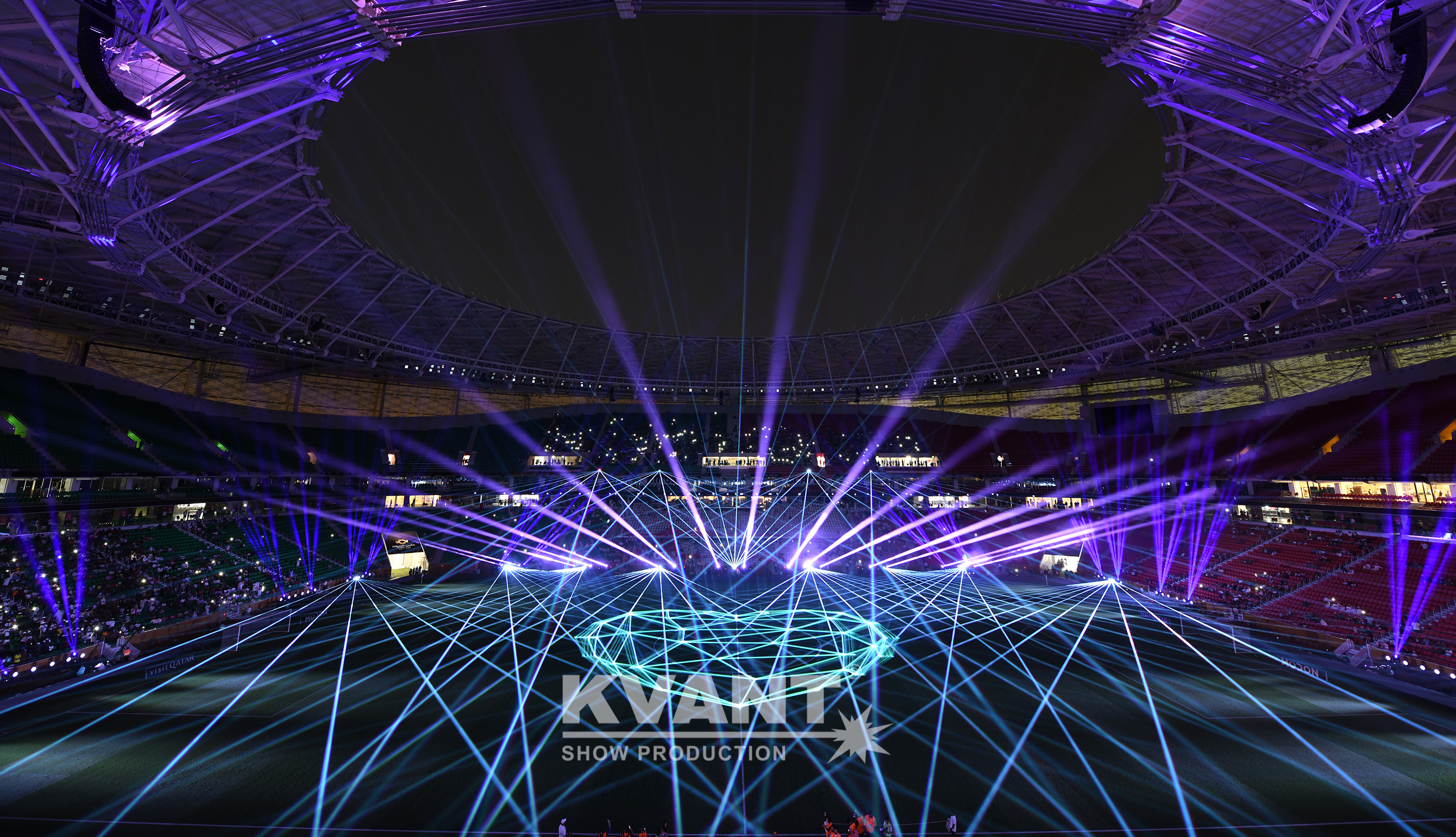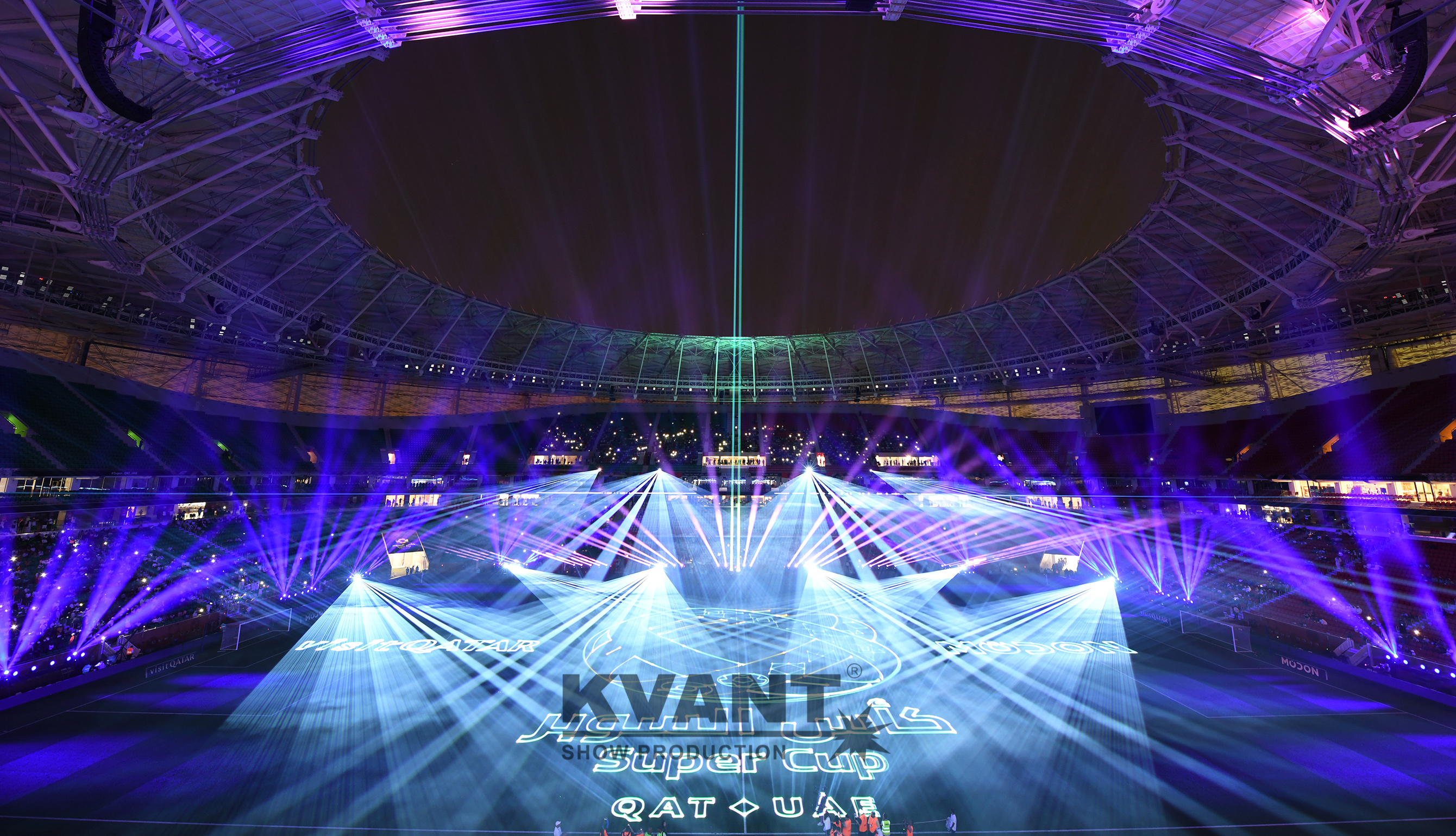 The opening ceremony of the Qatar-UAE Super Cup in football featured a 9-minute show with laser graphics, mapping, beam effects and fireworks. All lasers were the main element of the whole event. The main task was to show the possibilities of laser technology as the main element of the entire show. The event was in cooperation with Qvision Productions at Al Thumama Stadium in Qatar.