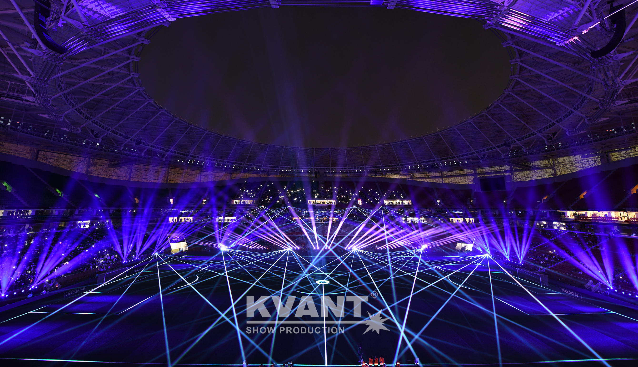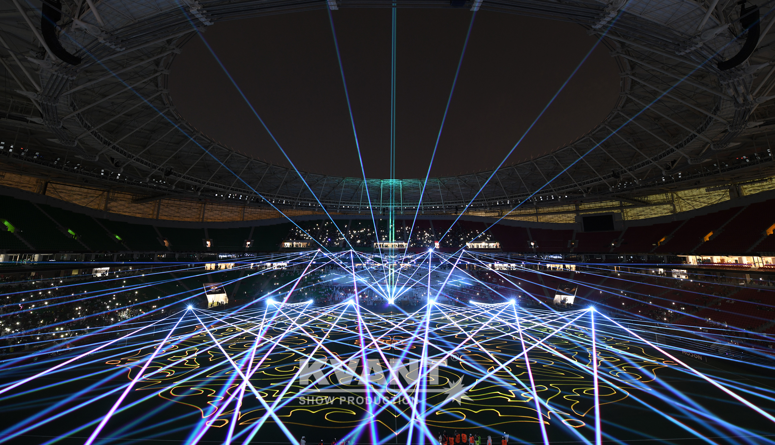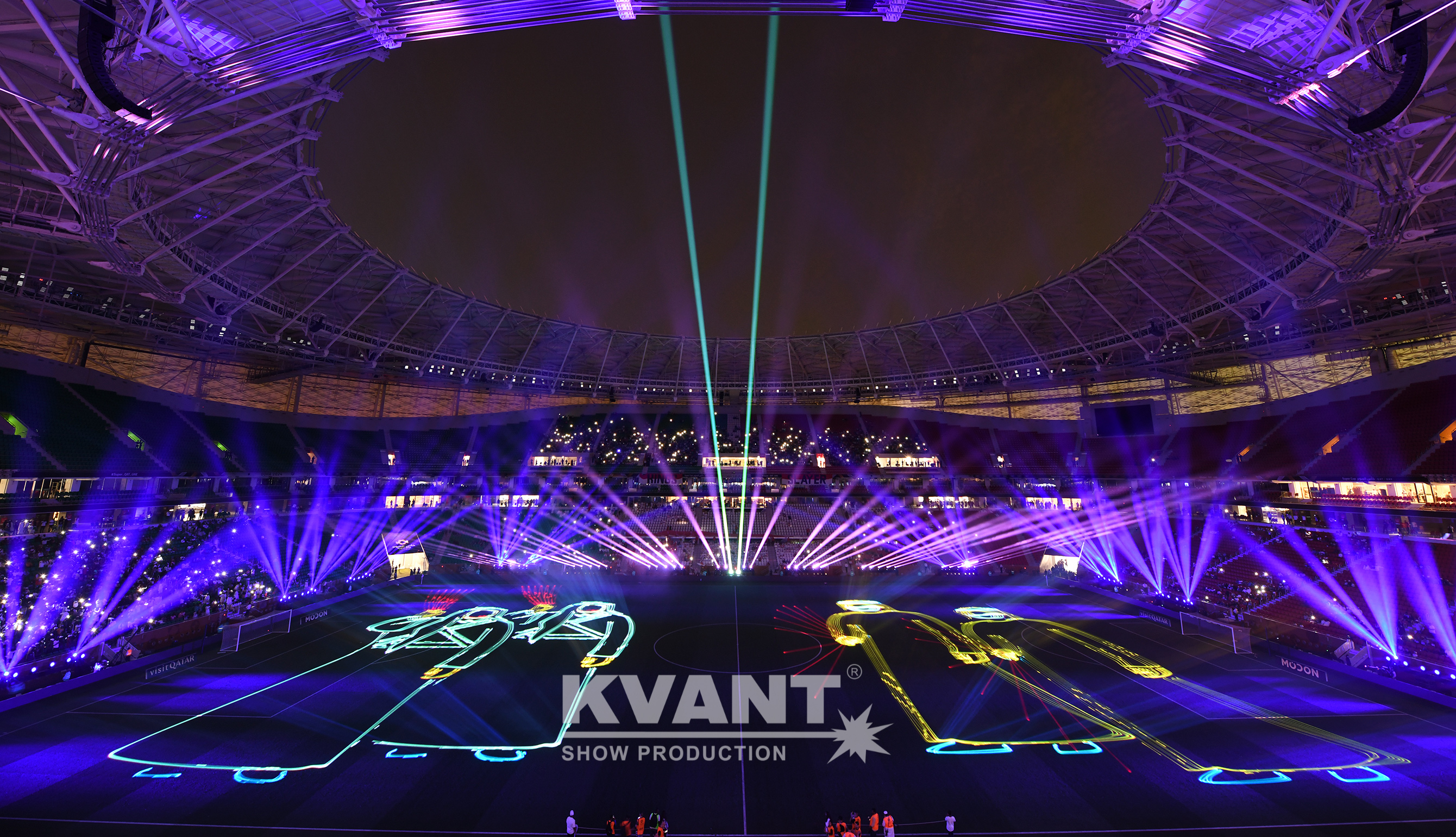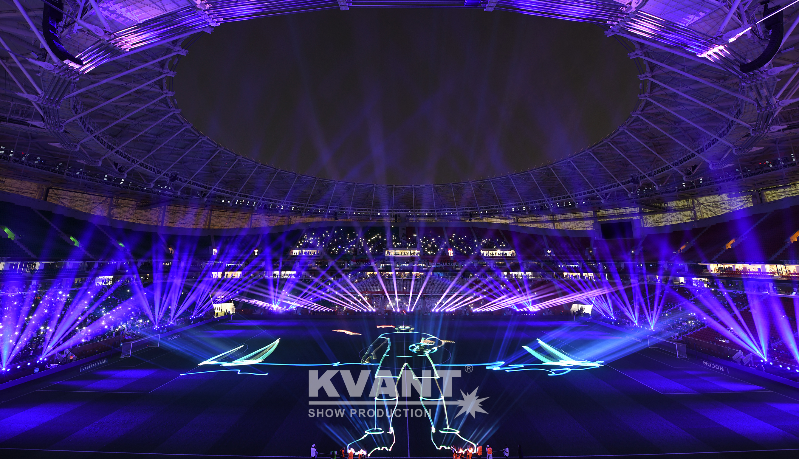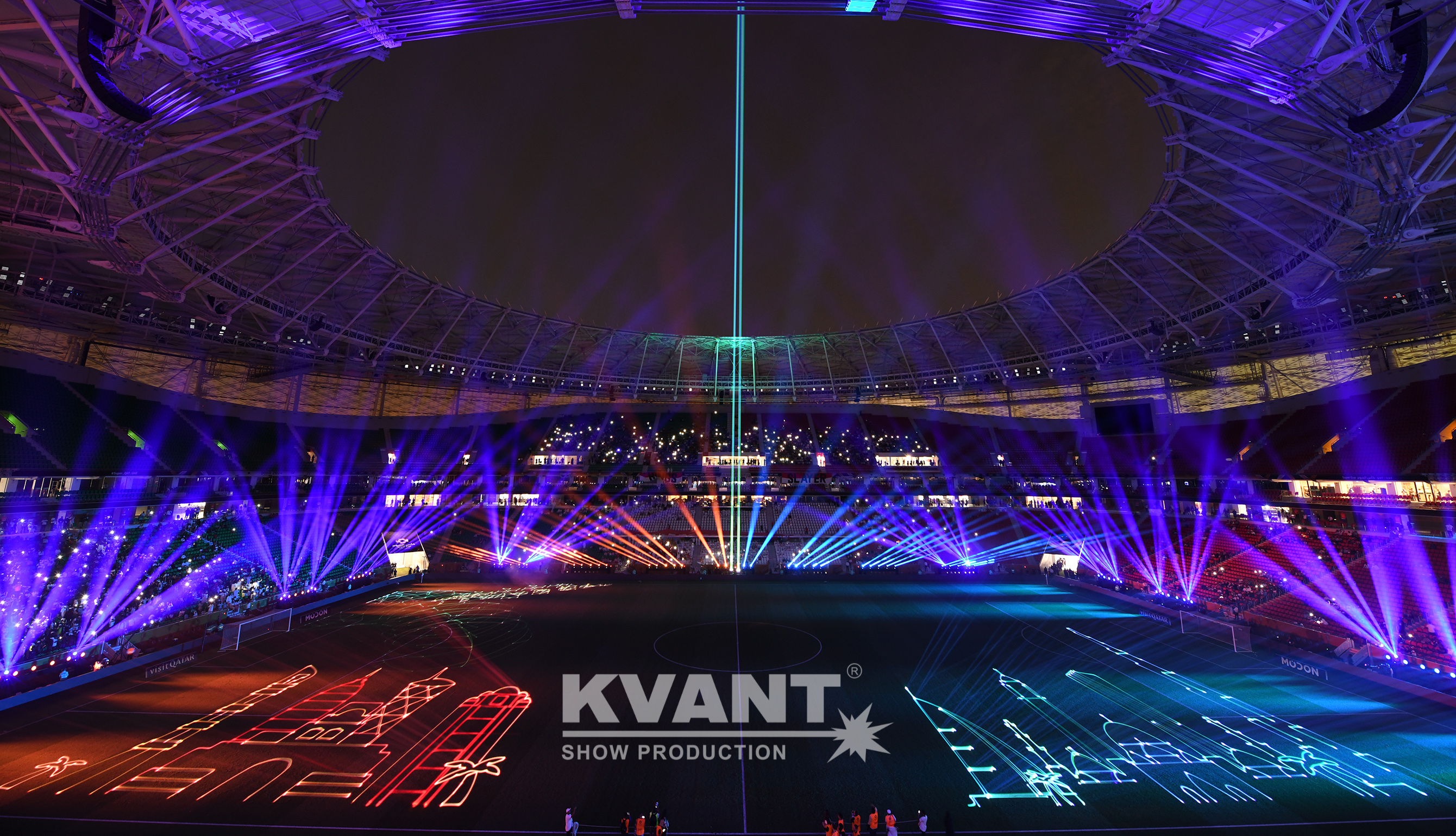 The opening ceremony of the Qatar-UAE Super Cup in football featured a 9-minute show with laser graphics, mapping, beam effects and fireworks. All lasers were the main element of the whole event. The main task was to show the possibilities of laser technology as the main element of the entire show. The event was in cooperation with Qvision Productions at Al Thumama Stadium in Qatar.
