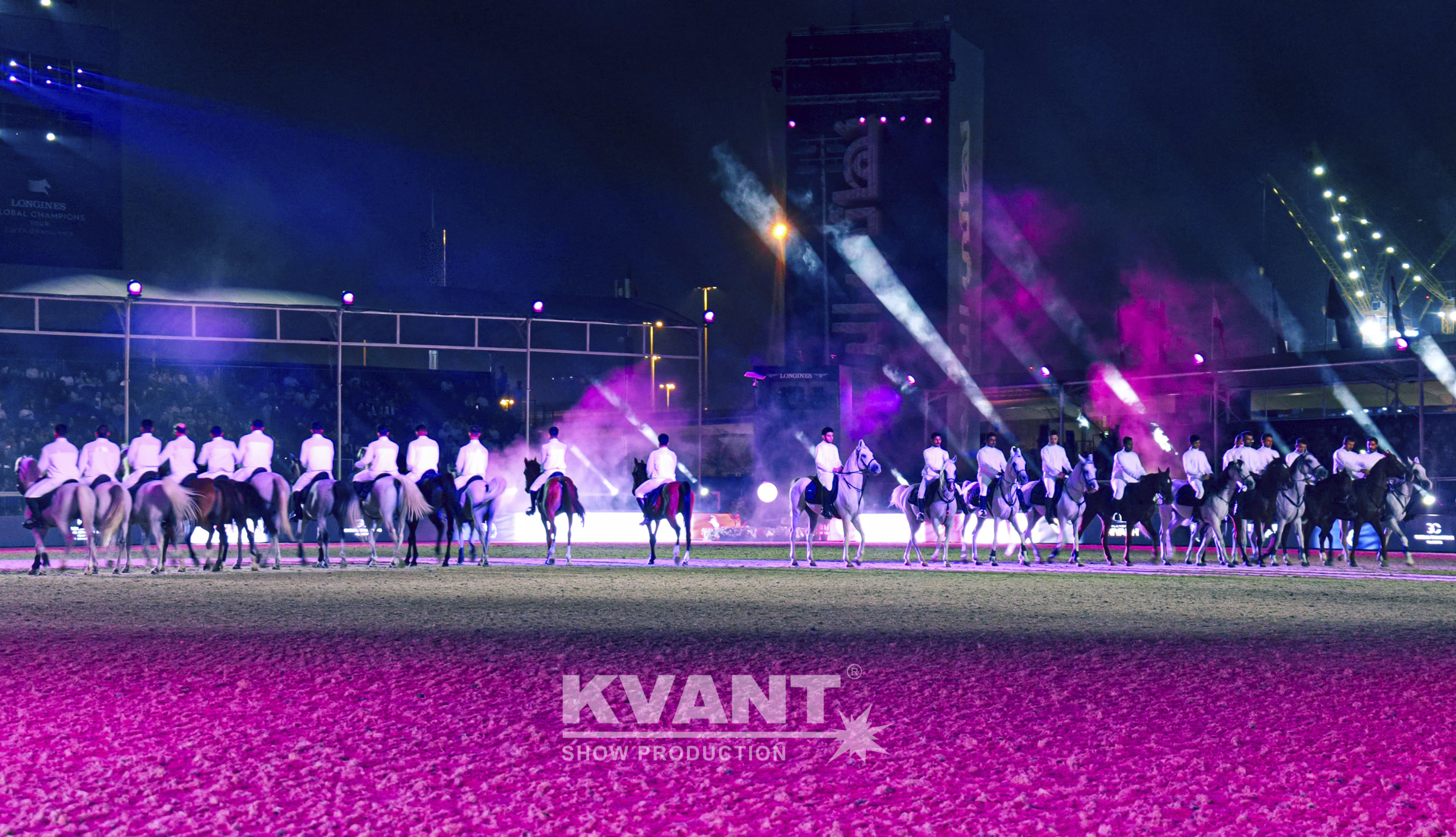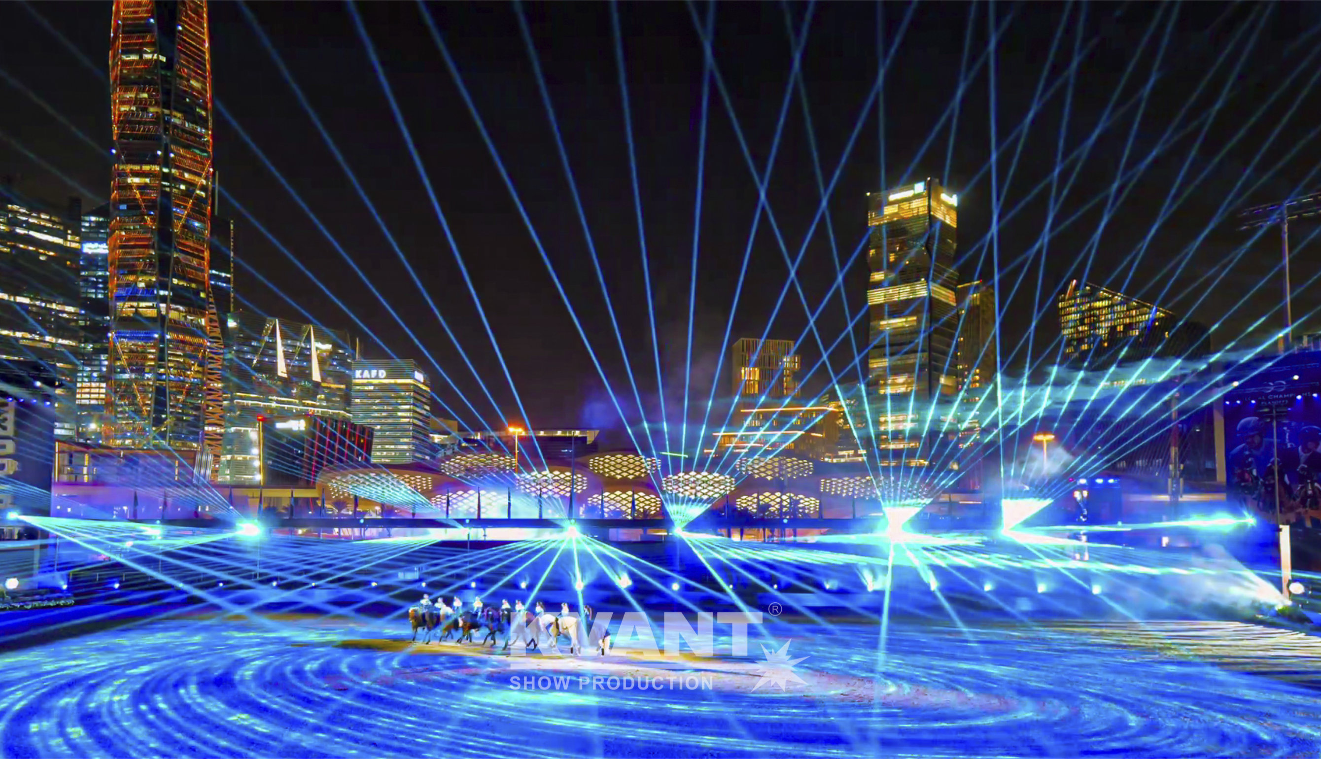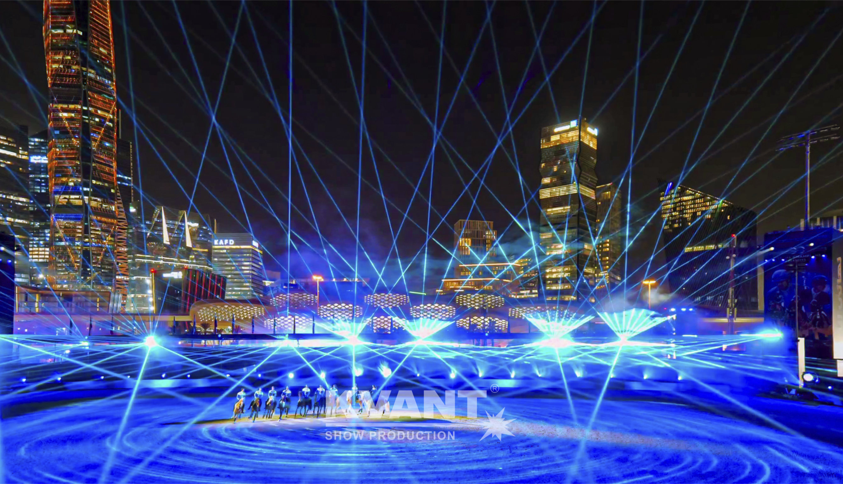 Laser technology has never before been permitted as a form of projection during a horse racing event. We had to follow strict regulations; specifically, the laser beams could not shine below a certain height to ensure the horses' safety. To comply with these rules, we employed special effects that dispersed the laser beams over a wider area instead of focusing them as a single beam. Before implementing the laser effects, we conducted tests to observe how the horses would react. This was crucial for our planning. Based on these tests, we selected specific laser effects intended to create the desired atmosphere without frightening the horses.