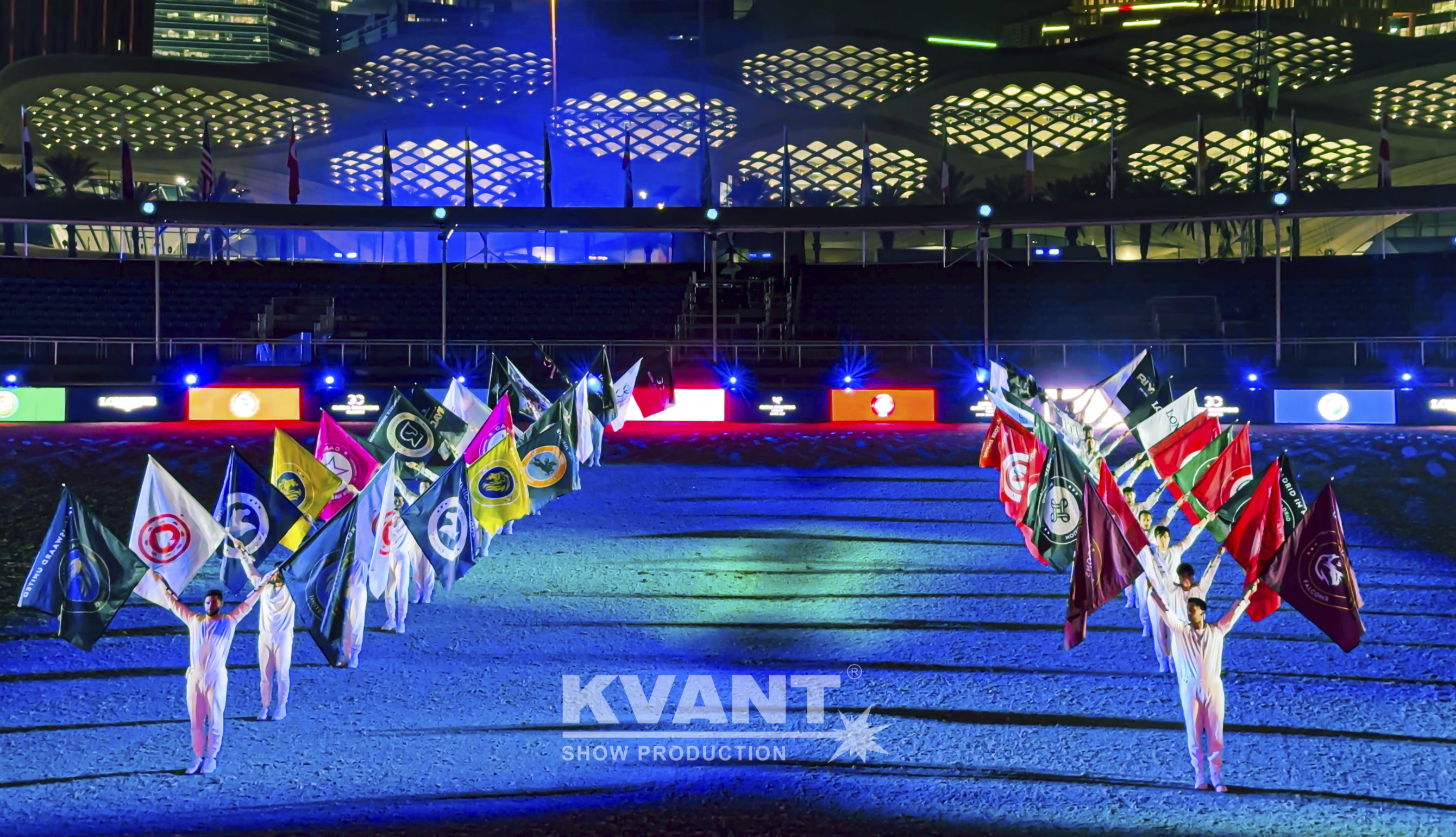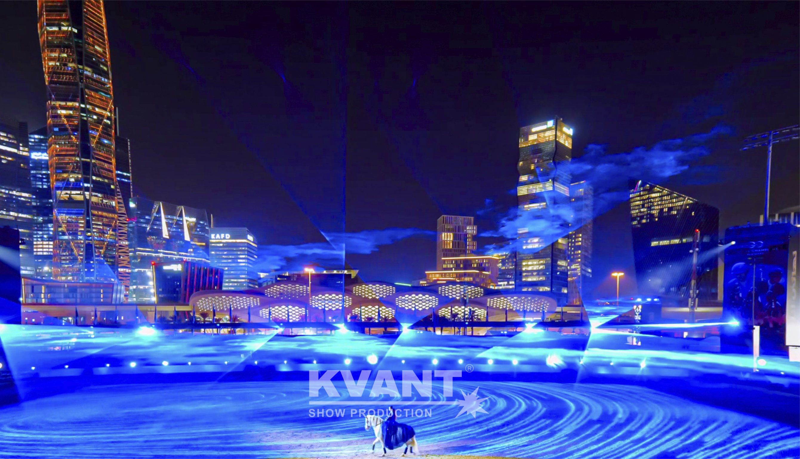 During the installation process, several issues emerged due to the arena being constructed in an open area. A special base for the horses had already been established, which restricted the movement of heavy machinery. To address the projection needs, 20 laser projectors, each with an output of 40W, were installed on temporarily constructed upper structures around the entire perimeter of the arena, resulting in a 360-degree projection.