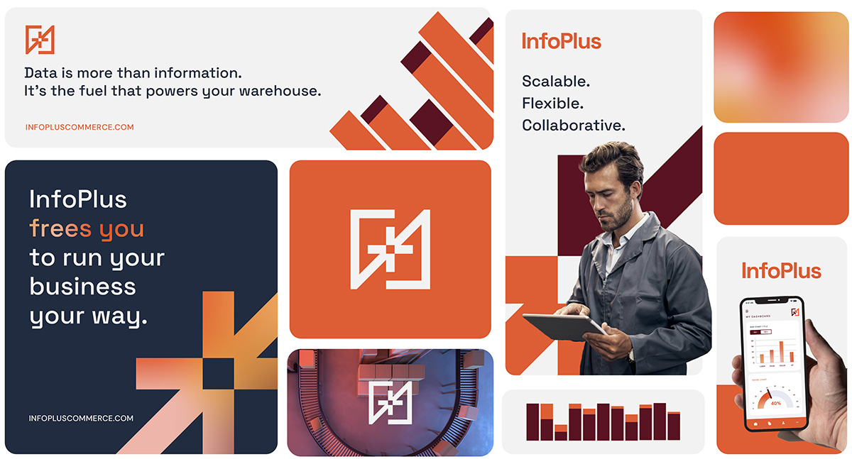 With a clean, modern design, refined messaging, and a website built around user needs, the promise of InfoPlus becomes clearer than ever. Every detail of the brand—from bold colors and graphic elements to website navigation and calls to action—works to reveal how InfoPlus empowers businesses to take control of their supply chains.