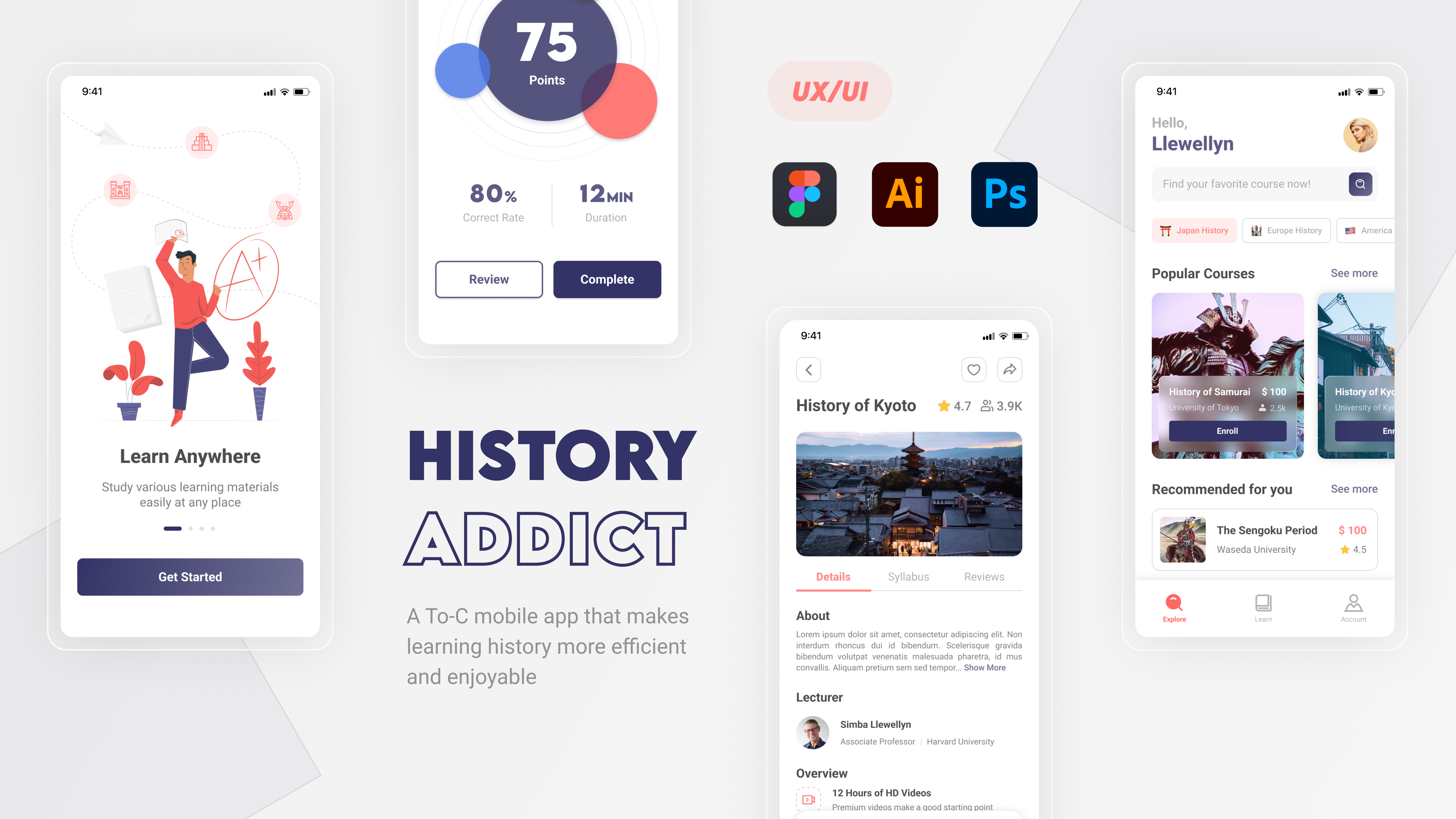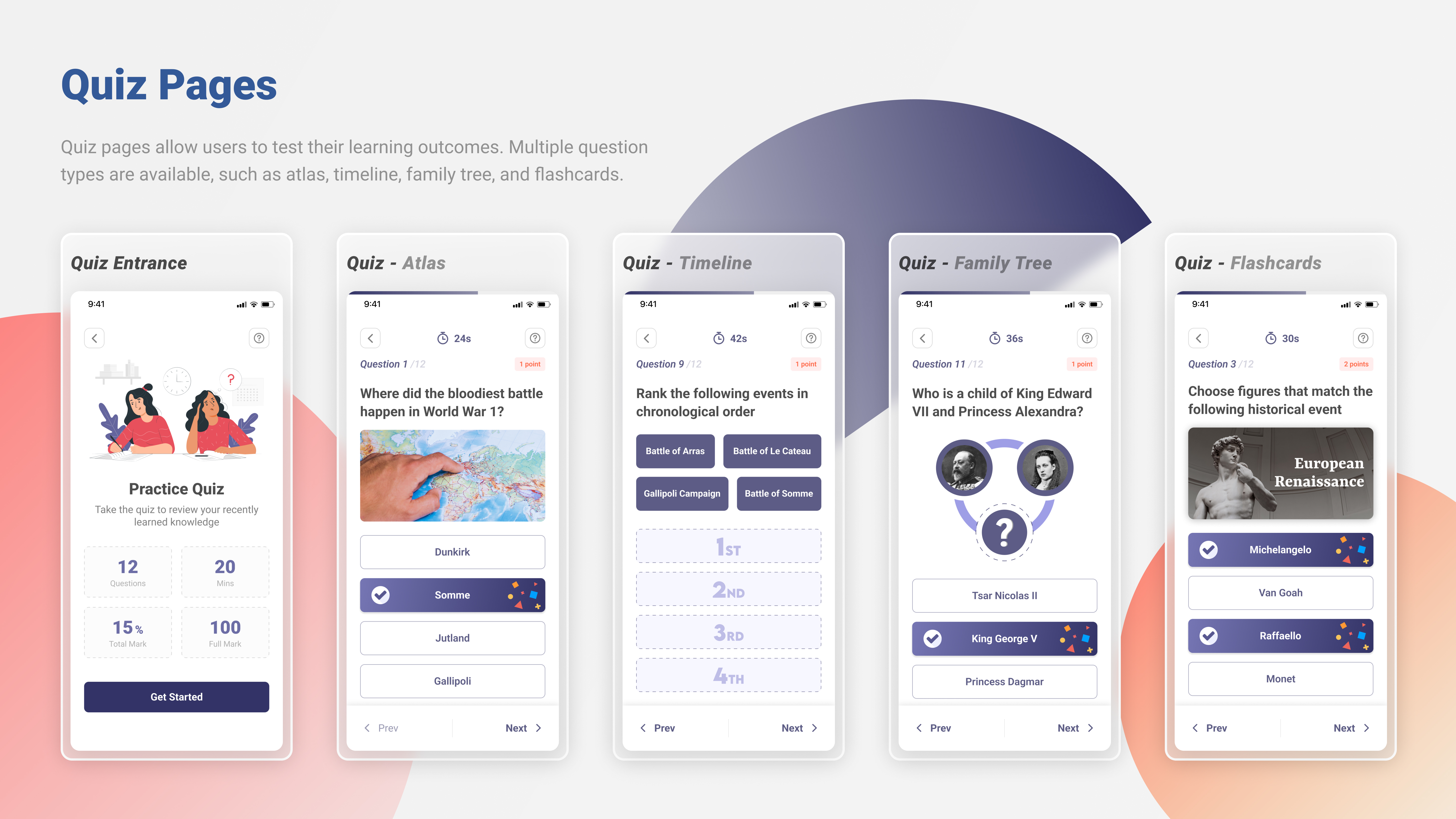 History Addict is an app for learning history. The main idea of this app is to gamify the experience of learning history. It provides a variety of ways and themes for users to learn history,making the history learning process more enjoyable and entertaining. Furthermore, the app also makes complicated content easier to understand and helps learners better memorize the knowledge they learned.