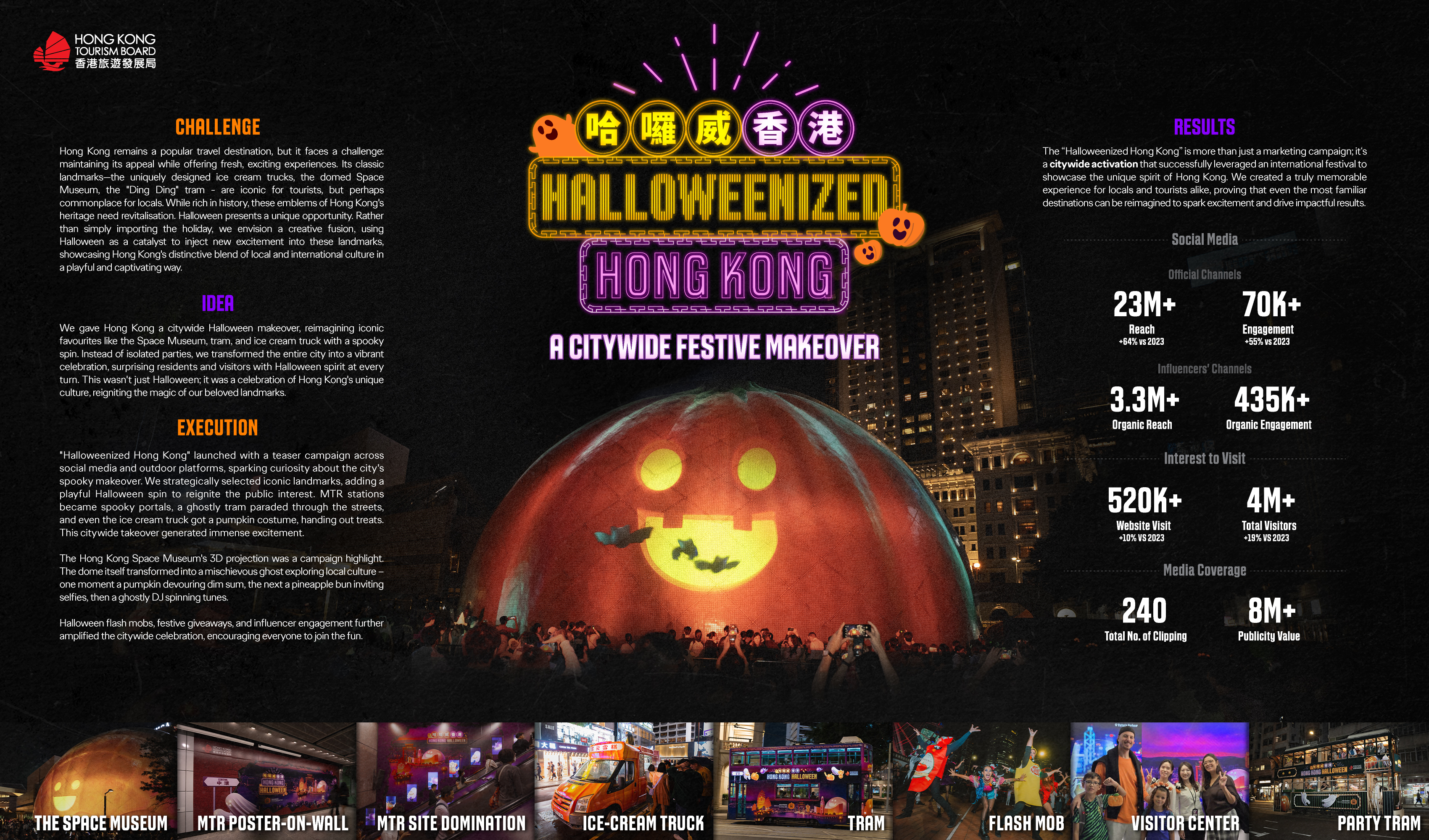 Idea & execution: Introducing ‘Halloweenized Hong Kong’ - a citywide festive makeover that brings the city’s iconic landmarks back to the spotlight through spooky spin. Instead of simply importing the holiday, we introduced a creative fusion of local and international cultures, transforming the whole city into a vibrant celebration hub.