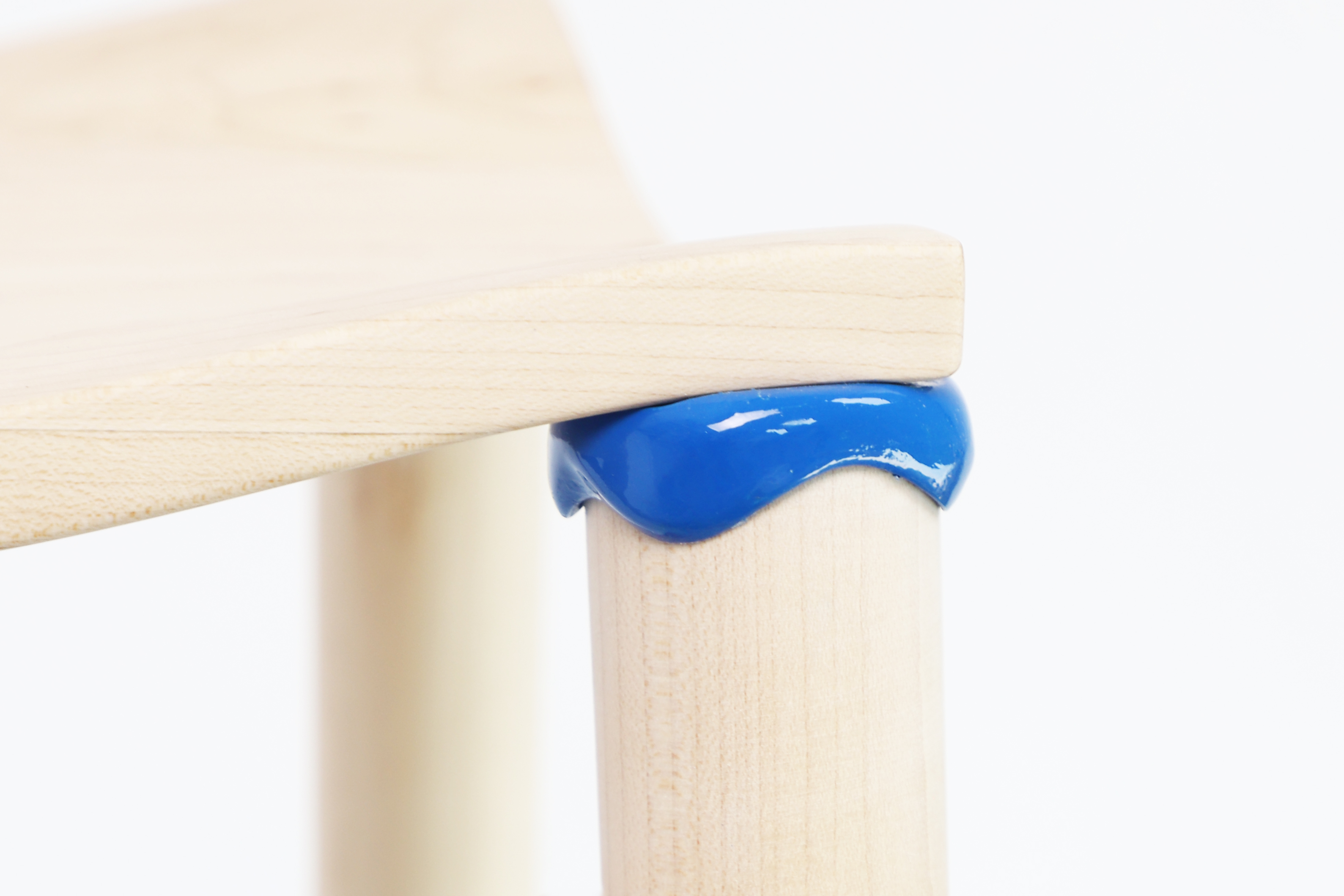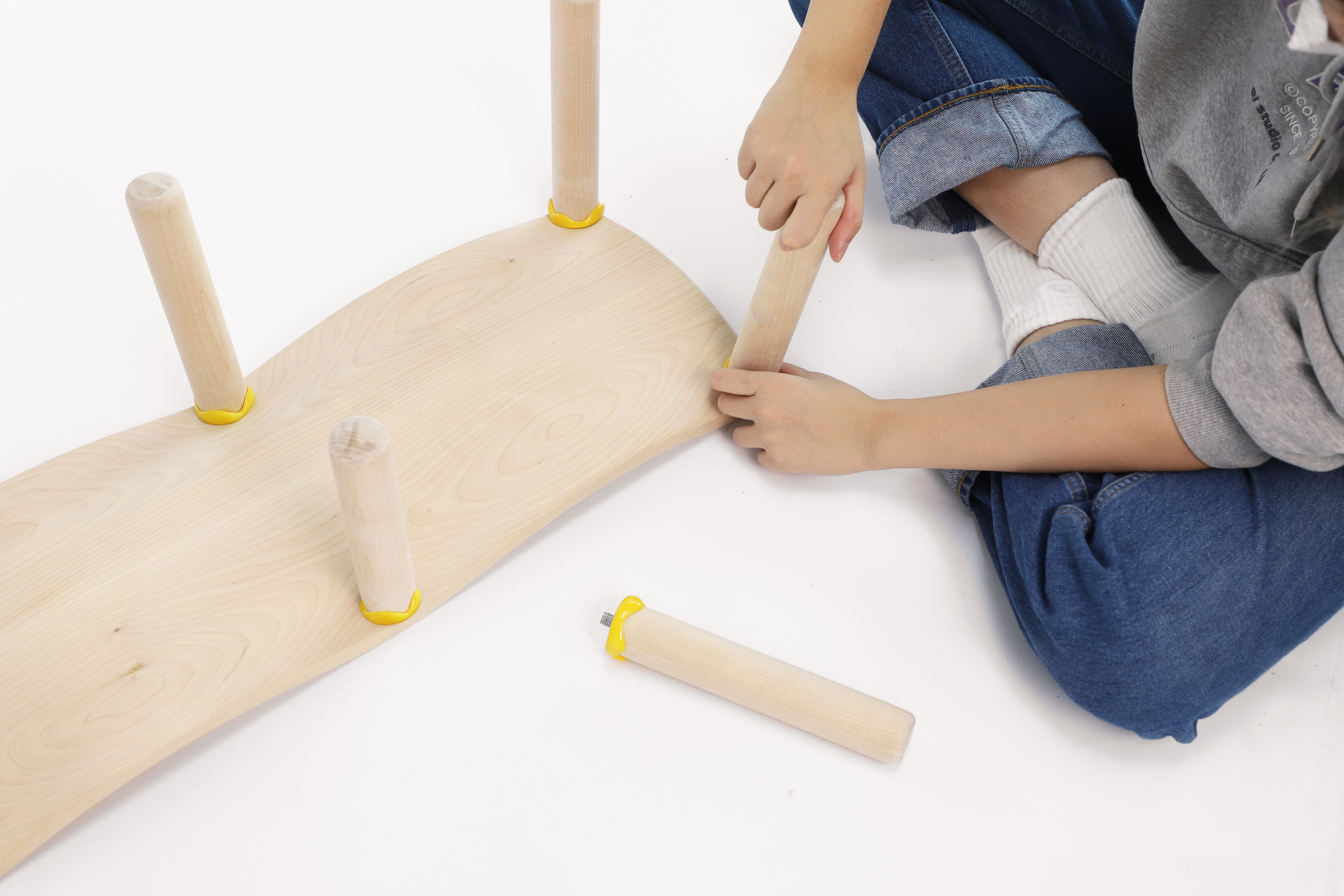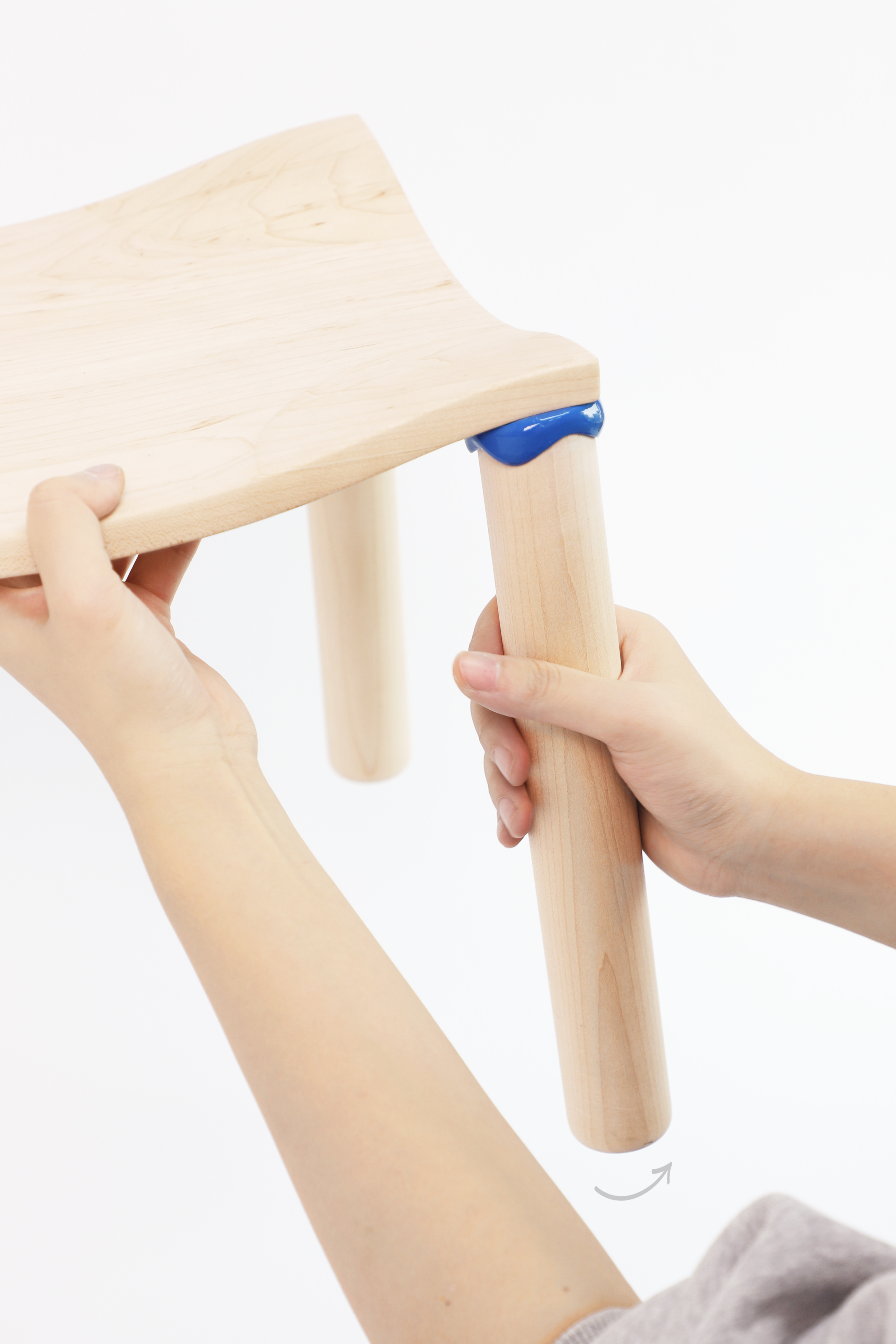 The metal washer emulates the fluidity of glue, enabling installation with a simple twist that mirrors the act of applying glue, transforming assembly into an intuitive experience. This process not only secures the stool but also shapes the seat’s gentle curvature, naturally conforming to the body's contours for both comfort and elegance.