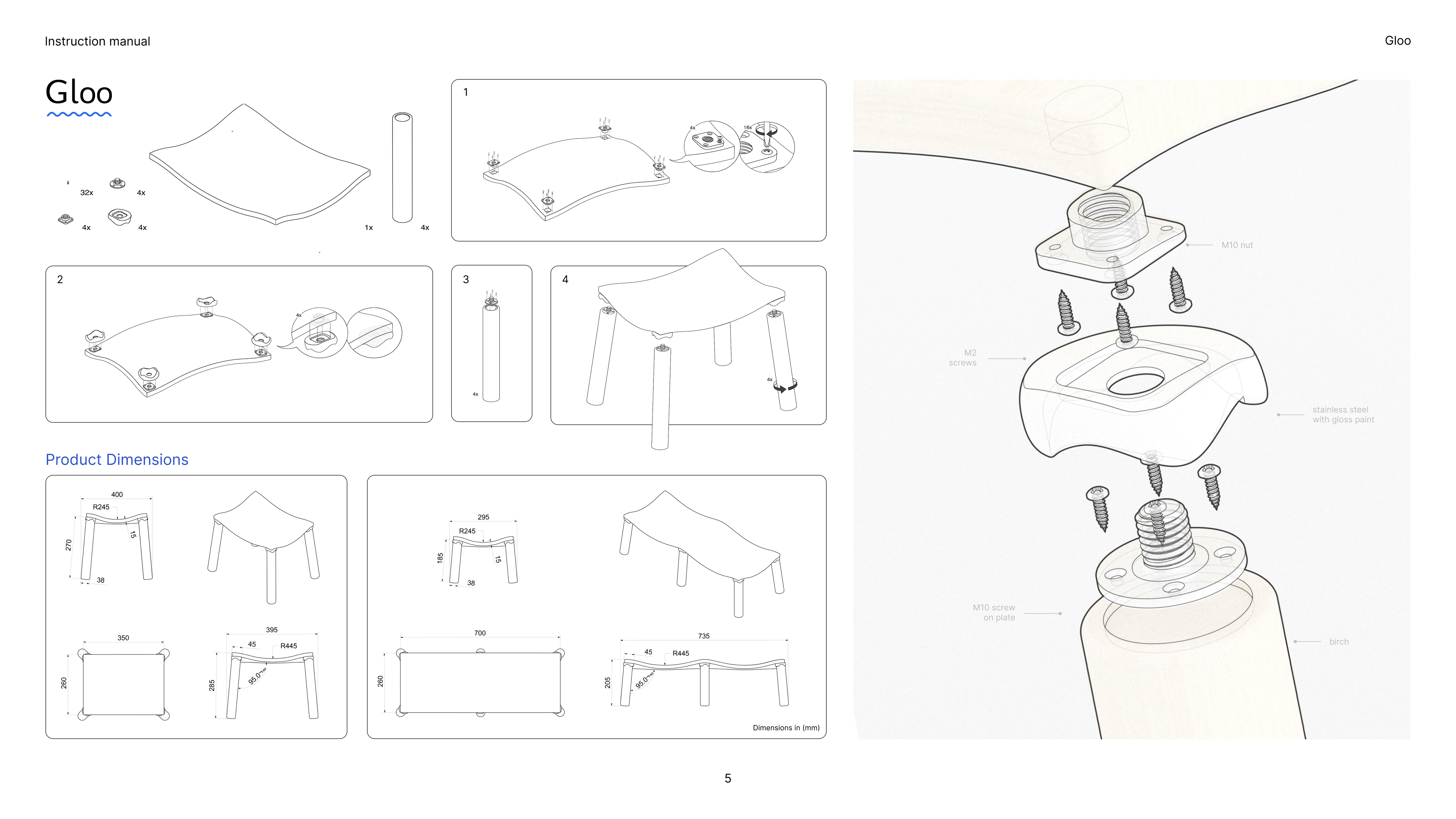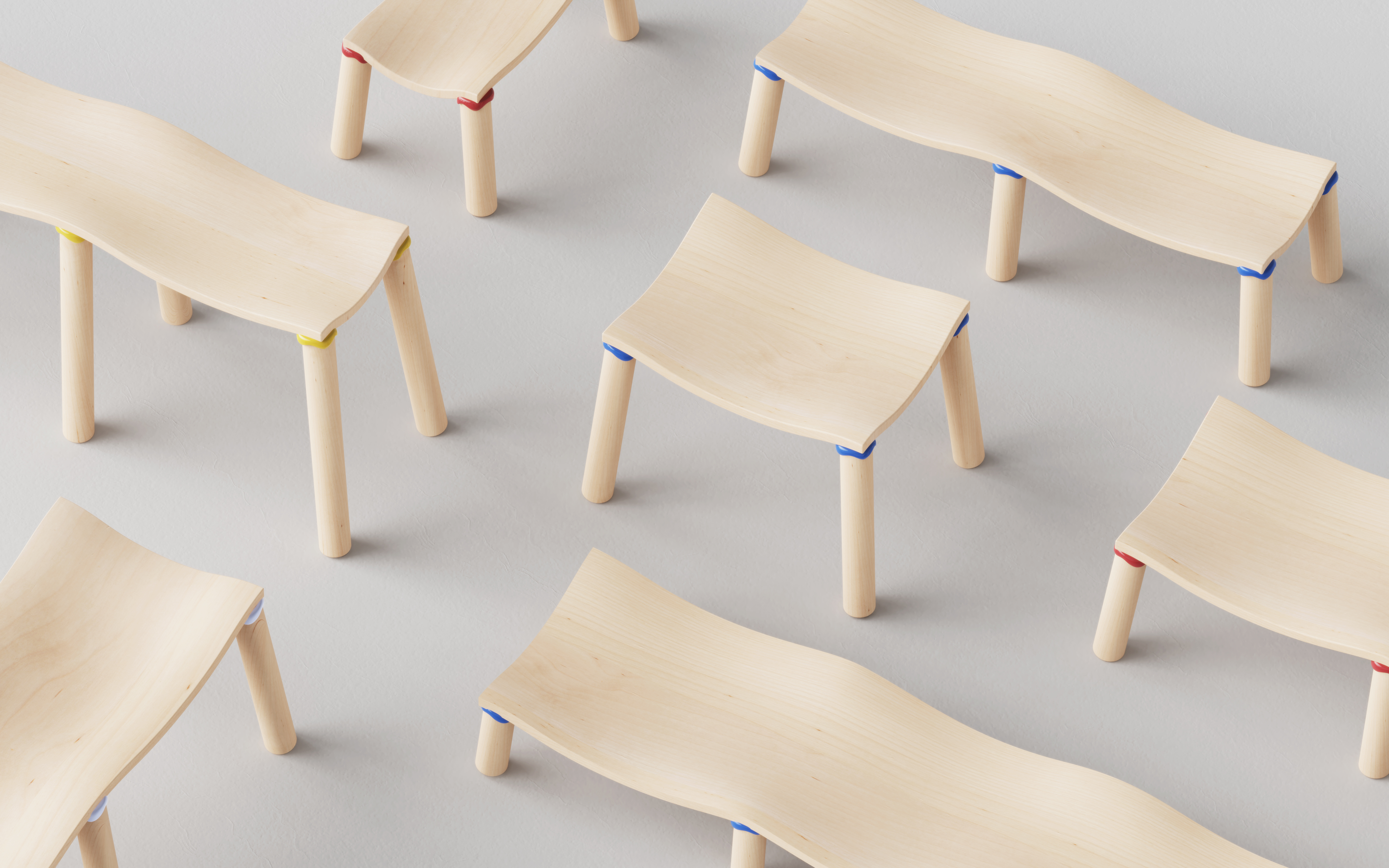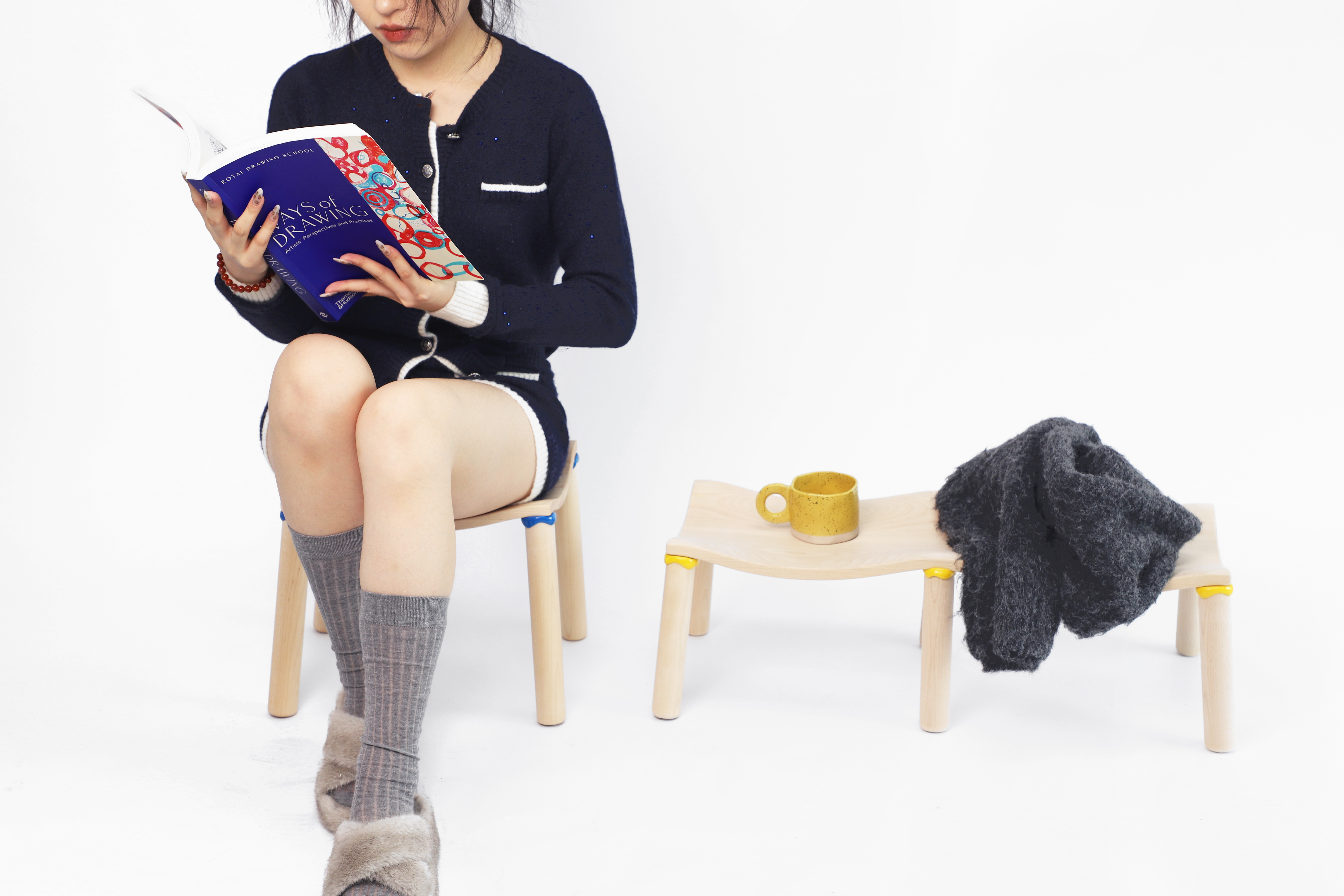 The metal washer emulates the fluidity of glue, enabling installation with a simple twist that mirrors the act of applying glue, transforming assembly into an intuitive experience. This process not only secures the stool but also shapes the seat’s gentle curvature, naturally conforming to the body's contours for both comfort and elegance.