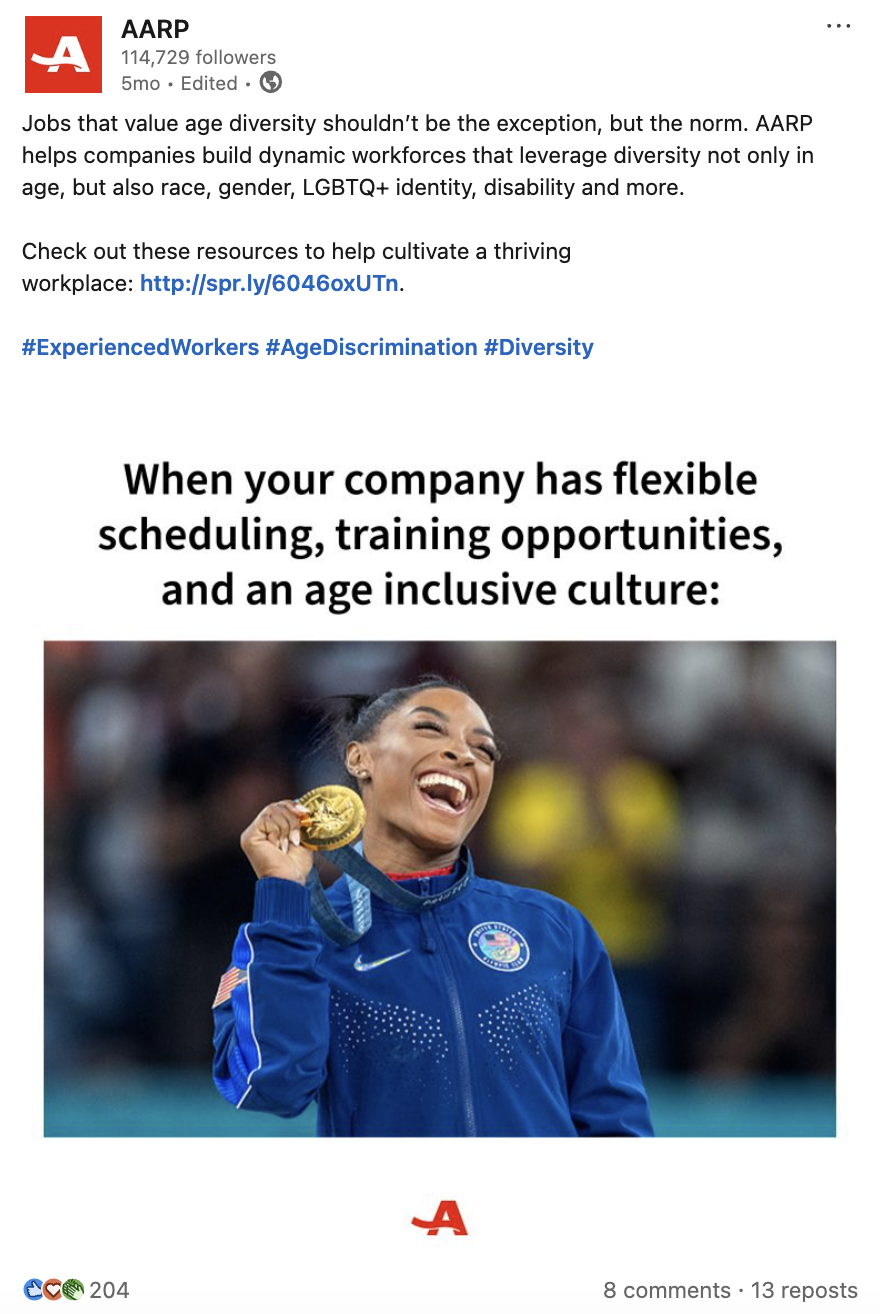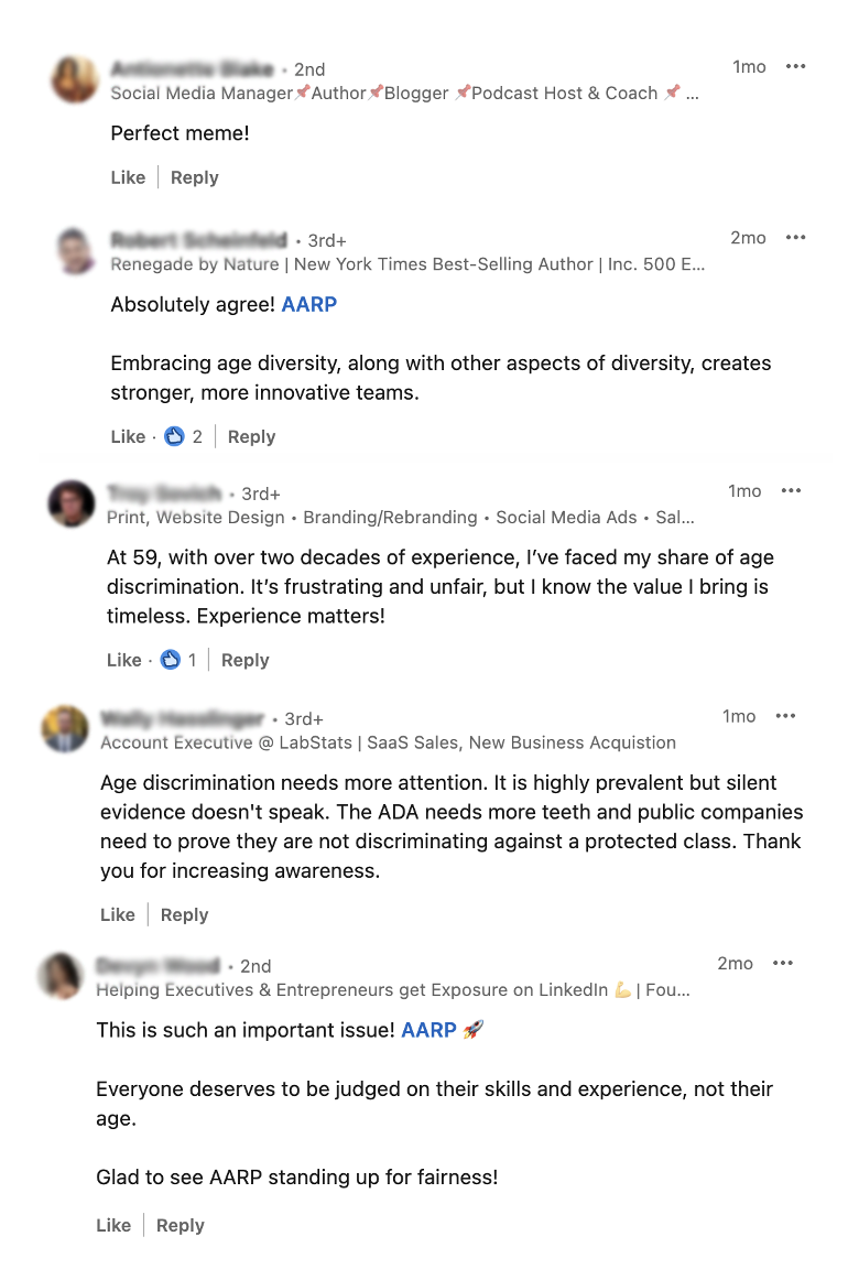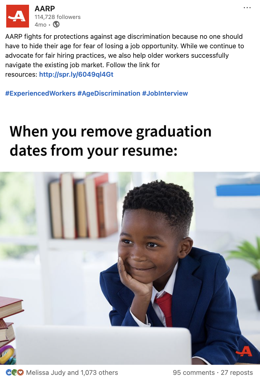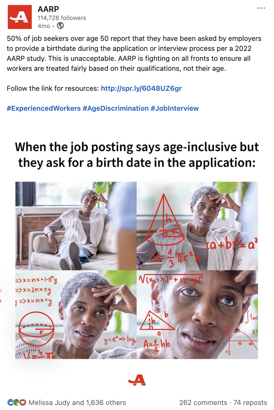 AARP's strategy on LinkedIn centers on addressing topics crucial to our vision for the future of work, such as building an age-inclusive and multigenerational workforce. A key tactic is the development of content and resources that empower older adults in the job market and further our efforts to combat workplace age discrimination.
