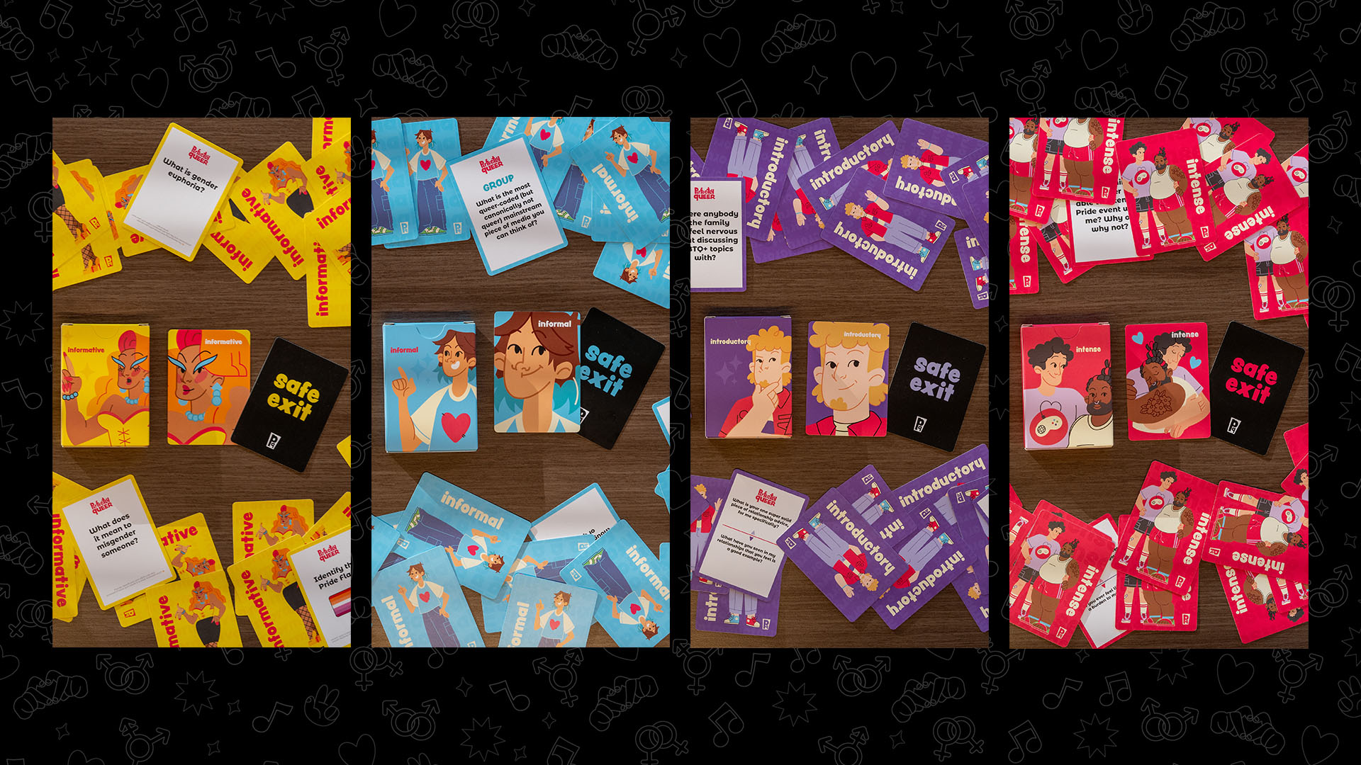 Designed from the ground up to make queer wellness conversations easier to start and less awkward to navigate. Gameplay includes original character illustrations and iconography developed to showcase the diversity of the LGBTQ+ community, as well as four color-coded conversation categories with unique tonalities and gameplay mechanics. With specific intersectional discussion prompts and a bilingual glossary designed to solve the unique challenges faced by multicultural queer youth.
