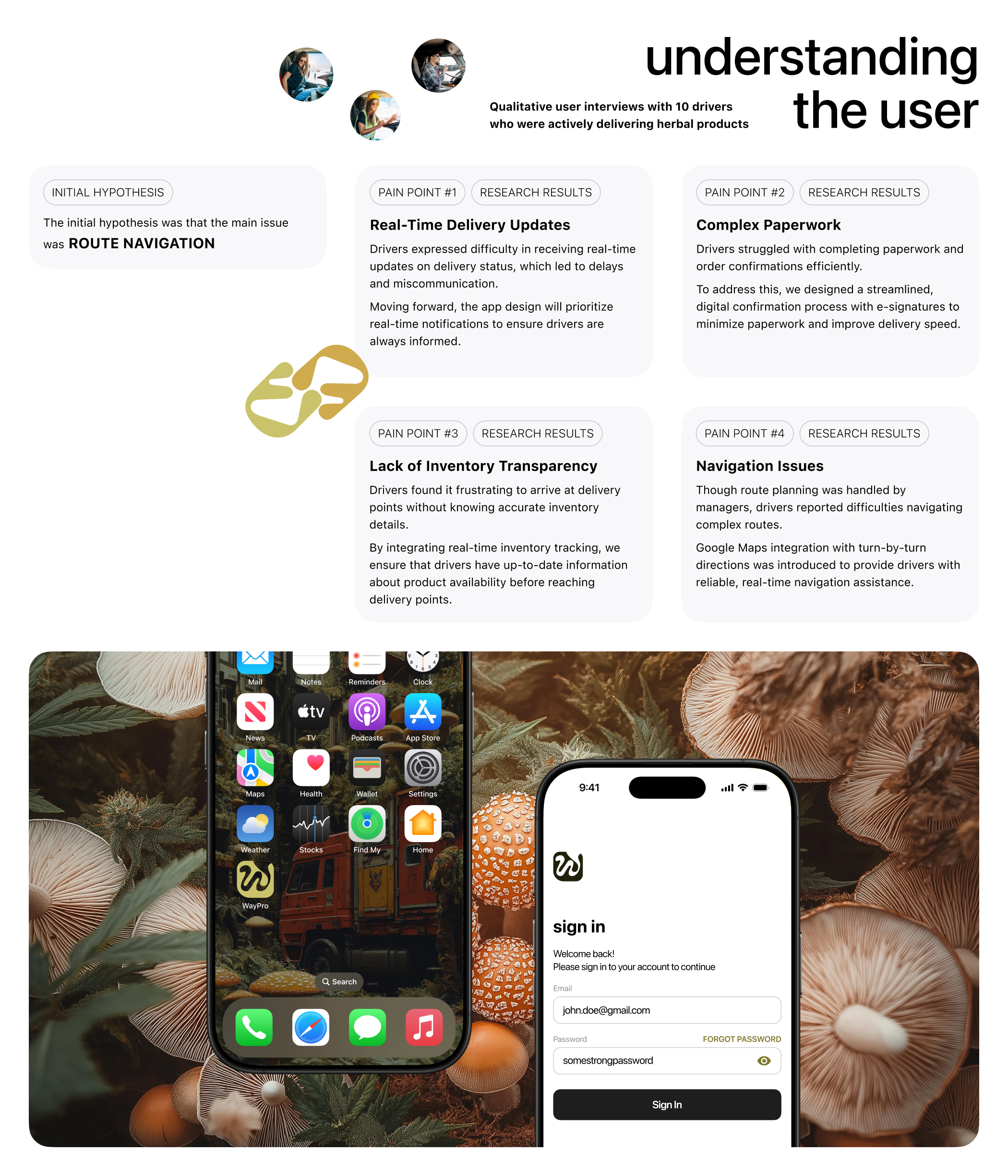 WayPro is a mobile app designed for drivers to streamline the delivery process of grass products from farms to consumers. The platform provides drivers with an intuitive interface for real-time route tracking, seamless delivery confirmation, and efficient communication with logistics managers. WayPro integrates all the necessary tools for drivers, reducing administrative hurdles, minimizing errors, and enhancing operational efficiency. With features like automated signature collection and digital document management, the app not only makes the driver’s job easier but also reduces environmental impact by optimizing routes and lowering fuel consumption.