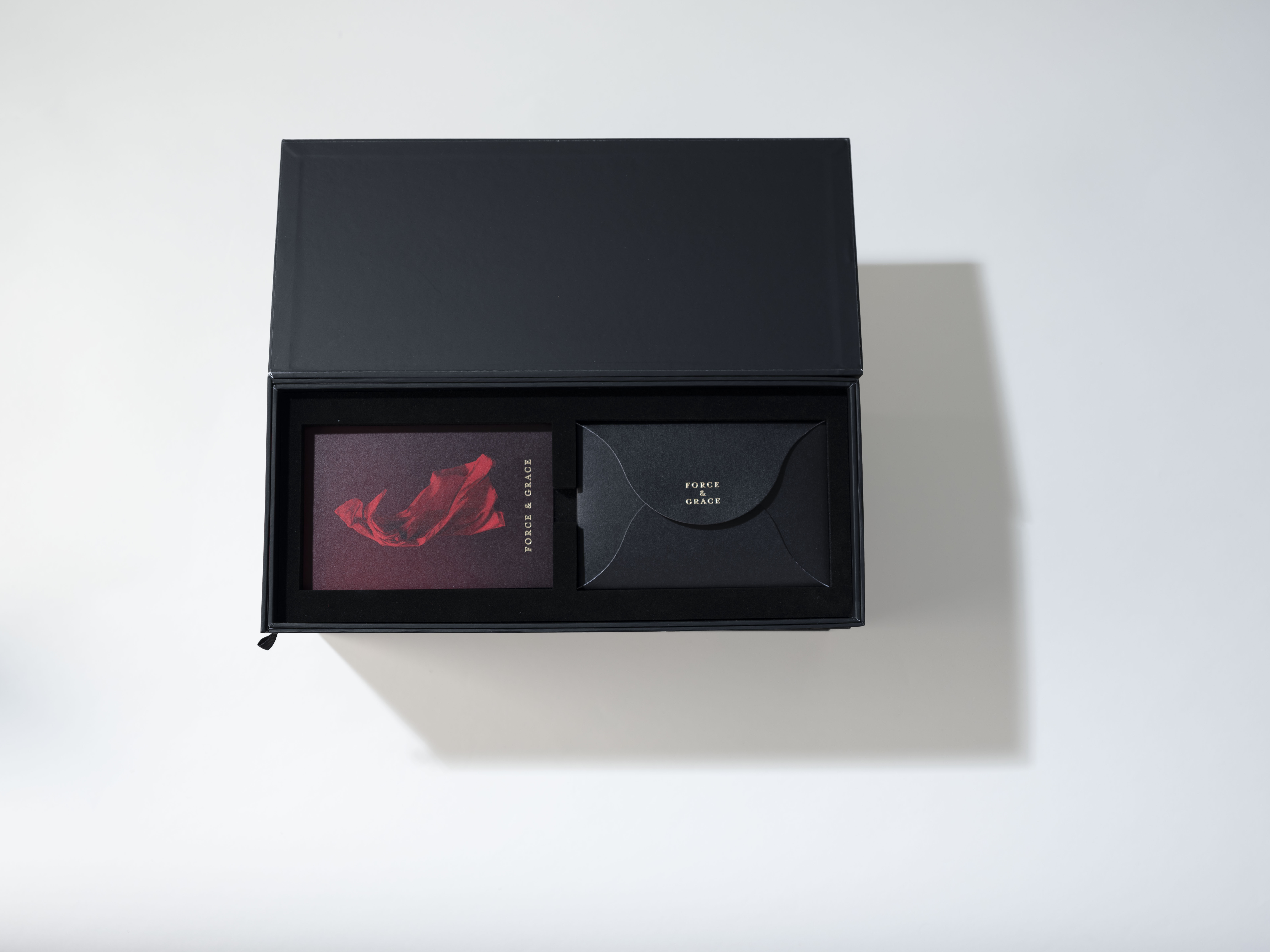 Introducing the Selling Brand Kit: a sophisticated presentation complete with a luxurious insert for the bottle, a captivating print featuring the essence of Force & Grace, and a personalized touch with the photographer's signature. By intertwining texture, fabric, and movement, we mirrored the beauty of Force & Grace's wine in every aspect of the packaging.