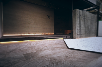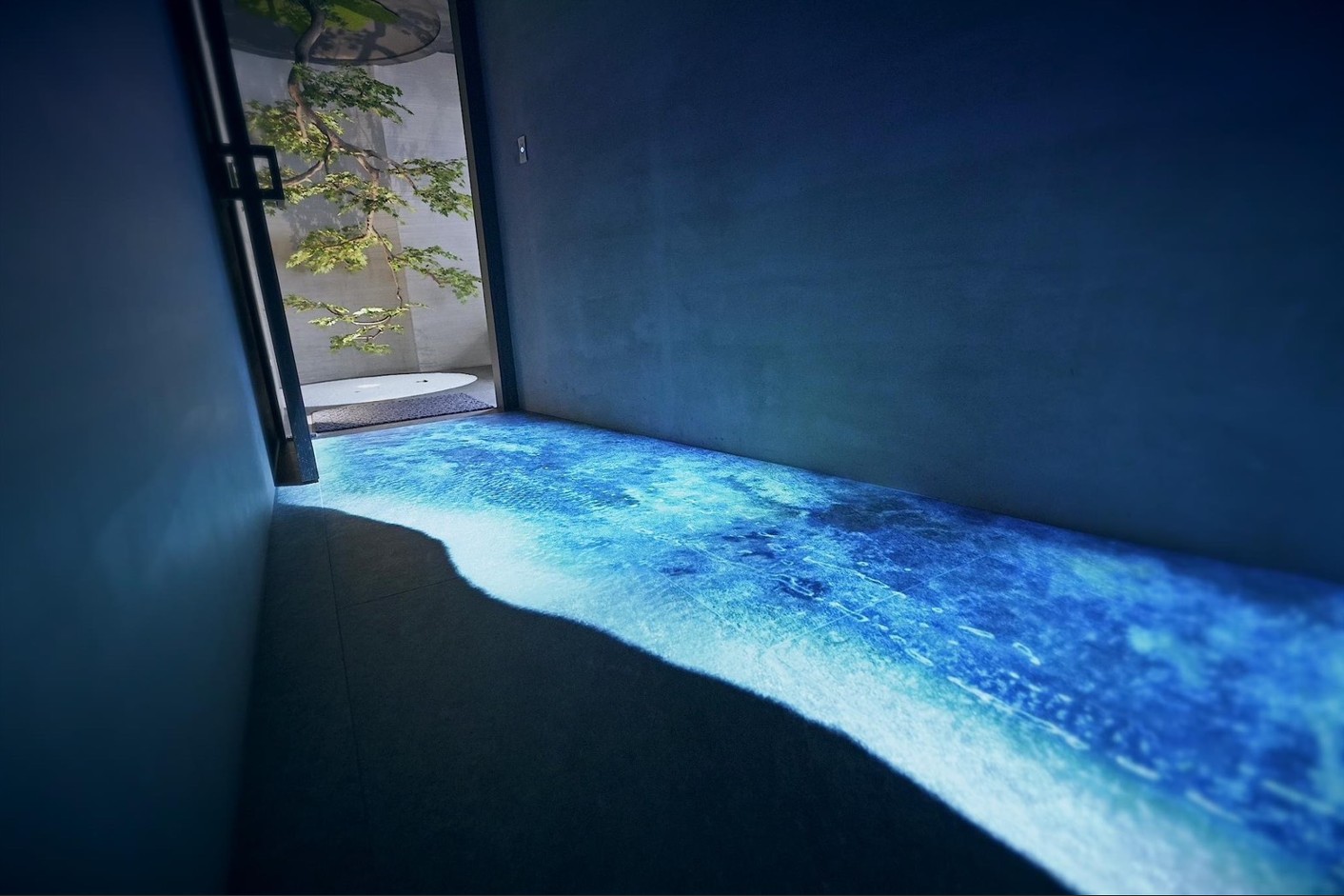 此作品融合了沉浸式燈光投影與極簡室內設計風格,營造出獨特的用餐體驗。透過沉浸式投影技術,將廊道空間化為動態畫布,模擬海浪的光影變化,使體驗者宛如沉浸漫步在海邊。投影內容隨著時間推移變化,呈現波光粼粼的海面,讓客人在用餐前,將情緒沉澱下來,跳脫現實。