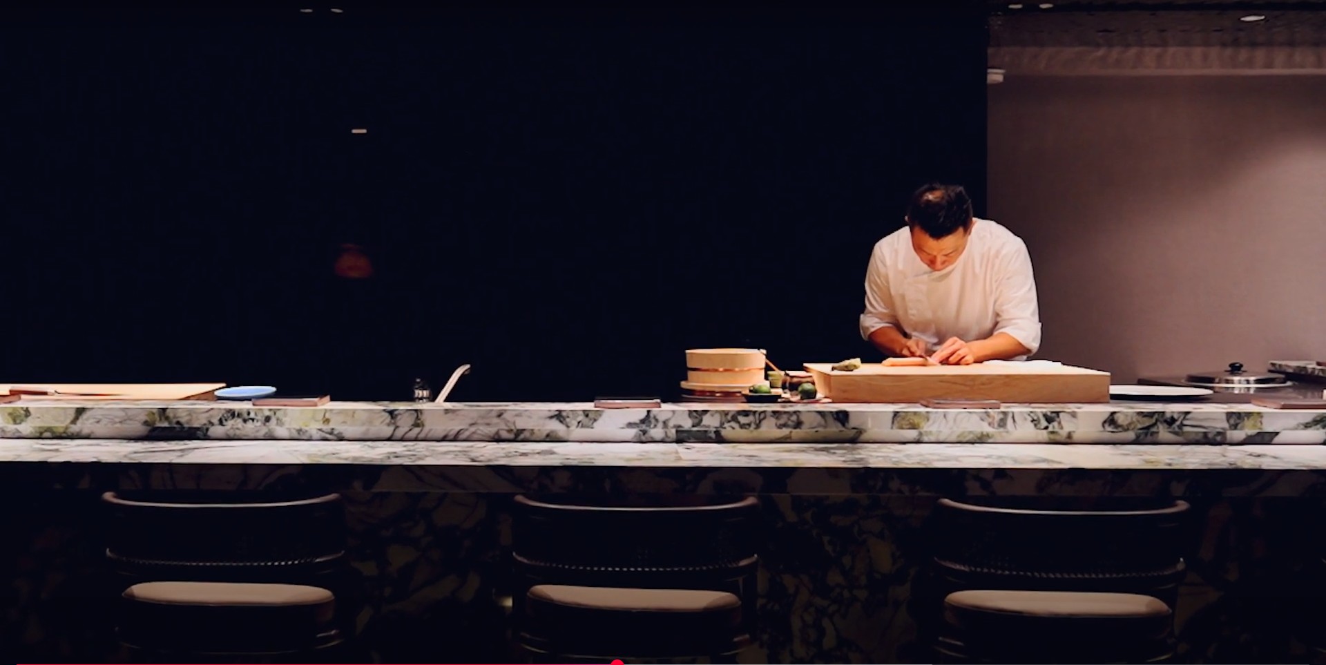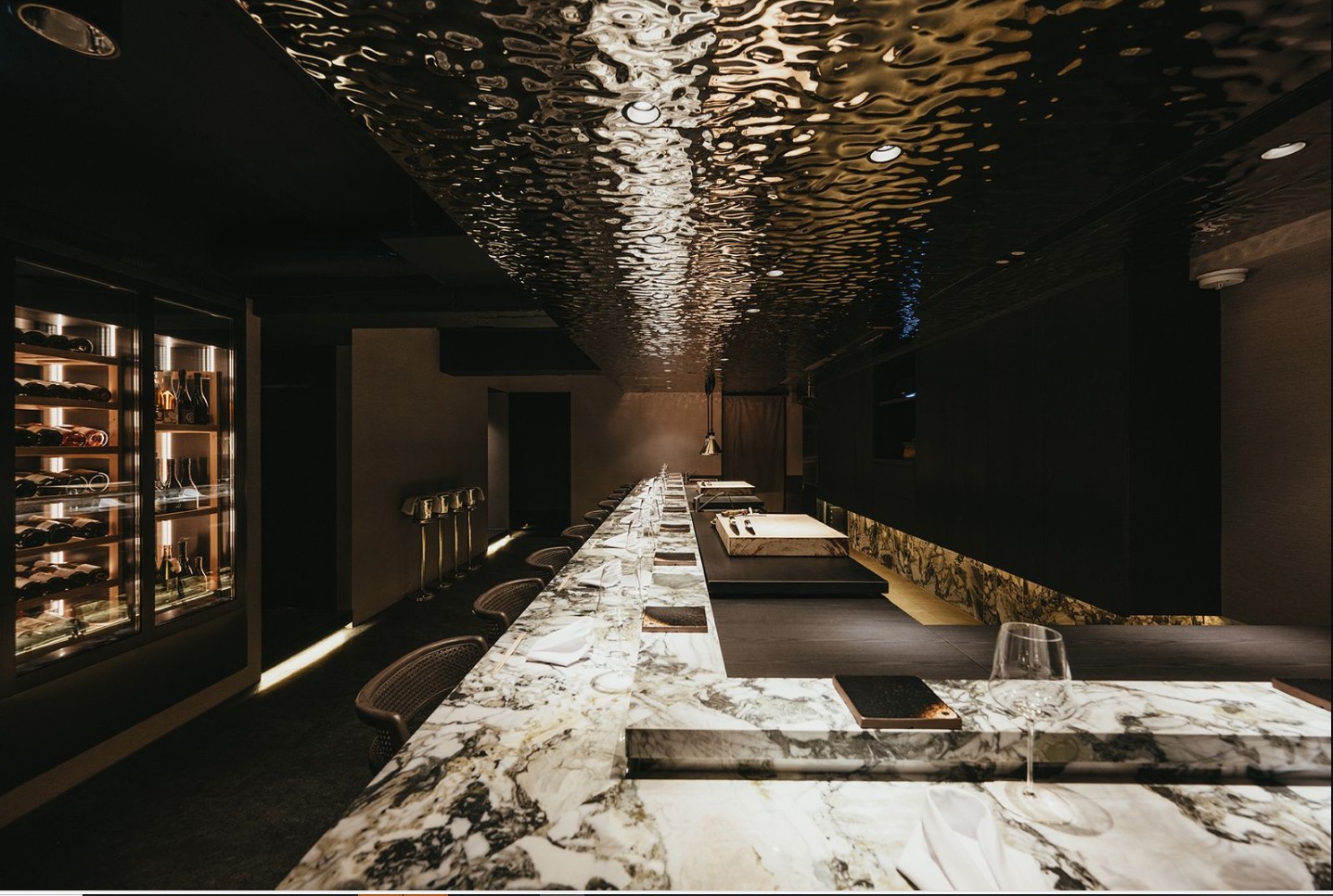 燈光設計上,餐桌區的照明特別強調「劇場式」氛圍,以點狀聚光方式突顯每一道料理,讓食材成為視覺焦點,同時避免過多光源影響沉浸感。整體空間的燈光與投影完美融合,使每位客人都能在視覺、聽覺與味覺的多重感官交錯下,享受一場獨特的低奢體驗。