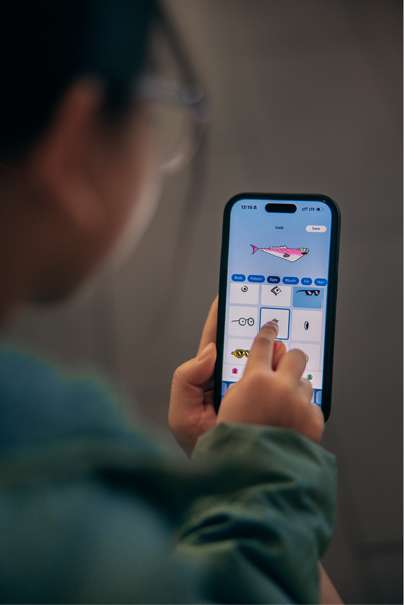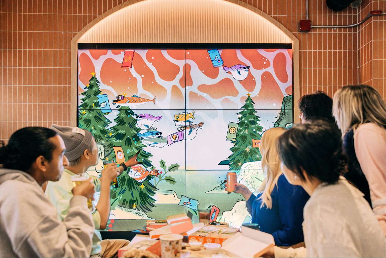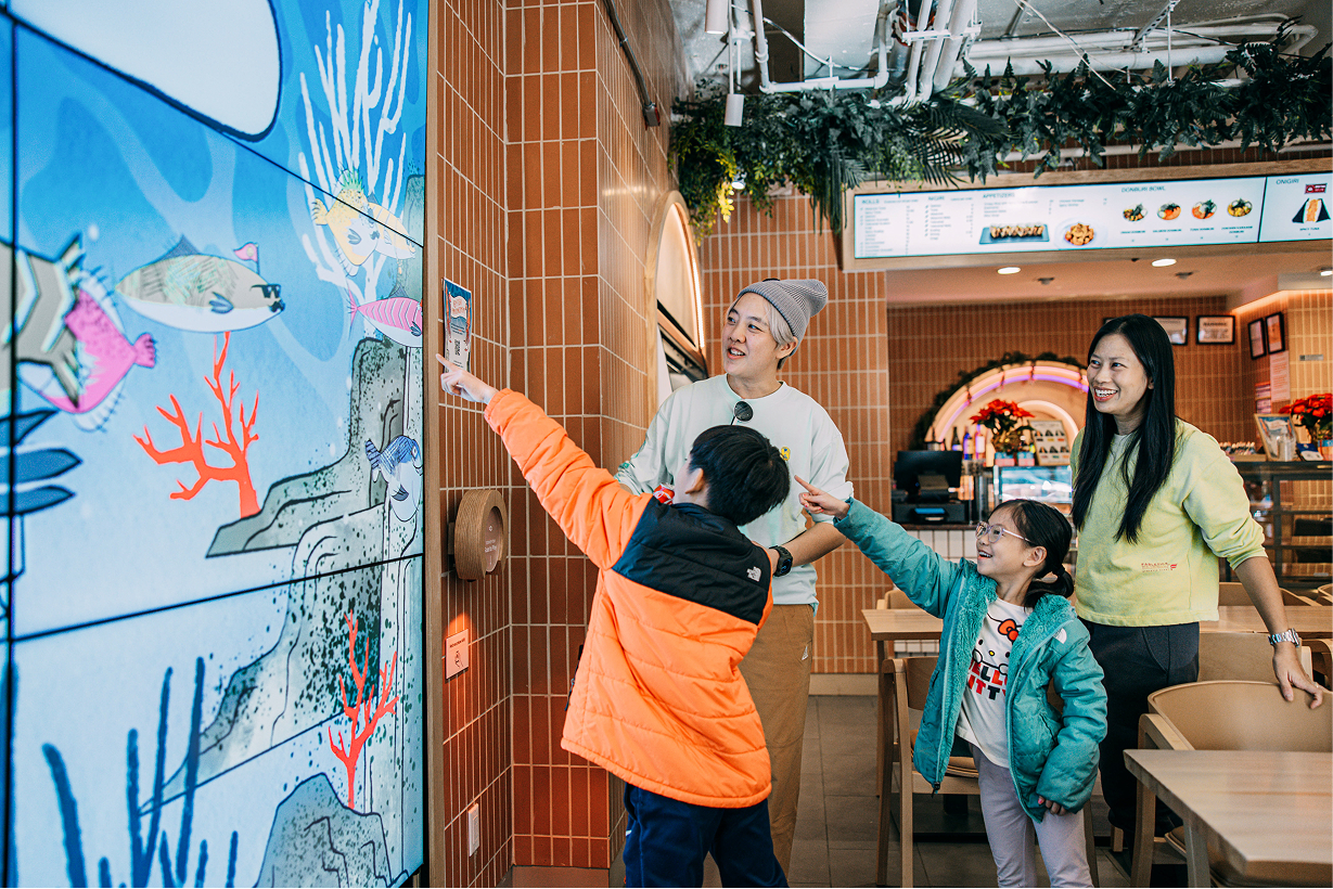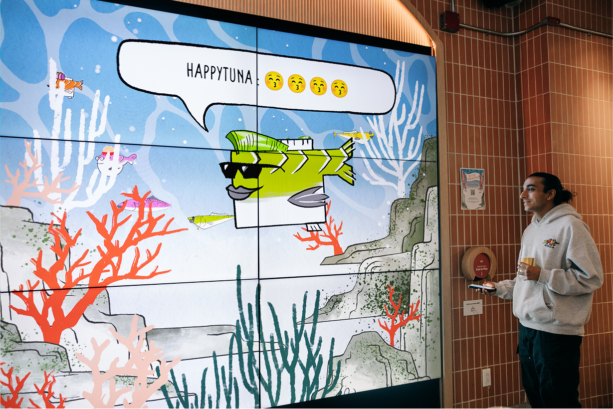 Hey Fish! is an exciting in-store interactive experience at Happy Tuna’s NYC flagship, designed to make dining more engaging. This gamified reward program allows customers to create their own digital fish, launch it onto the restaurant’s large LED wall display, and participate in fun activities such as lottery for coupon, fish decoration and other rewards.
