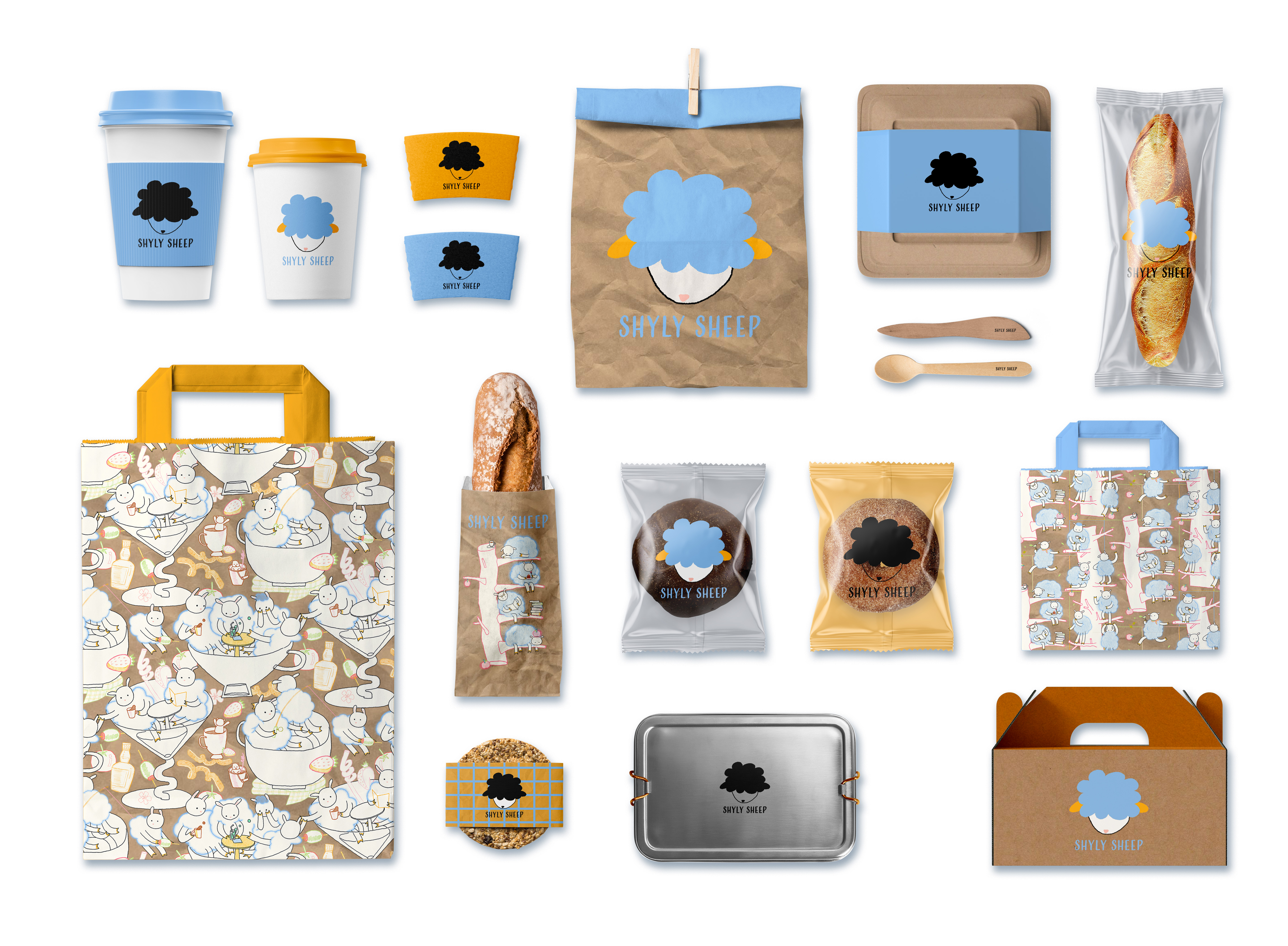 To reinforce this lighthearted pastoral vibe, two custom pattern designs incorporate sheep, coffee cups, apples, and wine glasses, extending the brand’s visual language throughout every touchpoint. These patterns appear on mock-up merchandise—such as pen pouches, tote bags, hats, and aprons—tying everything together into a cohesive brand system. Each item maintains the cute, inviting spirit of the main illustration, ensuring the café’s identity is both functional and endearing.