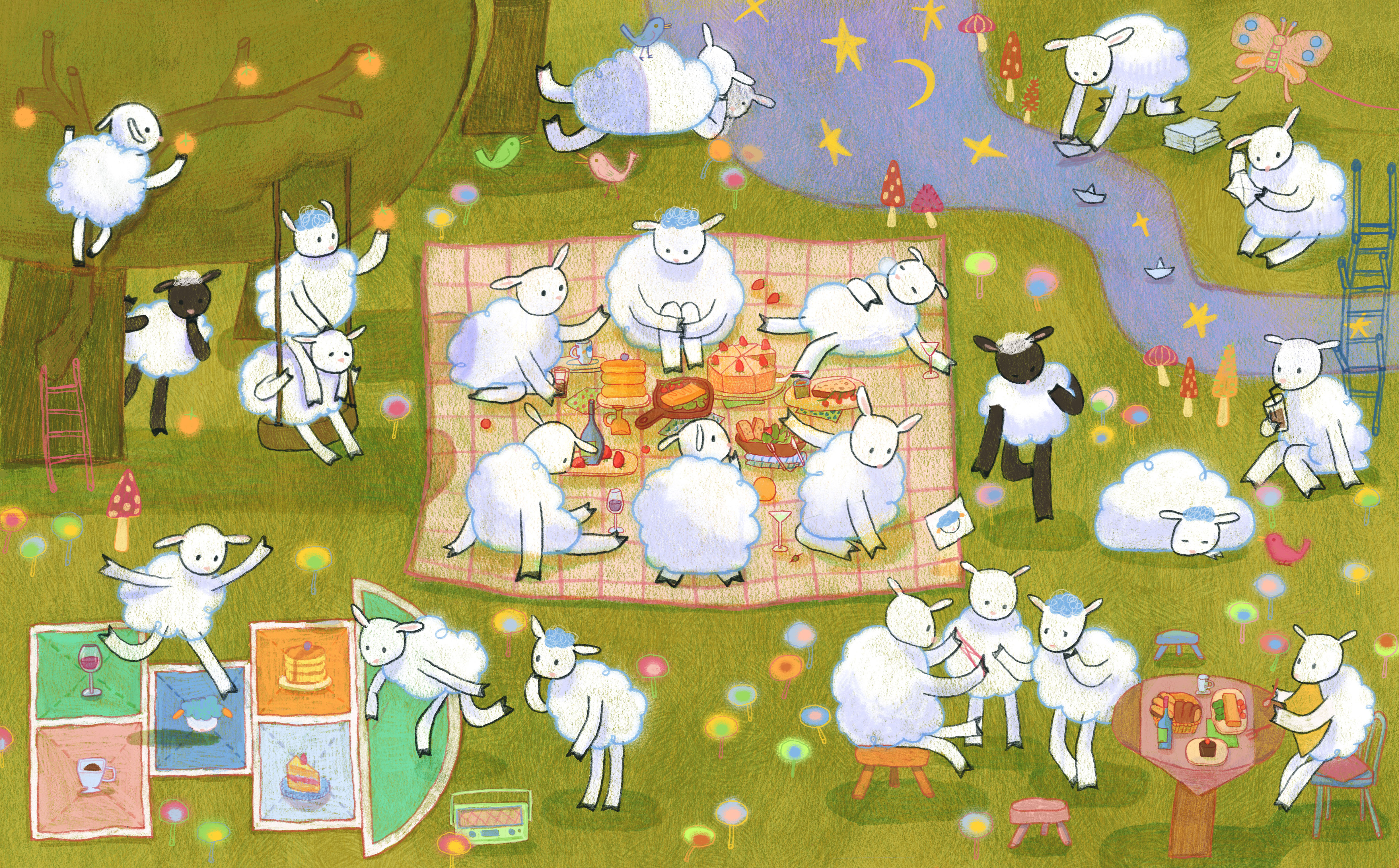 Set amid rolling green meadows, the main illustration features this cute sheep savoring the café’s signature dishes—omelets and apple salad—alongside coffee, wine, and sweet treats, all woven together to convey comfort, freedom, and self-enjoyment. The soft, pastel color palette and expressive line work create a warm, dreamy atmosphere that encourages customers to pause, breathe, and savor life’s simpler pleasures.