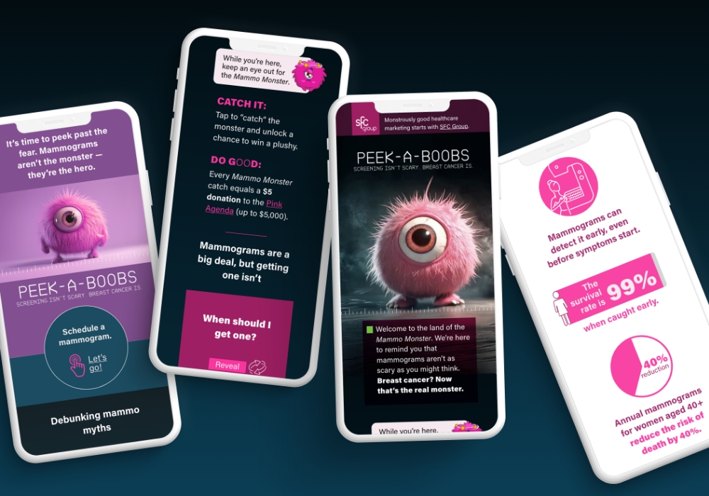 The print execution included posters, direct mail, and educational materials, all reinforcing the “Catch the Mammo Monster” activation and the importance of yearly screenings. The high-contrast visuals, oversized typography, and cheeky messaging made the campaign instantly recognizable, while the inclusion of “Peek-a-Boobs” — a playful headline designed to spark curiosity — helped grab attention and encourage women to learn more.