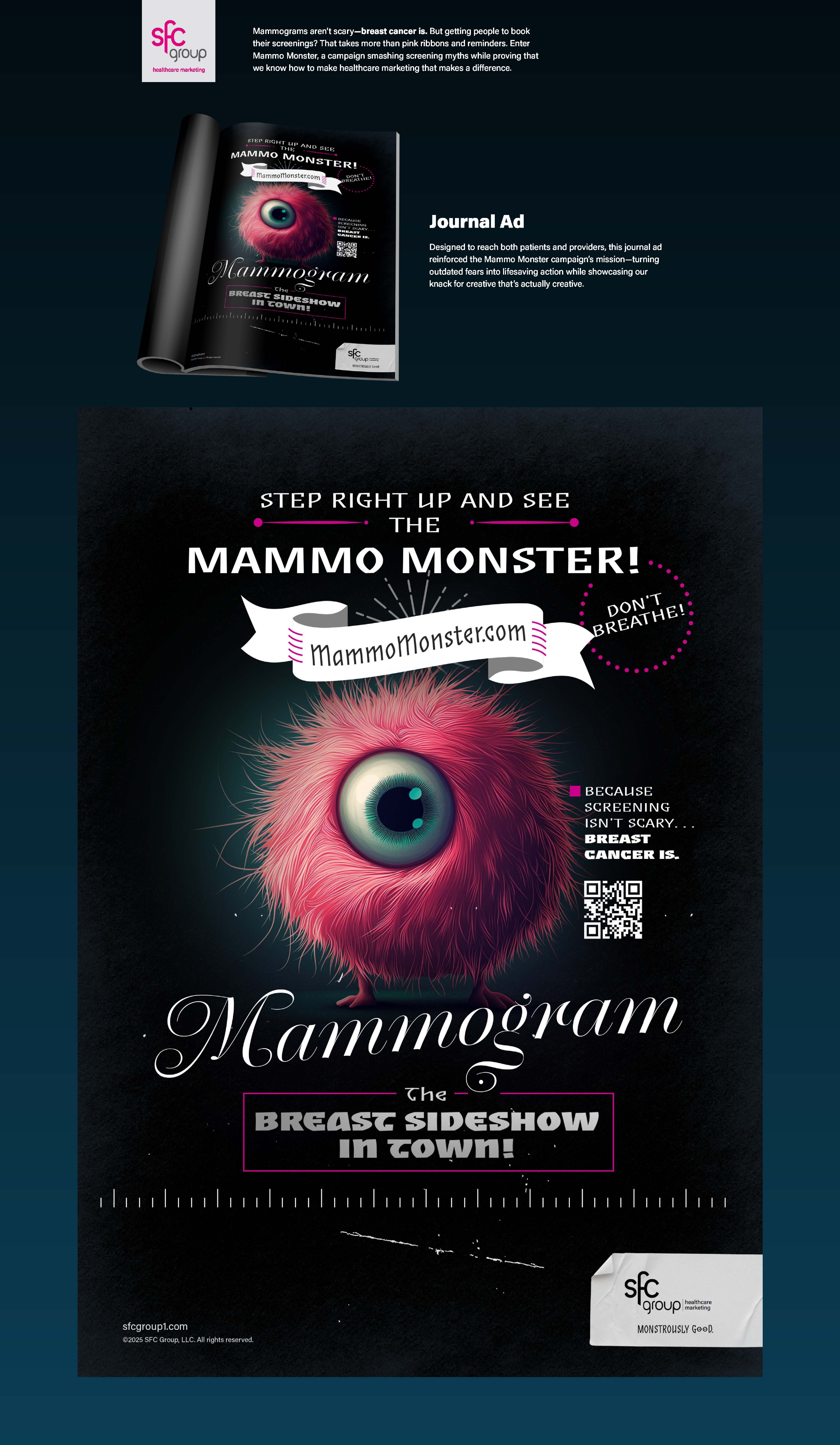 Beyond awareness, the print materials worked as engagement tools, driving traffic to MammoMonster.com, where visitors could access testimonial videos, a downloadable awareness kit, and an interactive activation to claim a real-life Mammo Monster plushie.