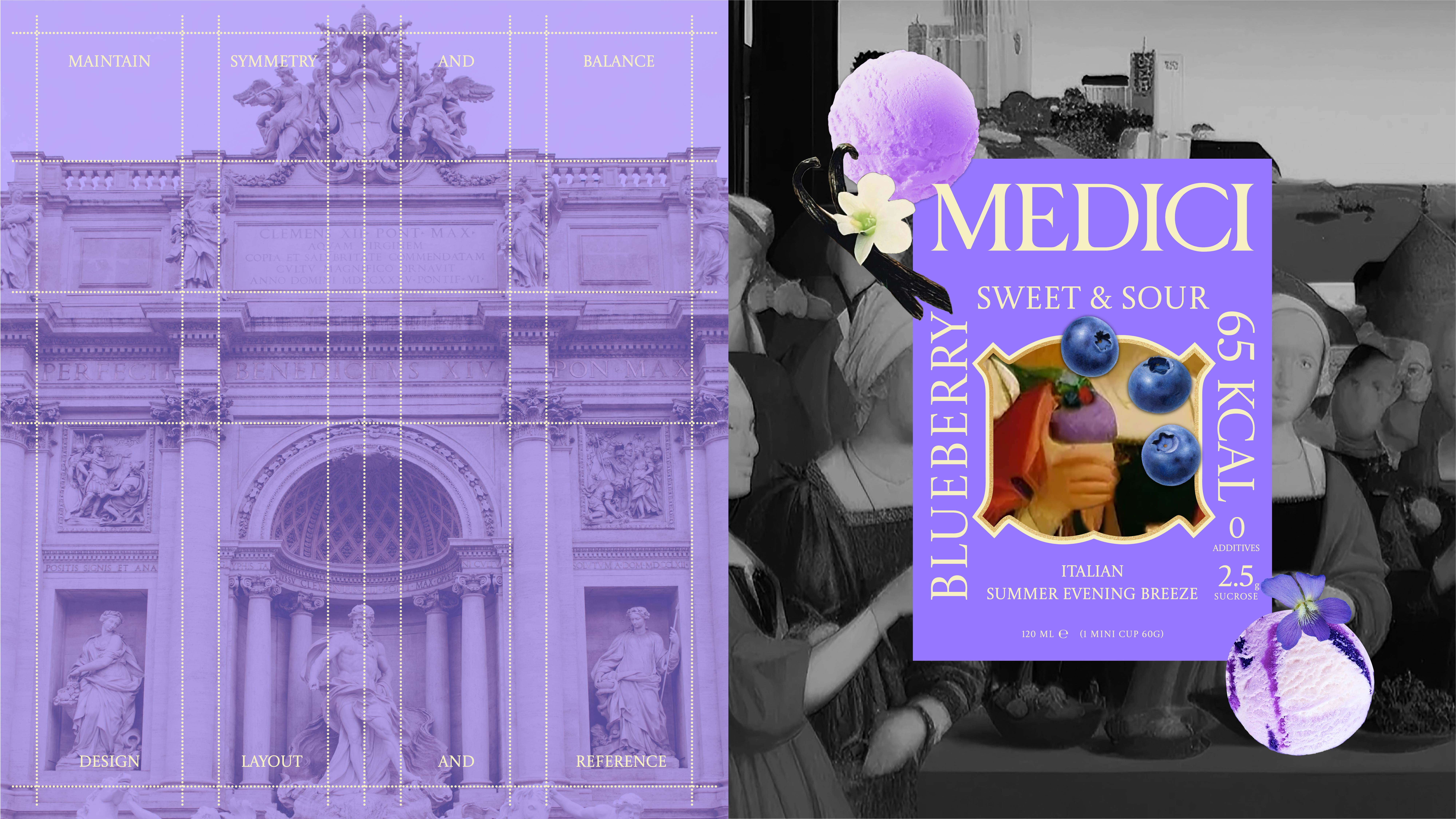 In Renaissance,Gelato was popular among the Medici family,and the brand not only paid homage to the Medici family but also inspired people to immerse themselves in the joyful atmosphere of Italian charm.We blend the composition method of "Iris",a Medici element,with modern creative vision,using elegant iris purple to enhance the brand's recognizability and visual expressiveness.
