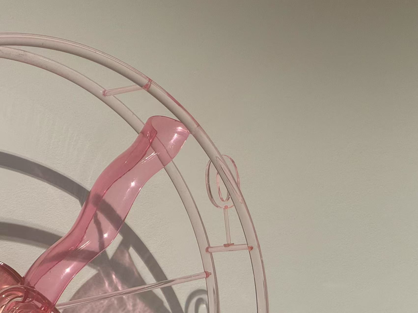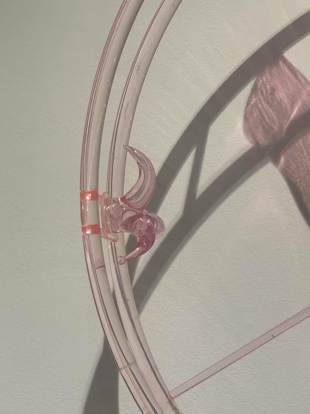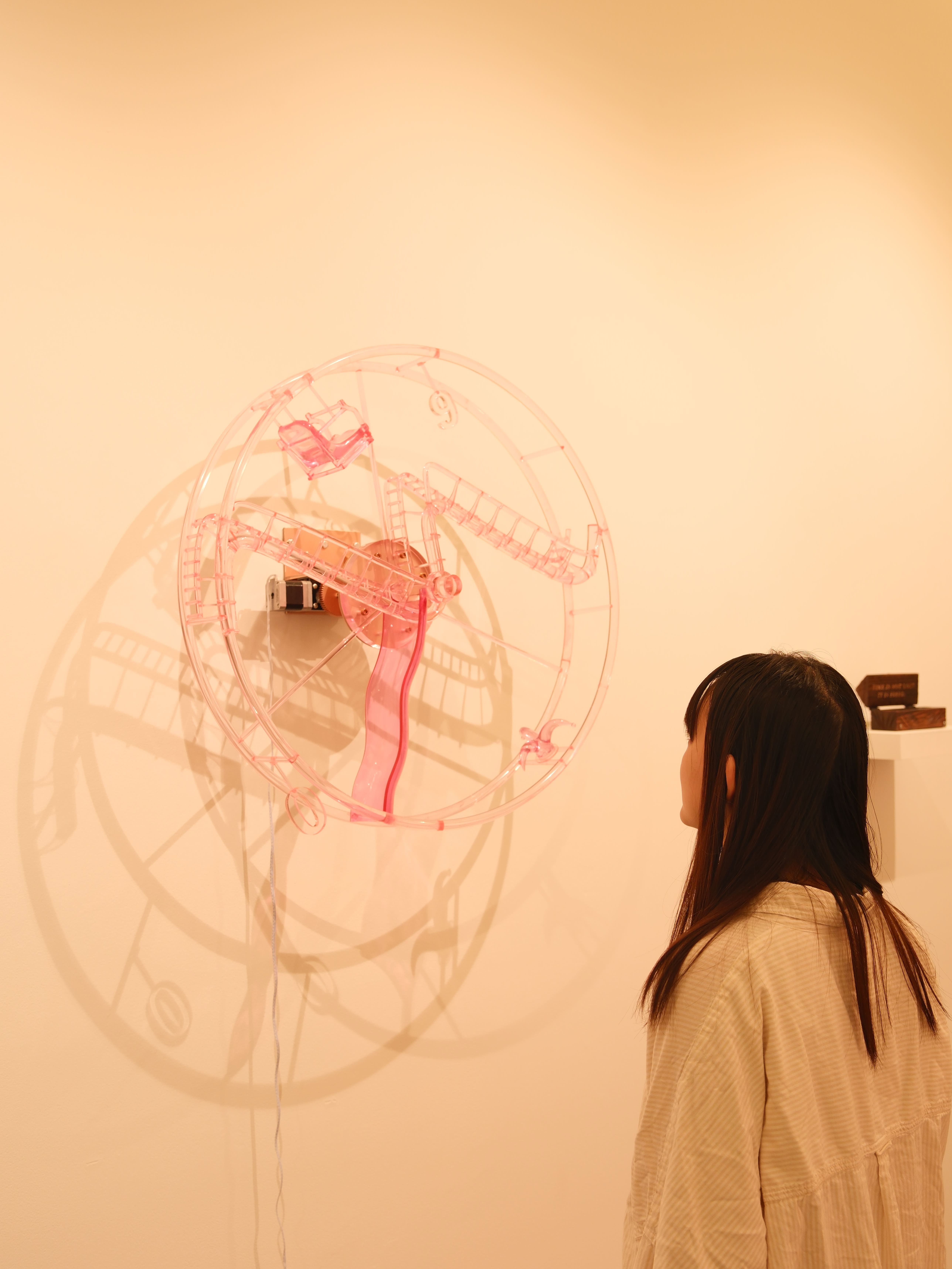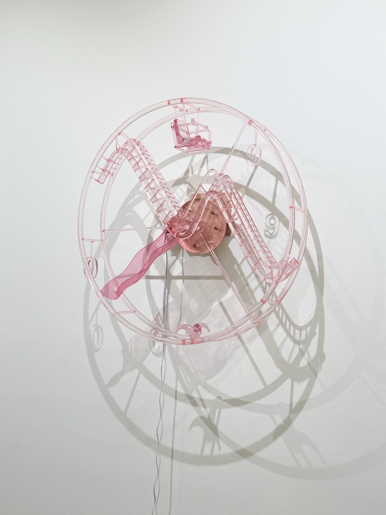 Fool's Hour is a 70-centimeter diameter wall-mounted Ferris wheel clock, constructed from 3D-printed transparent pink plastic. The work merges the forms of amusement park rides and traditional clocks but deliberately strips away the functionality of timekeeping. Inspired by the cultural phenomenon of clockless environments in amusement parks and casinos, the piece explores the absence of time perception in immersive experiences.