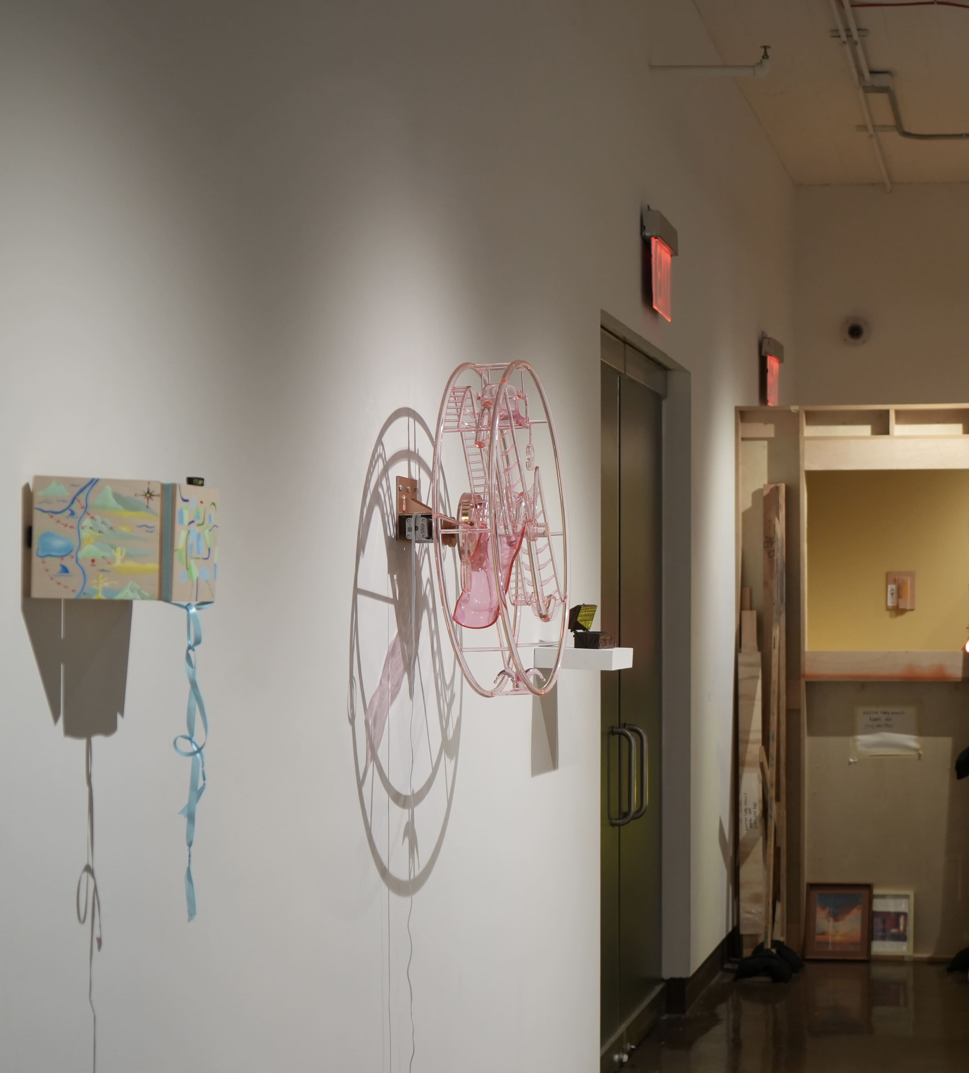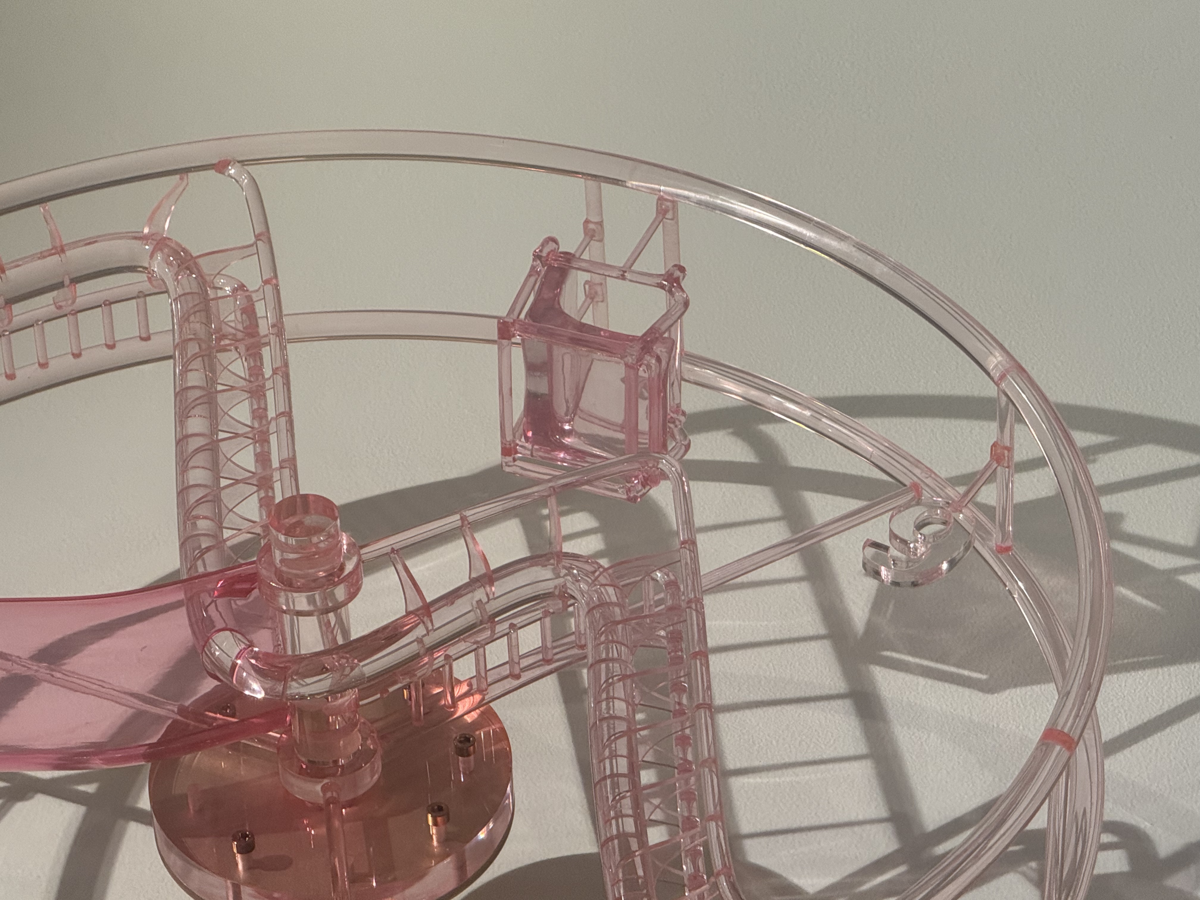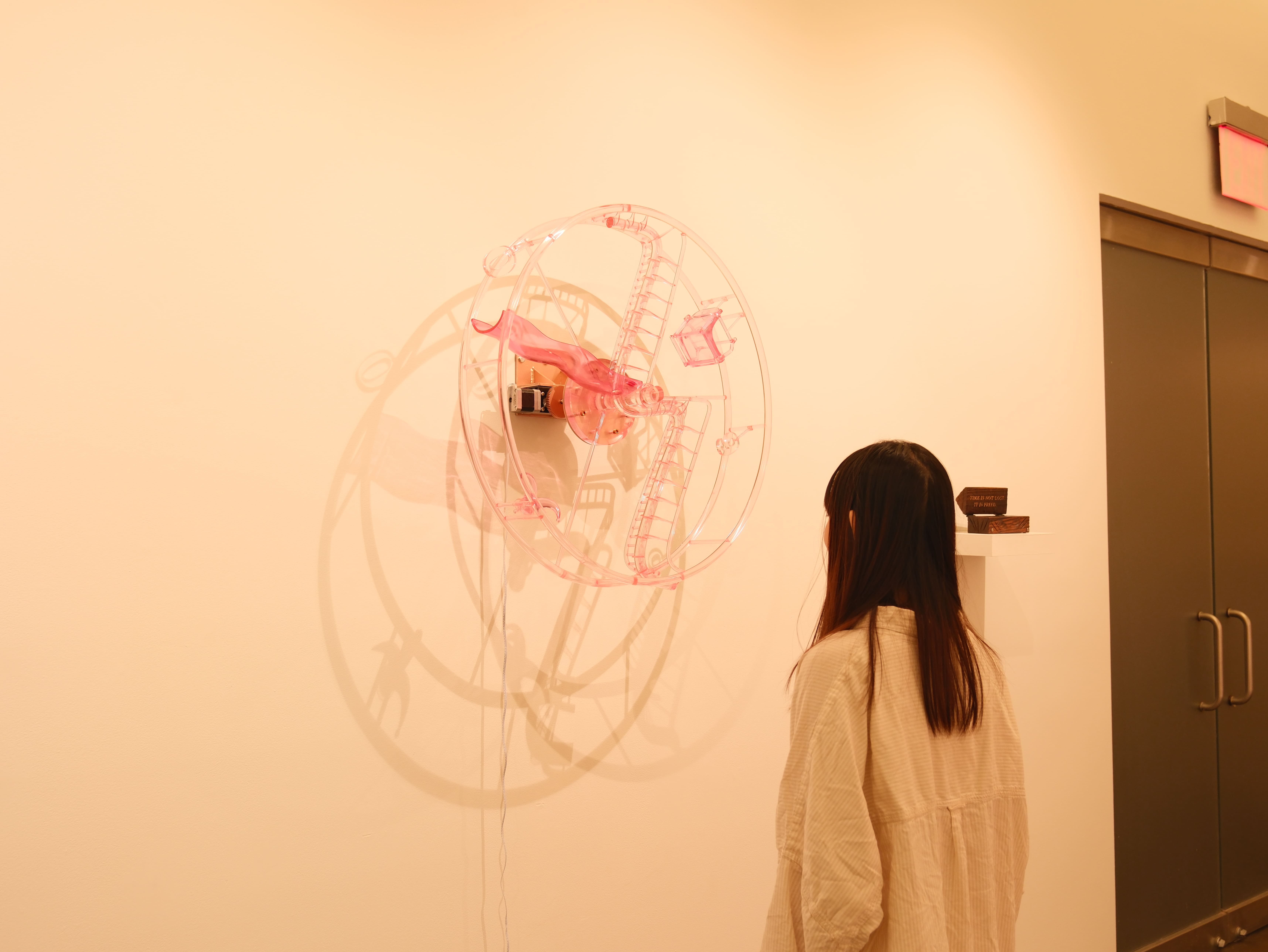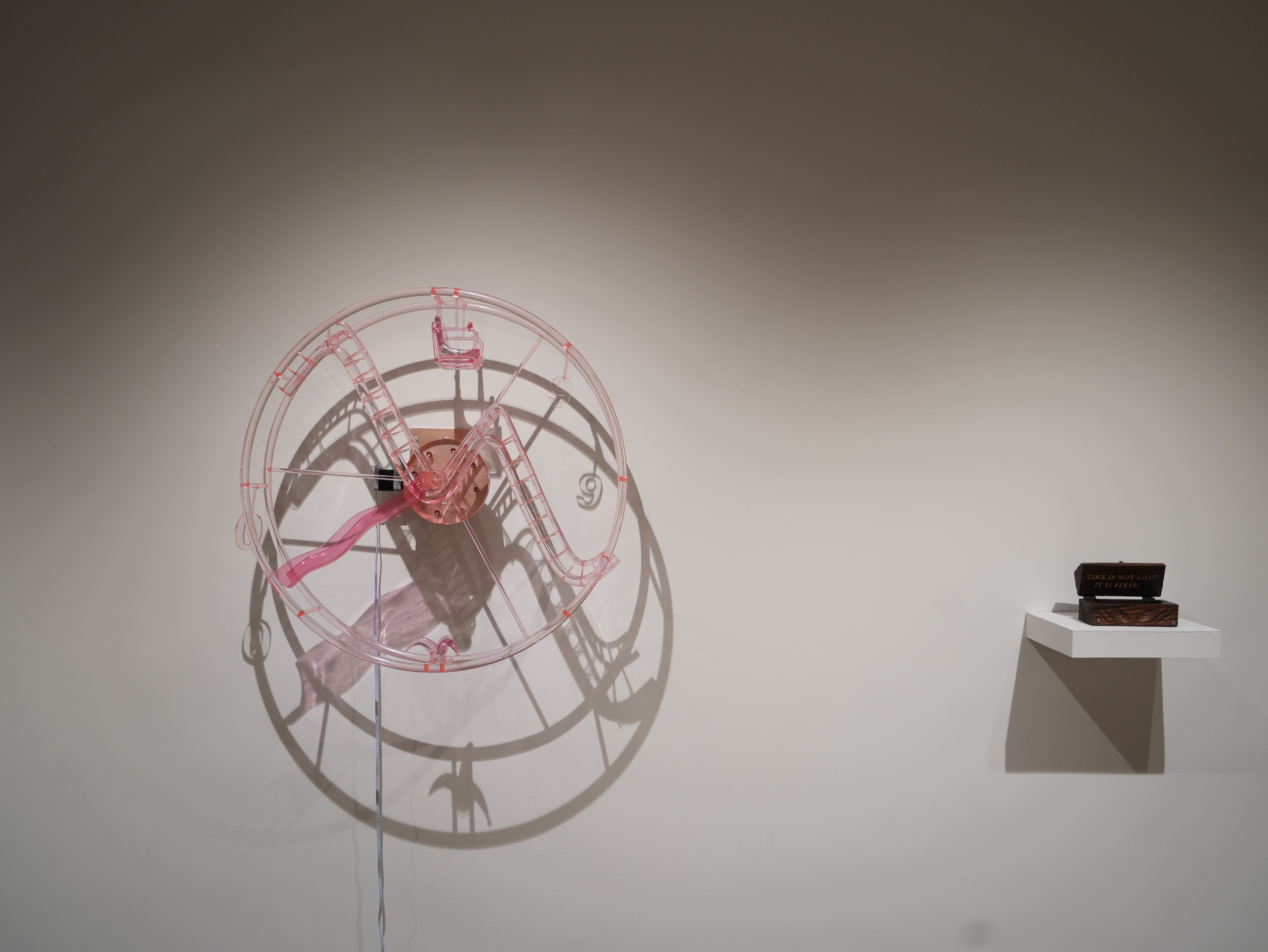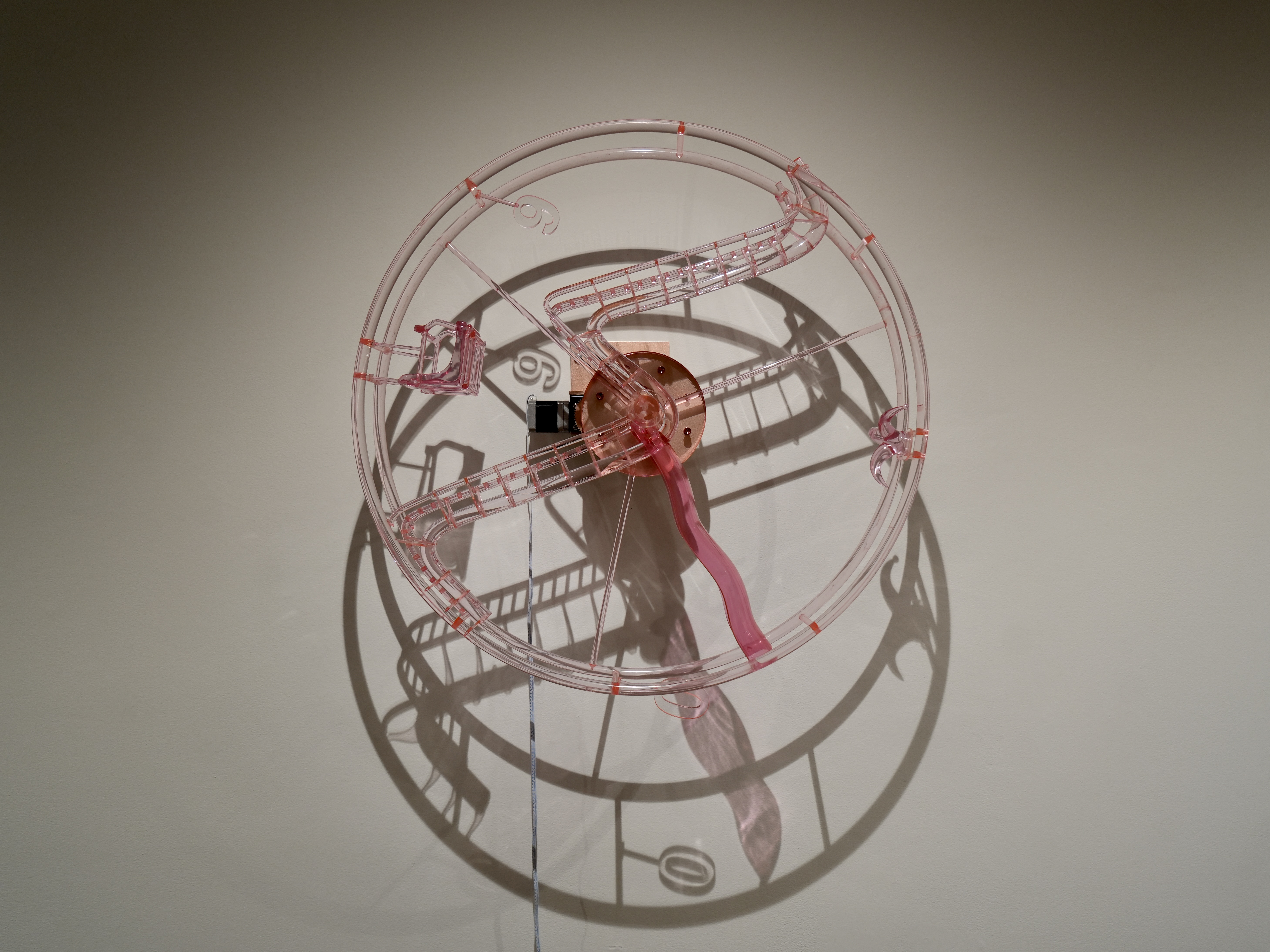 Fool's Hour is a 70-centimeter diameter wall-mounted Ferris wheel clock, constructed from 3D-printed transparent pink plastic. The work merges the forms of amusement park rides and traditional clocks but deliberately strips away the functionality of timekeeping. Inspired by the cultural phenomenon of clockless environments in amusement parks and casinos, the piece explores the absence of time perception in immersive experiences.