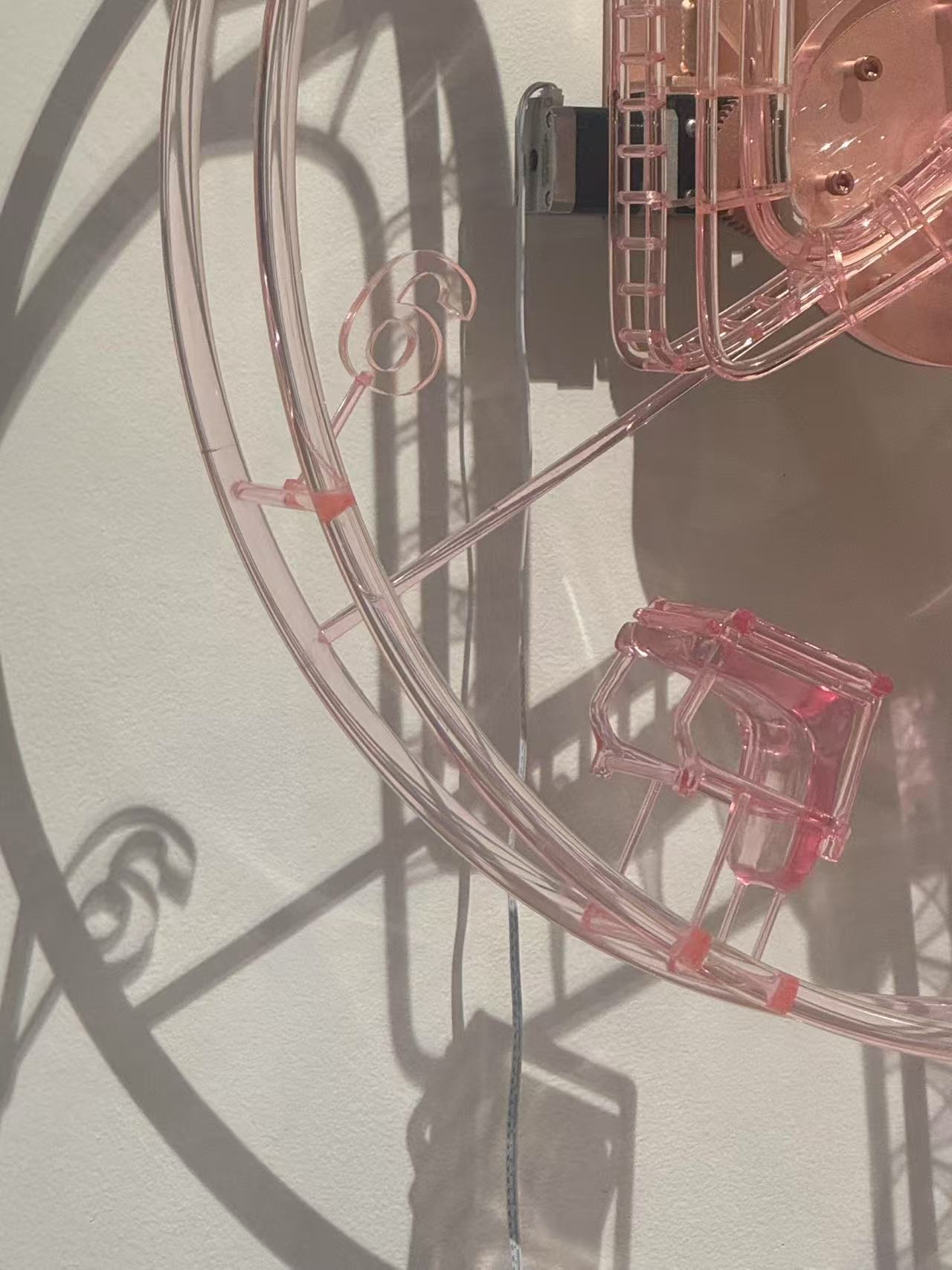 The transparent pink plastic offers a dreamy, lightweight visual effect, symbolizing the fluidity and fragility of time. Mechanically, the sculpture employs a brushless DC gear motor and synchronous belt drive system, enabling smooth, low-speed, and nearly silent rotation. This technical integration further enhances the immersive experience of time passing—slow, continuous, and quietly unfolding.