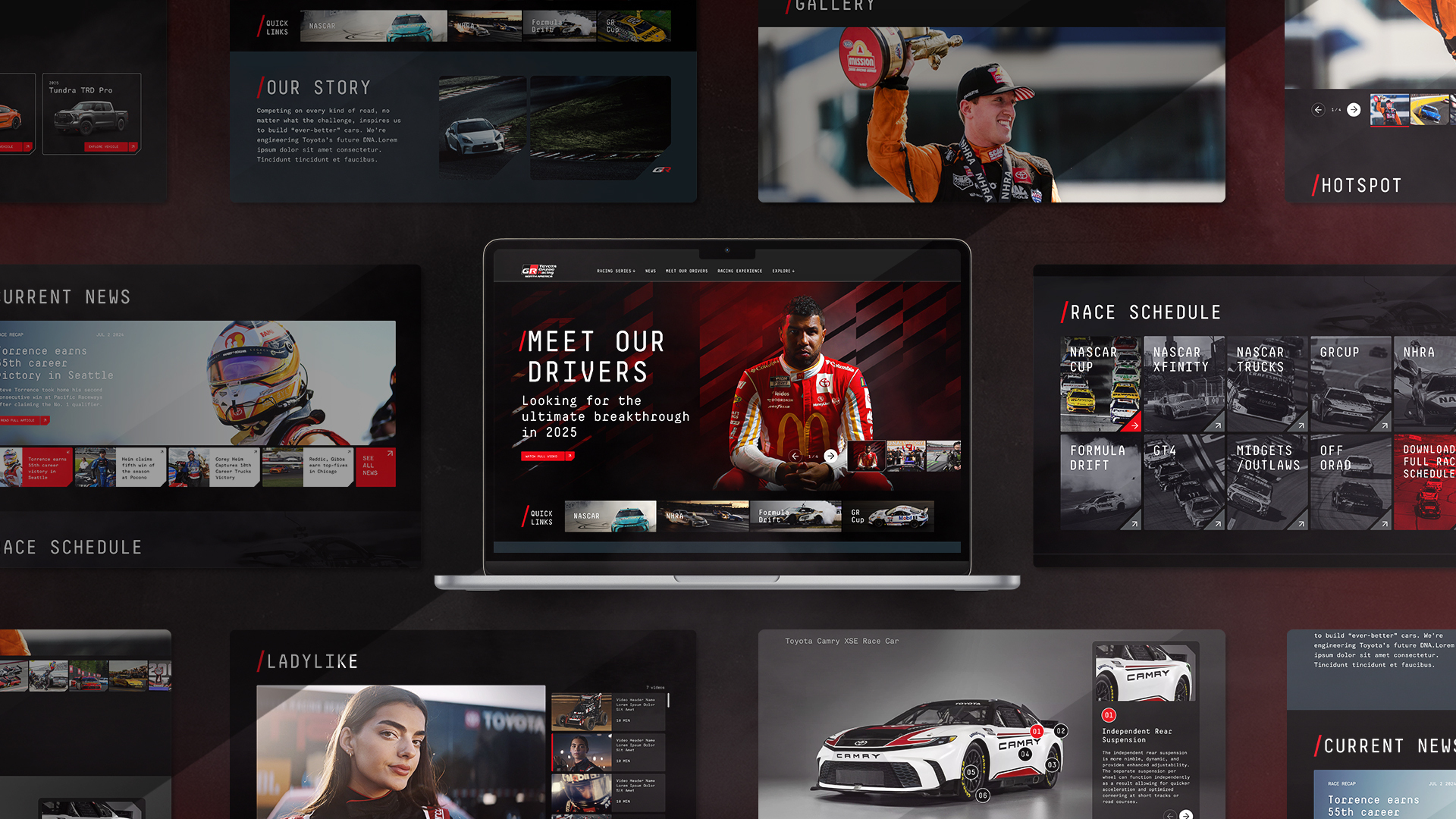 Stage3 Agency reimagines the Toyota Gazoo Racing (TGR) site within existing backend constraints, bringing bold new energy in line with TGR’s updated branding. Fast, intuitive, and responsive across every screen, the experience combines sharp contrast, red accents, and modular layouts to reflect performance and control. Confident, technical typography and immersive visuals put racing front and center. The result is a clean, modern take on the raw spirit of racing — refined, dynamic, and unmistakably TGR.