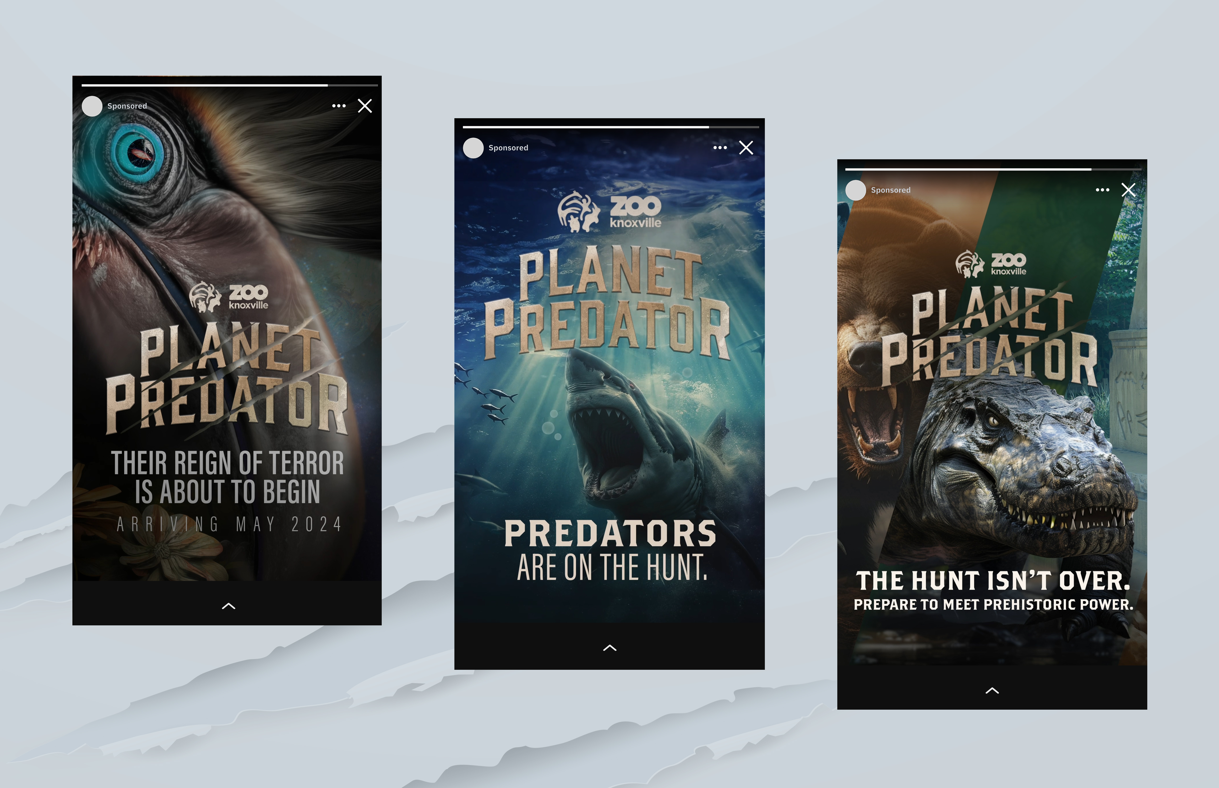 The Planet Predator campaign for Zoo Knoxville introduced and branded a limited-time exhibit celebrating the most fearsome apex predators to ever walk, swim, or fly the Earth. From saber-toothed cats to the mighty megalodon, the campaign invited audiences to come face-to-face with nature’s most efficient hunters—past and present.