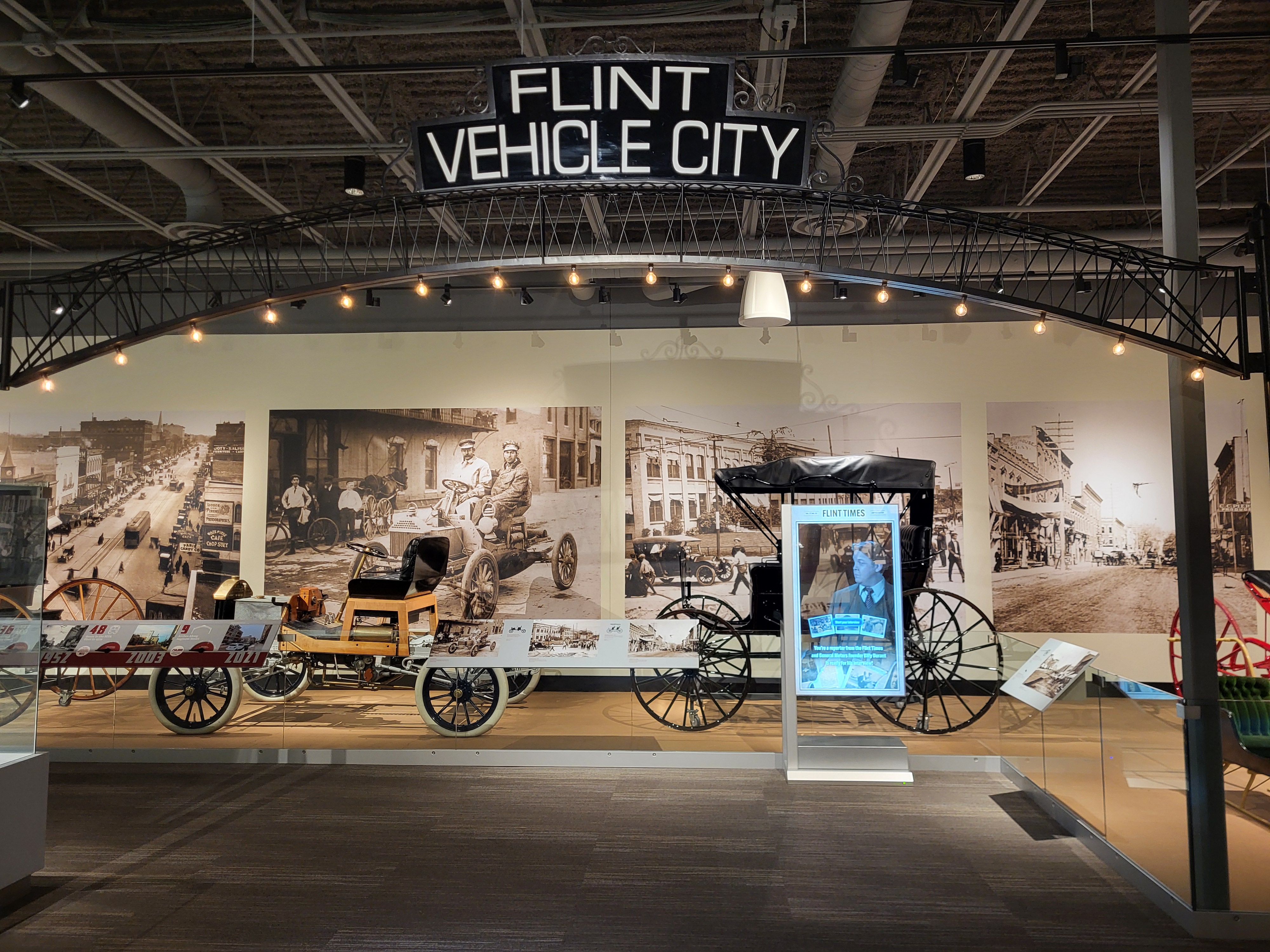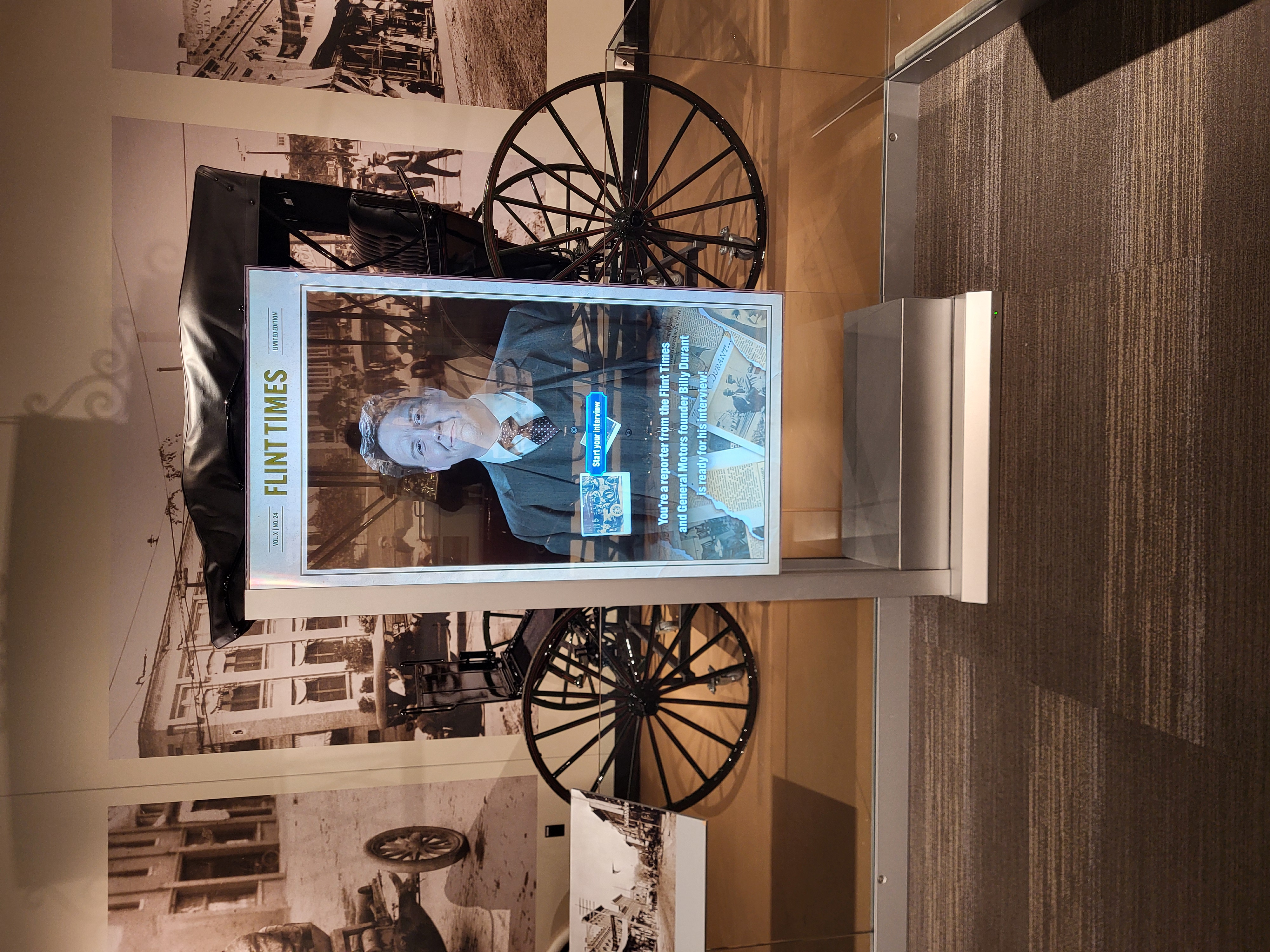 This exhibit brings the cars and carriages in this gallery to life by connecting them to a human story. Visitors converse with a historical reenactor on a transparent OLED screen on topics from Flint’s evolution into an industrial hub to the challenges and triumphs of Durant’s career.