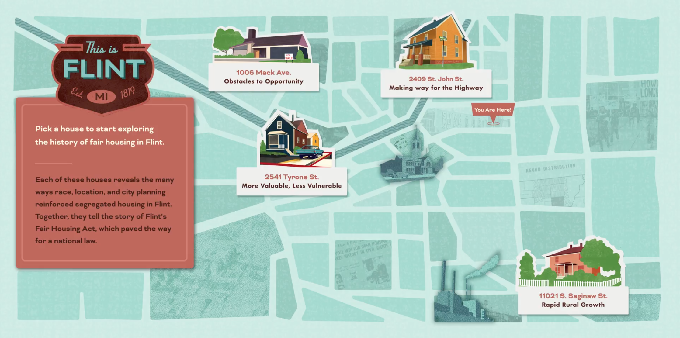 Flint was one of the first US cities to outlaw restrictive housing laws. This touchscreen interactive situates visitors in neighborhoods affected by these laws and their legacy.
